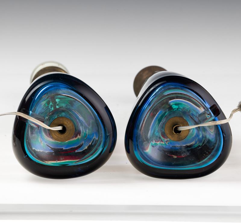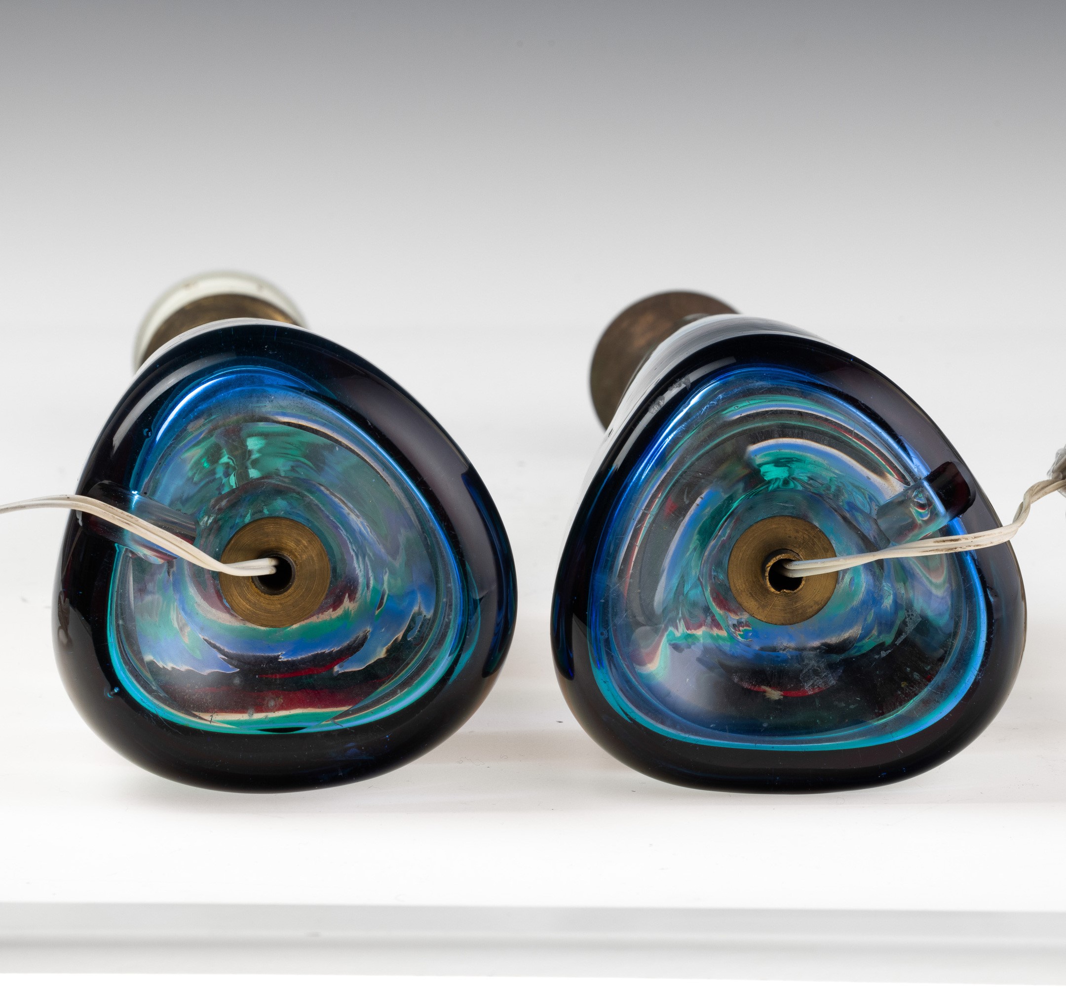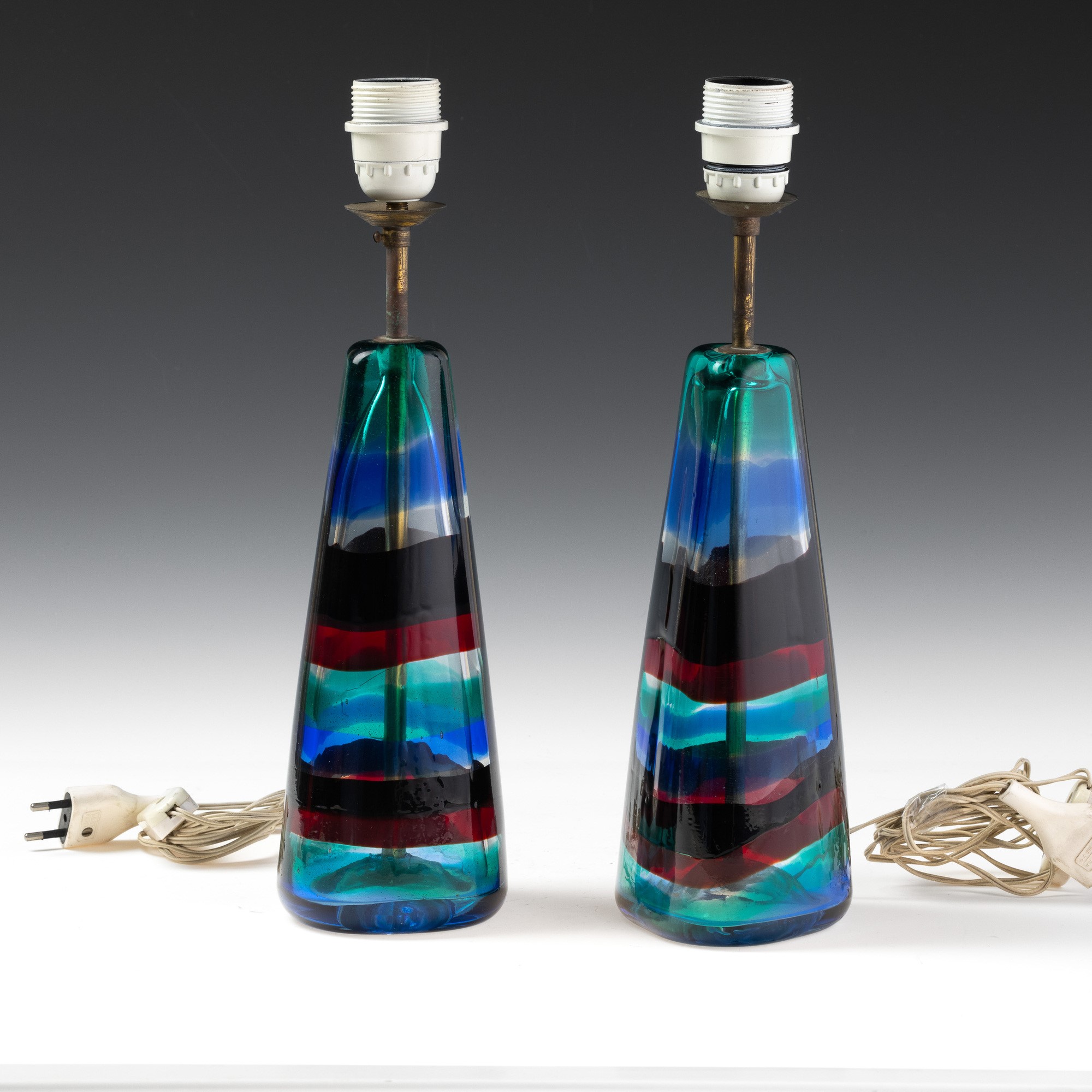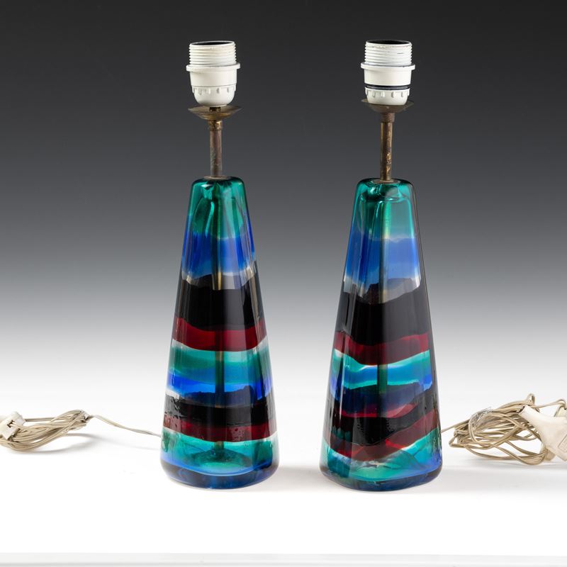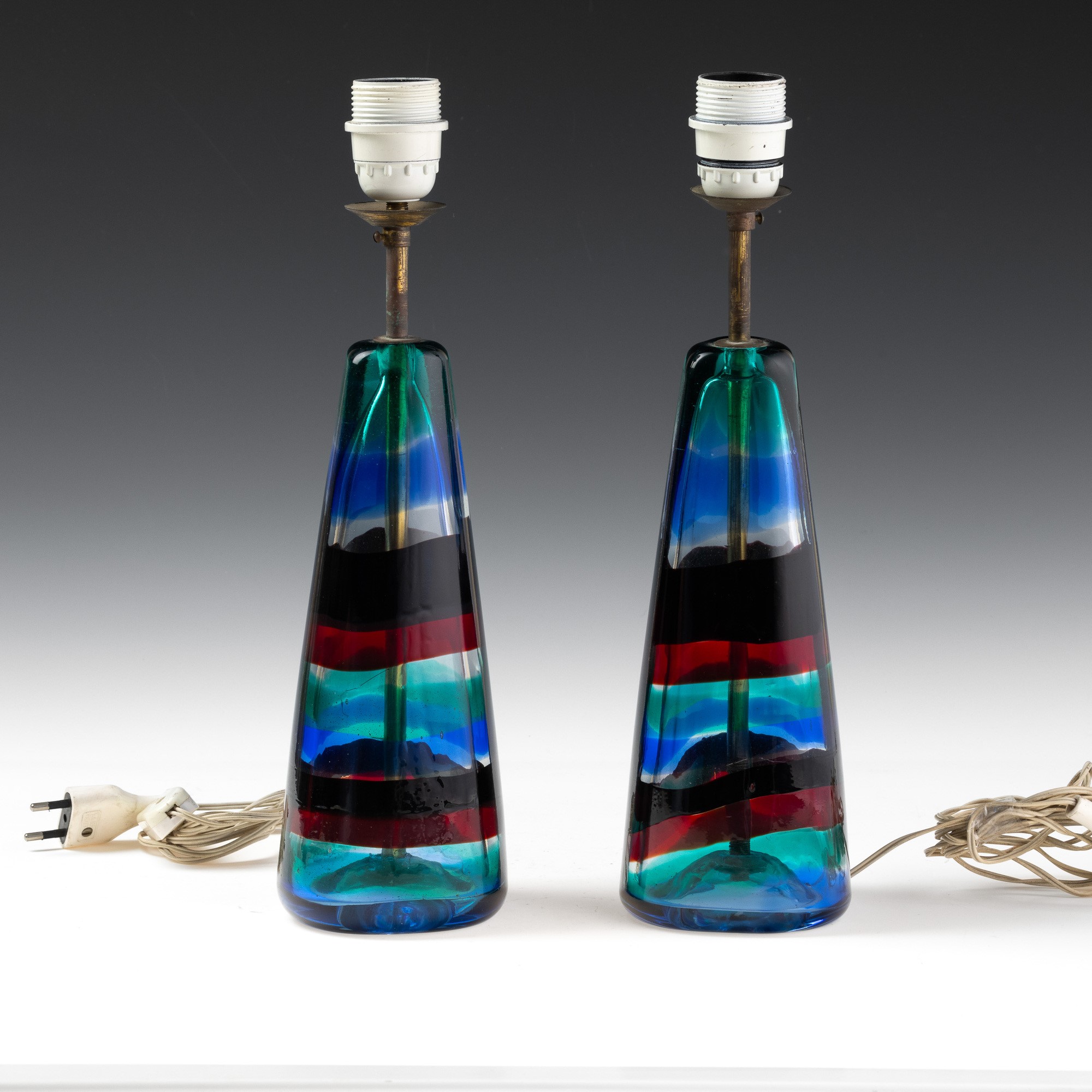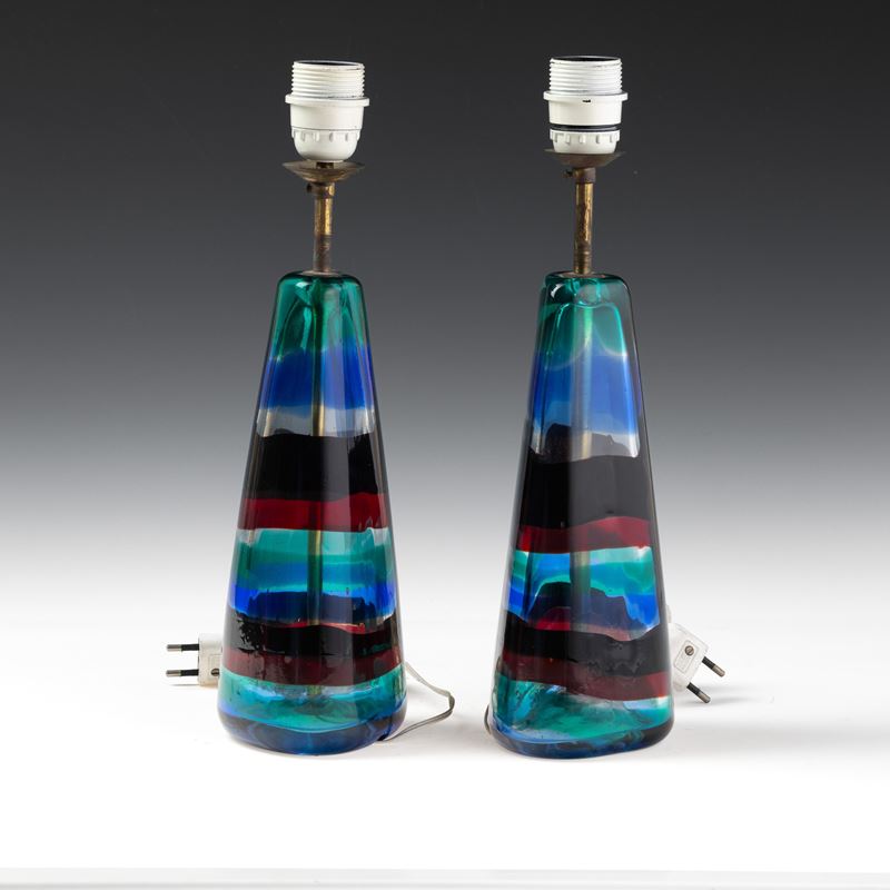 Rara coppia di basi di lampade troncopiramidali a sezione triangolare in vetro pesante con decoro di fasce sommerse policrome.