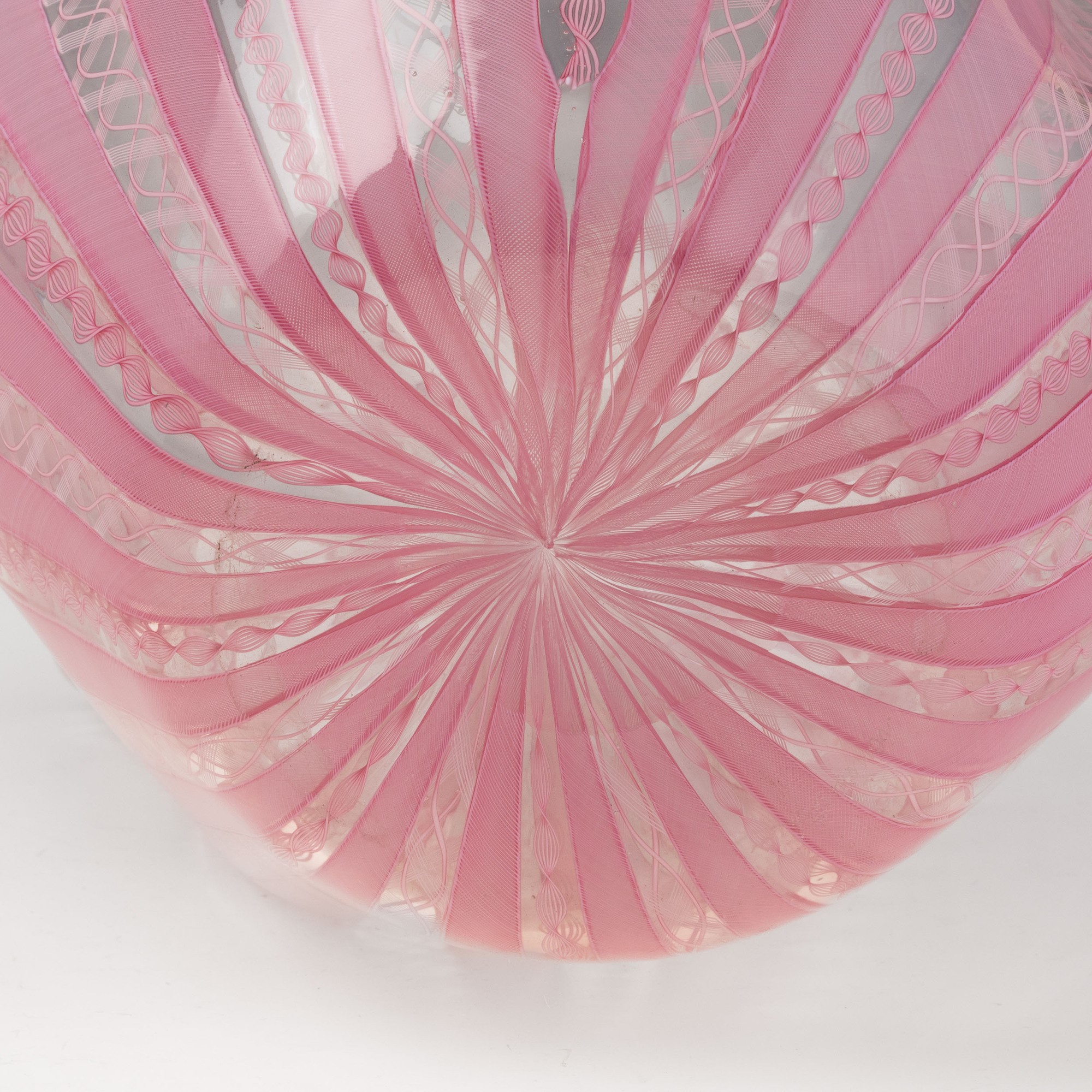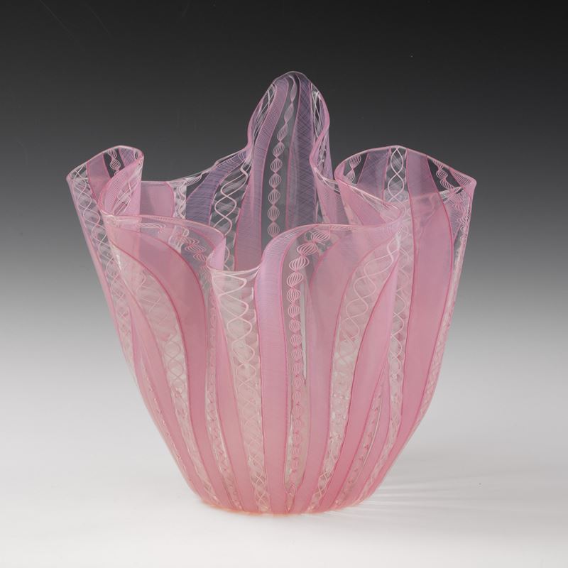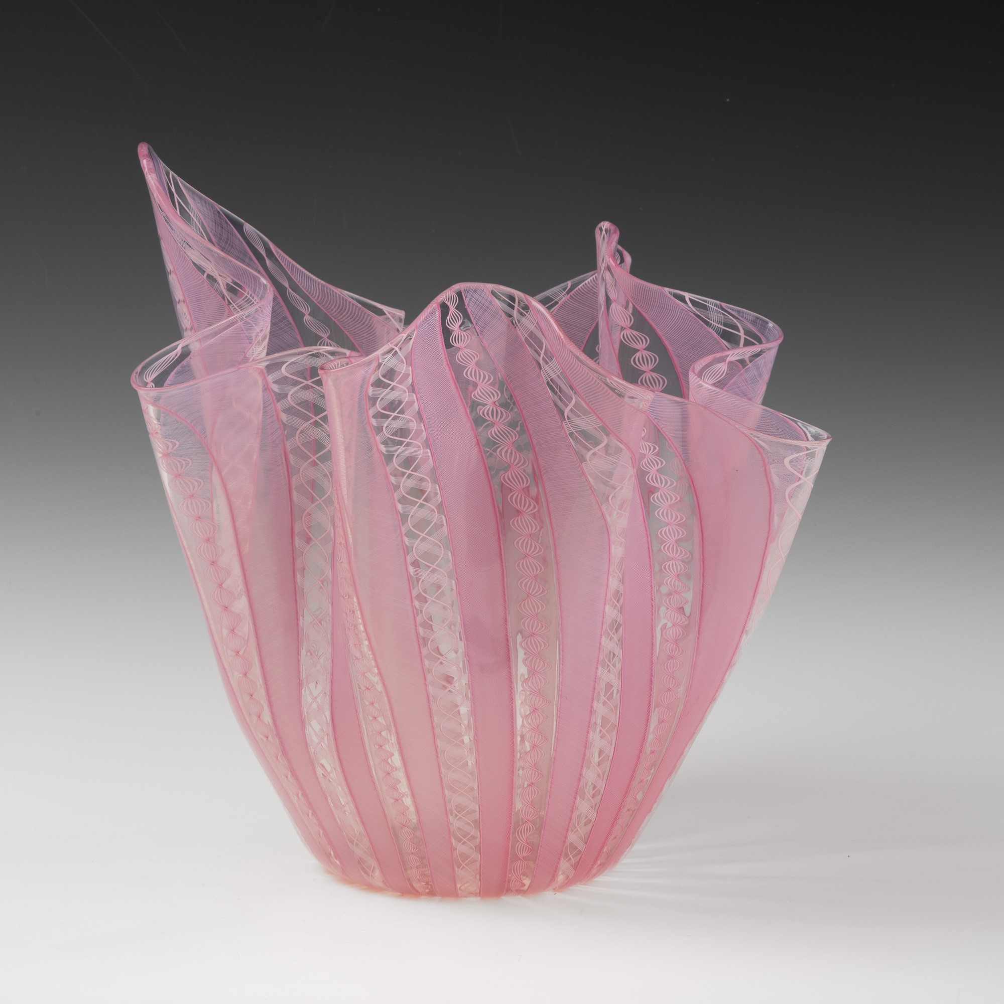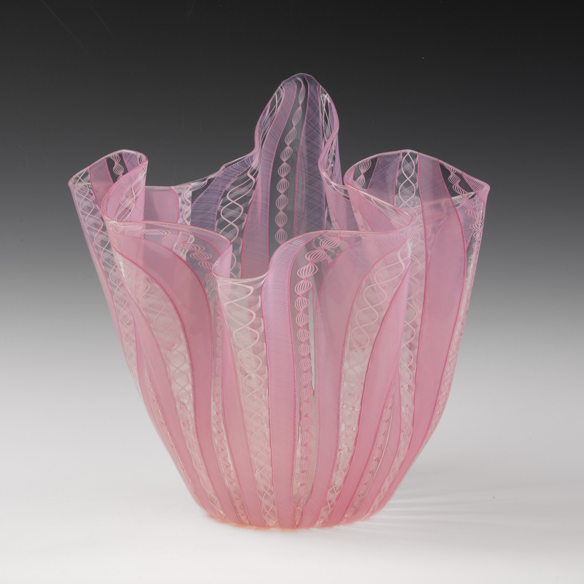 Grande vaso a Fazzoletto in vetro soffiato con decoro di canne zanfirico e reticello rosa e lattimo.