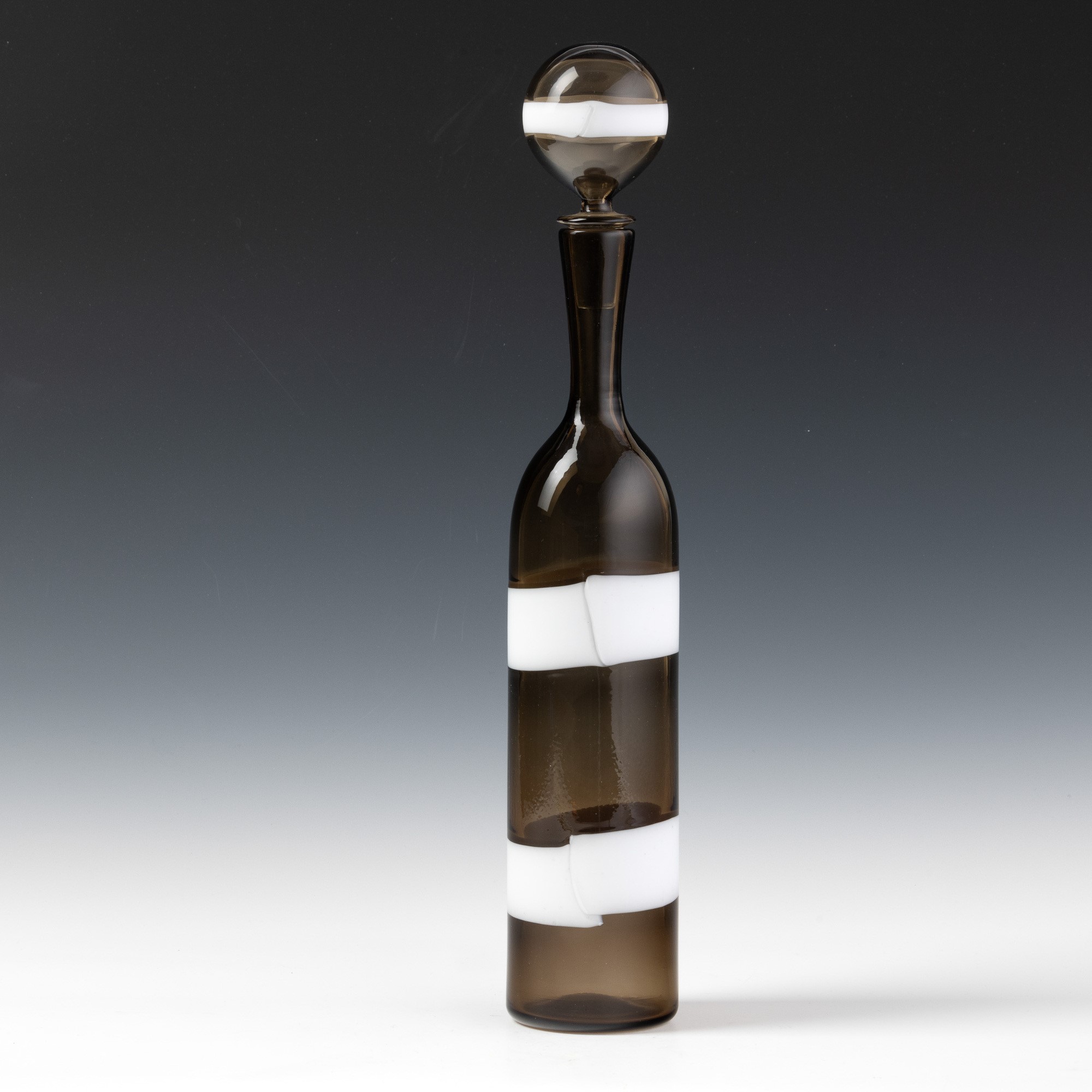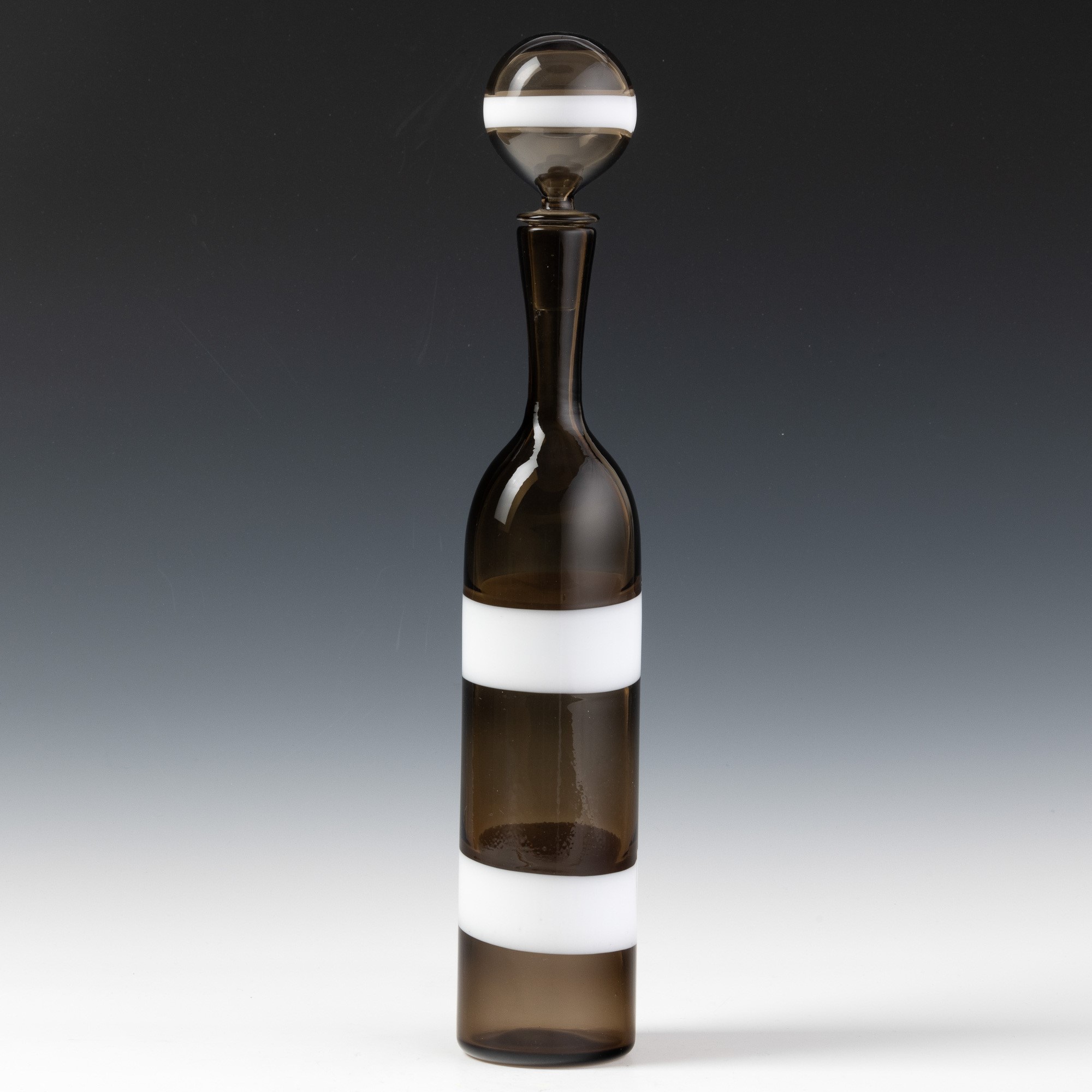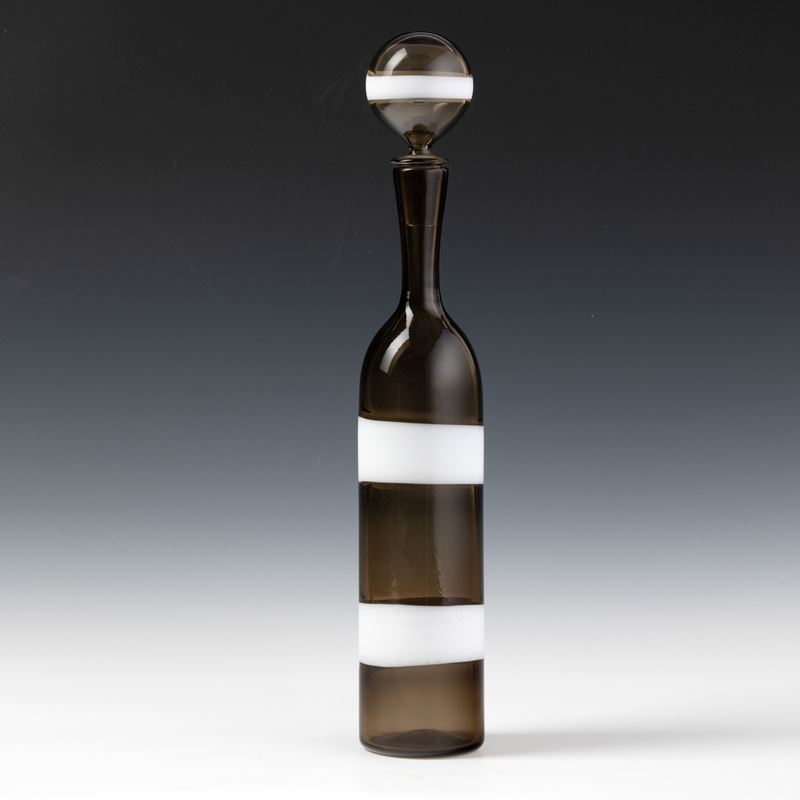Bottiglia con tappo sferico in vetro soffiato talpa e fasce lattimo.