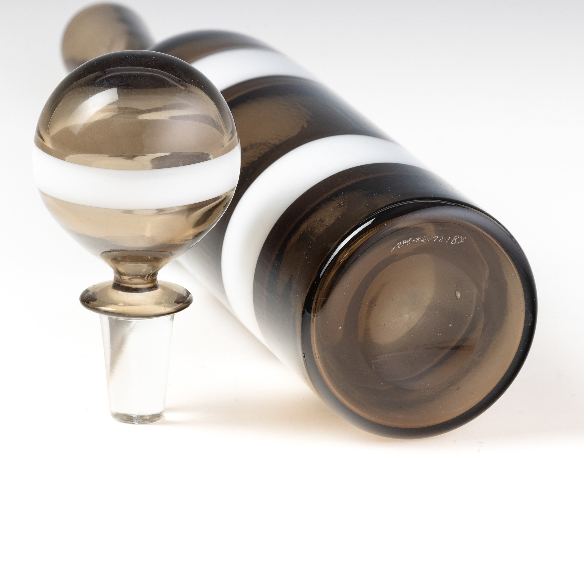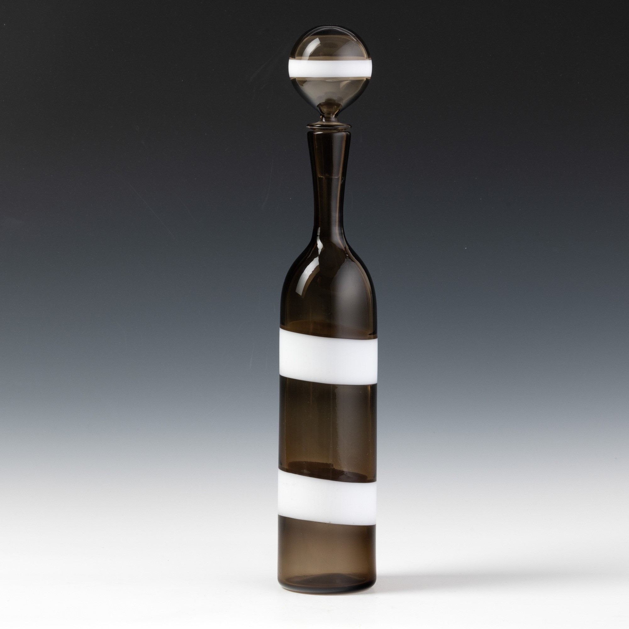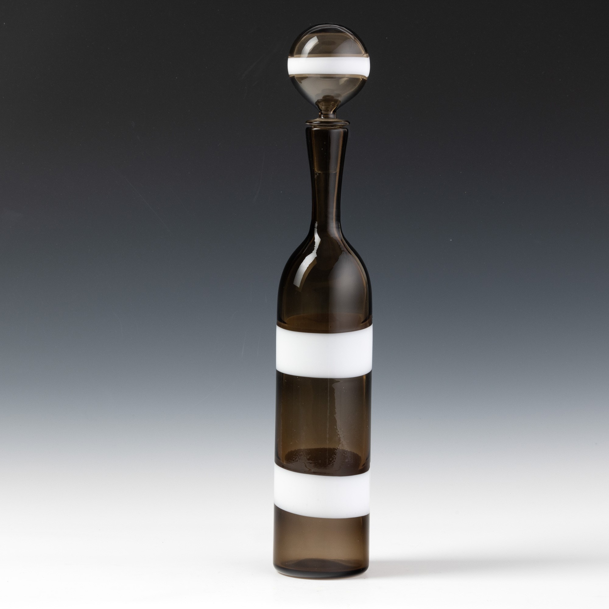 Bottiglia con tappo sferico in vetro soffiato talpa e fasce lattimo.