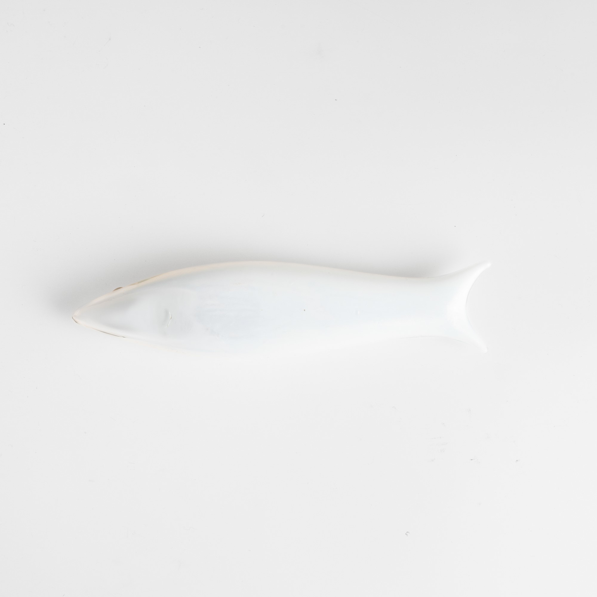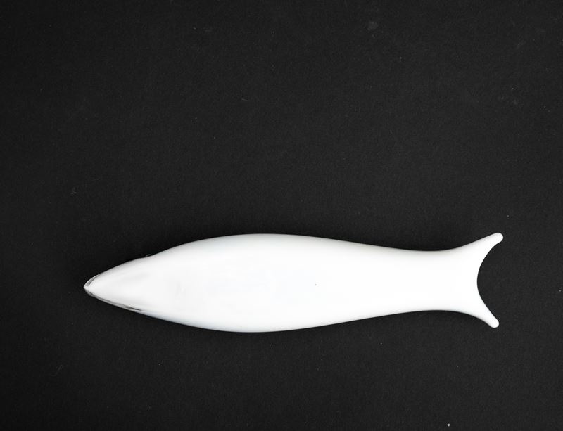 Soprammobile in forma di pesce in vetro lattimo con decoro di canne alternate acquamare e grigio talpa.