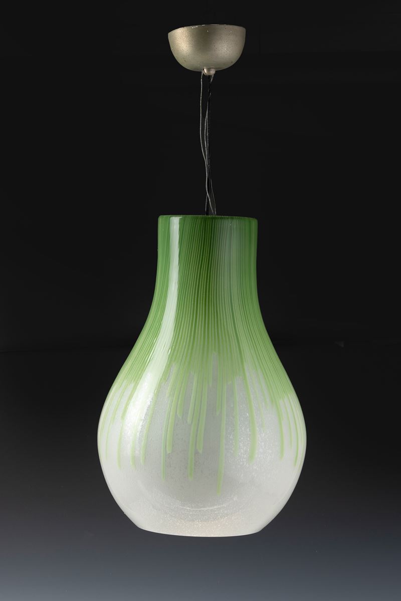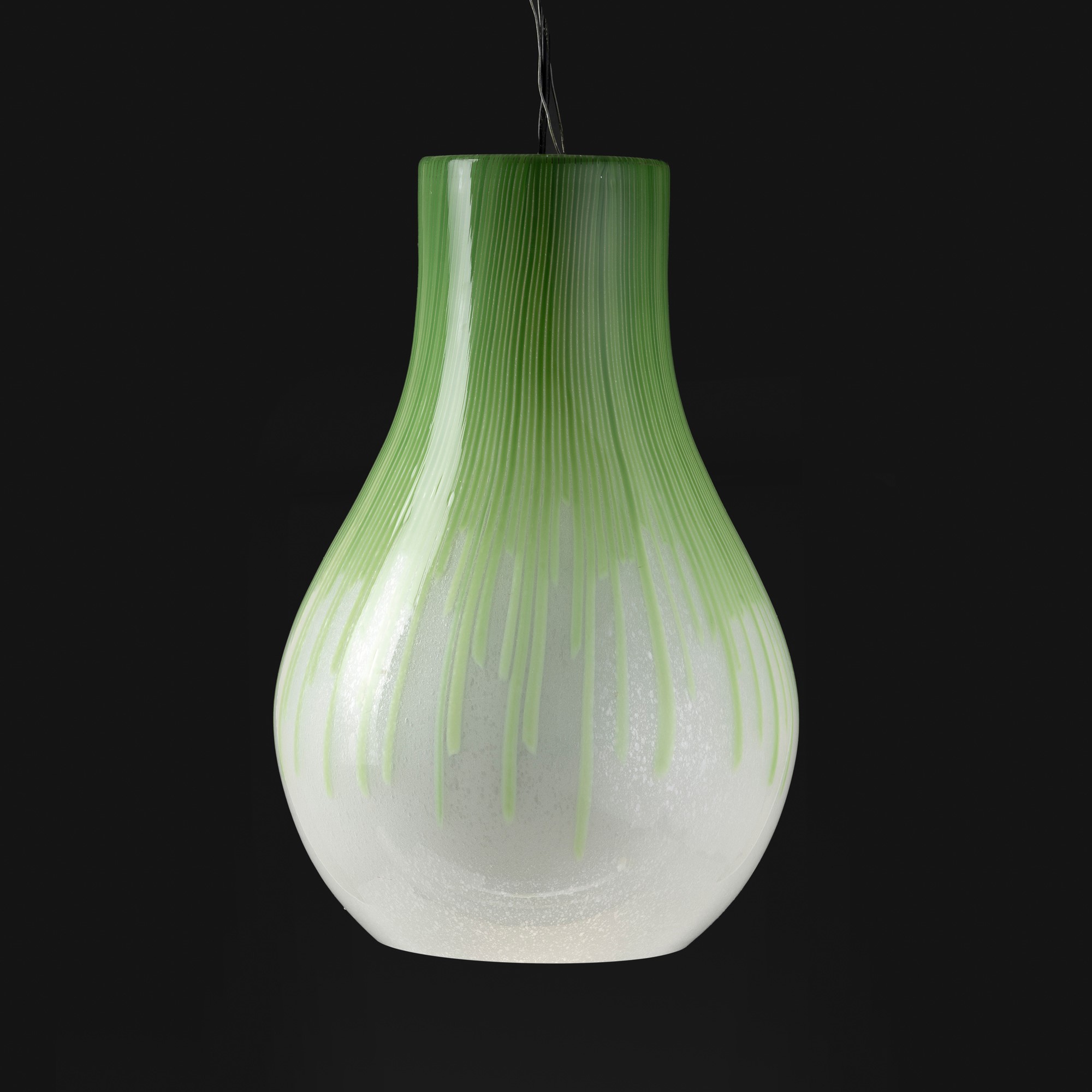 Lampada a sospensione serie Cannette in forma di goccia in vetro pulegoso con decoro di canne verticali verdi.