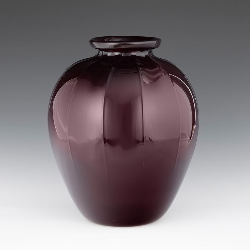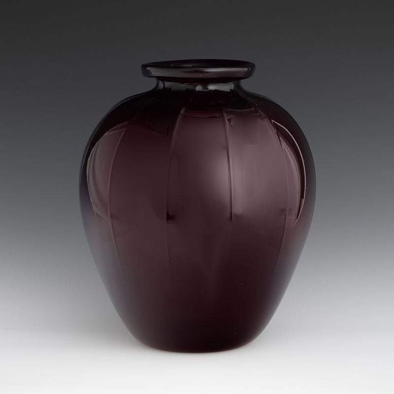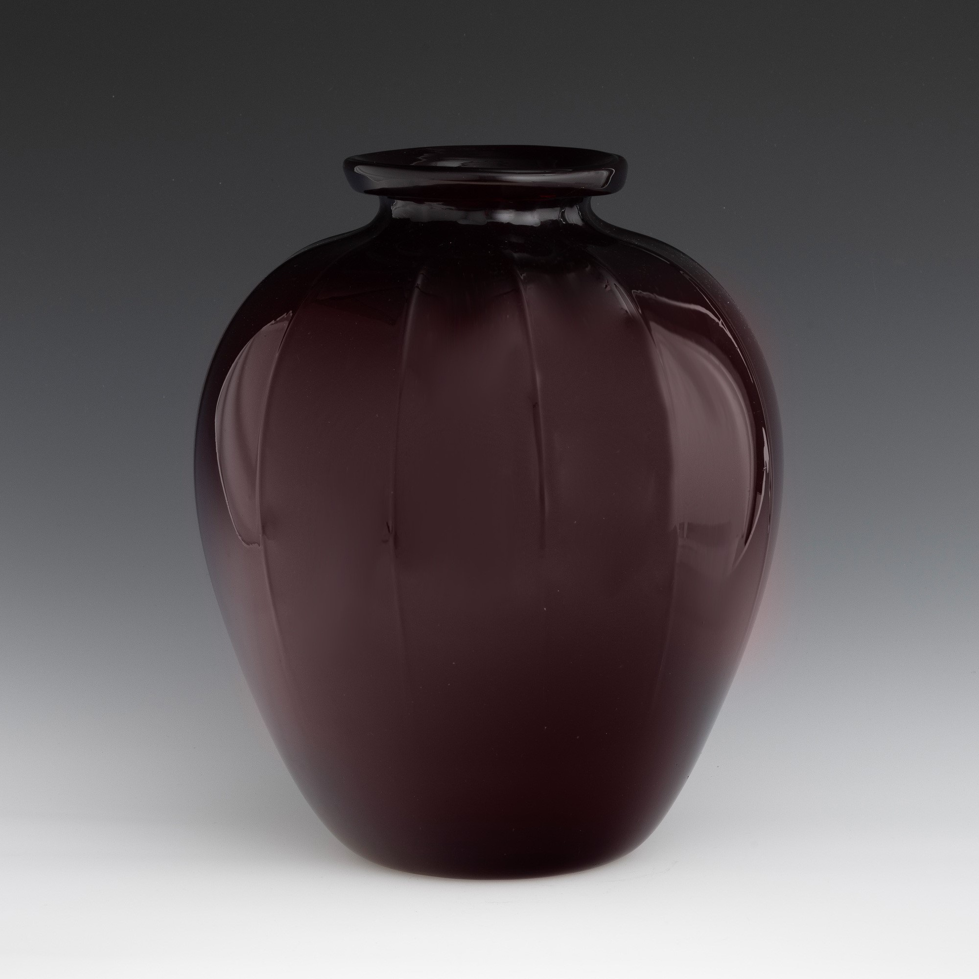 Grande vaso a uovo in vetro soffiato rosso scuro a larghe costolature e collo applicato.