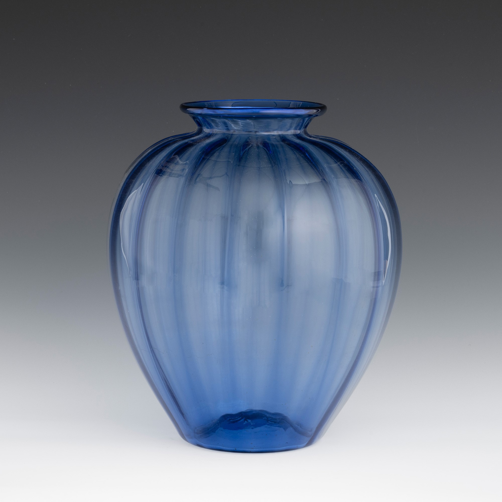 Grande vaso a uovo in vetro soffiato bluino a leggere costolature e collo applicato.