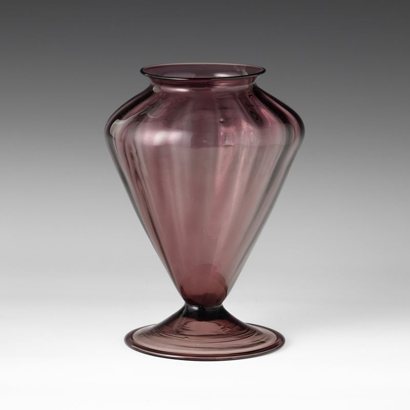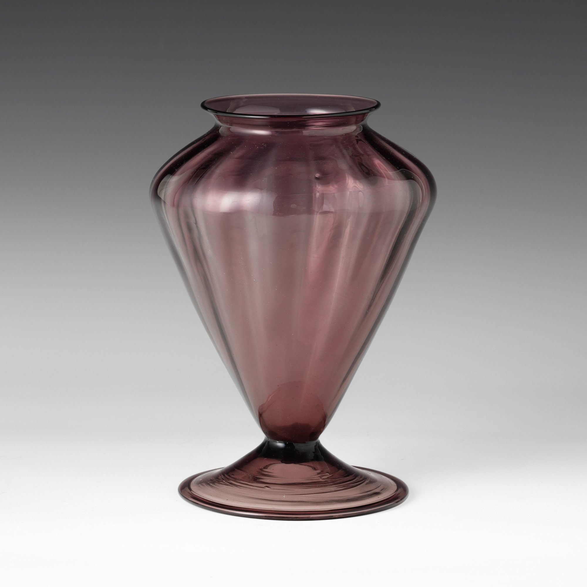 Vaso a balaustro in vetro soffiato ametista a costolature su piede circolare.