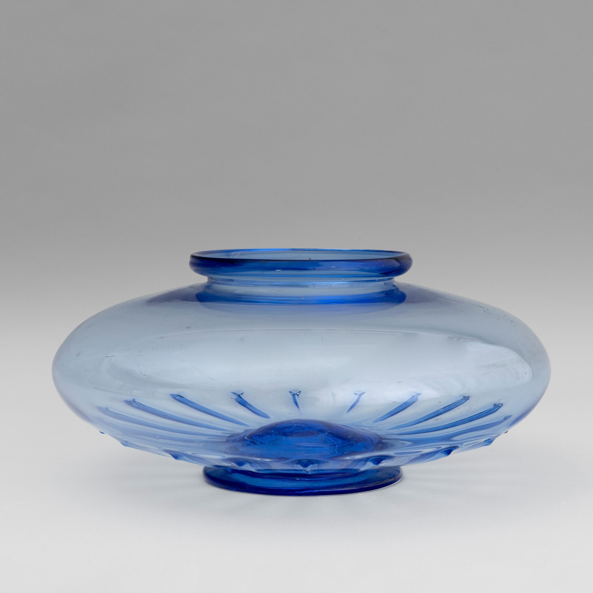 Vaso a sfera schiacciata in vetro soffiato bluino con piede e gocce applicati a caldo.