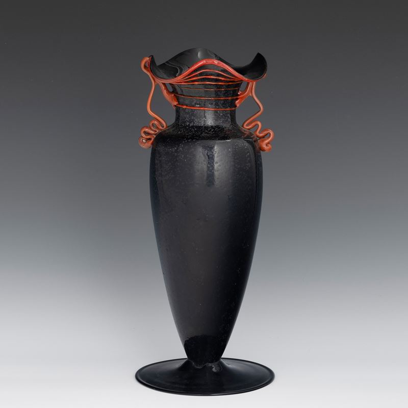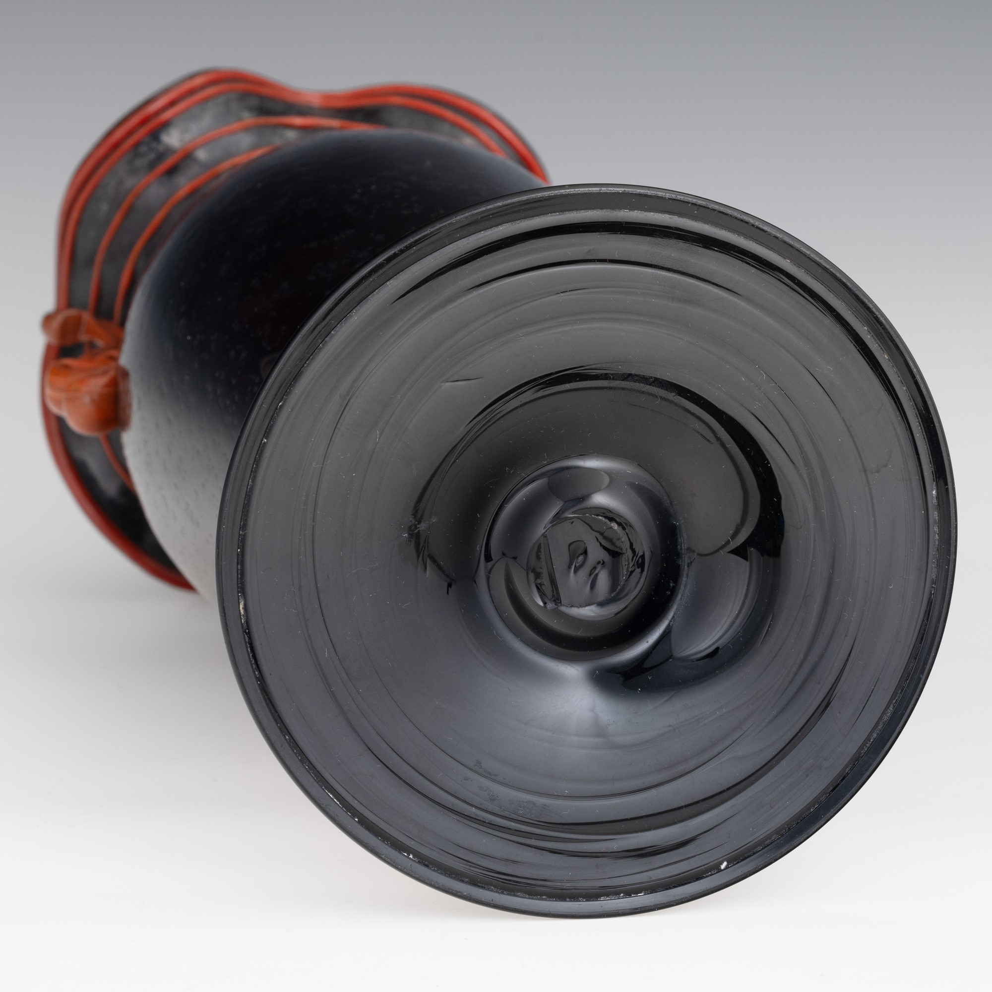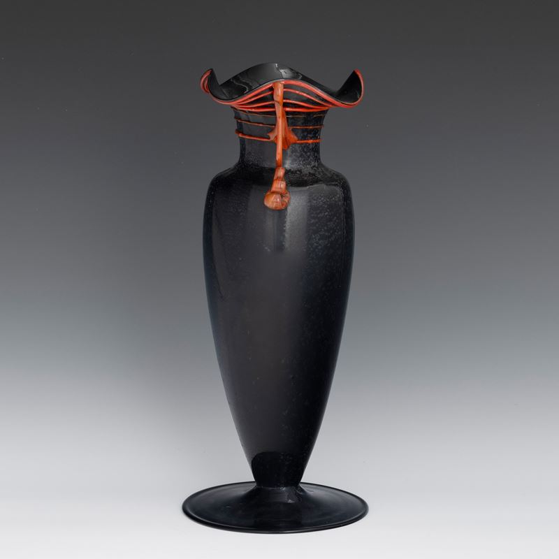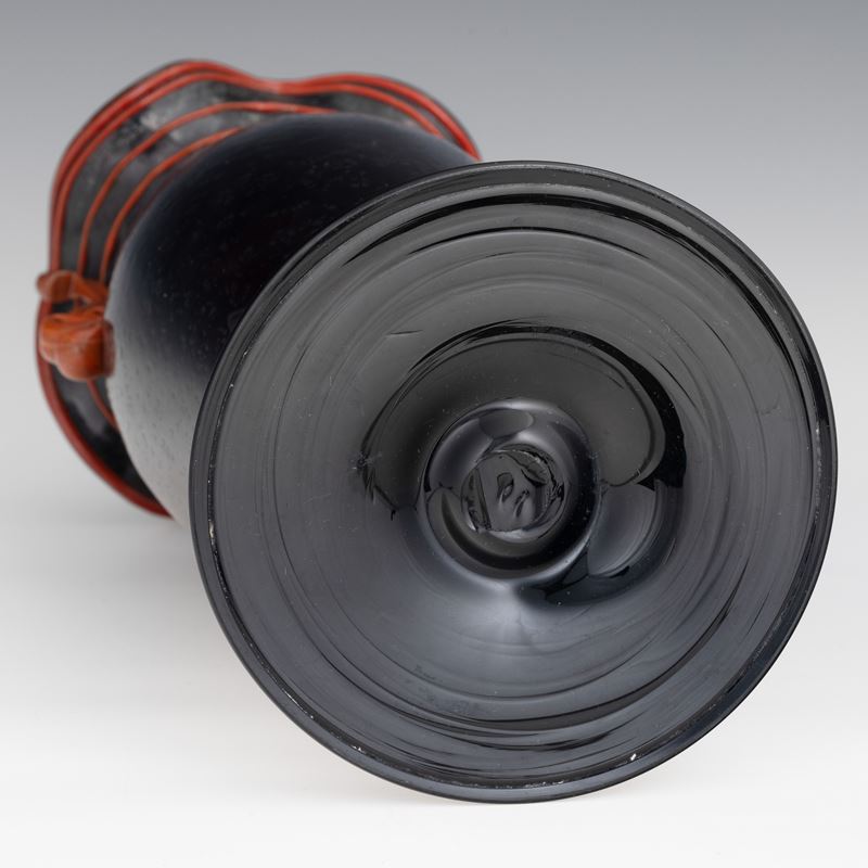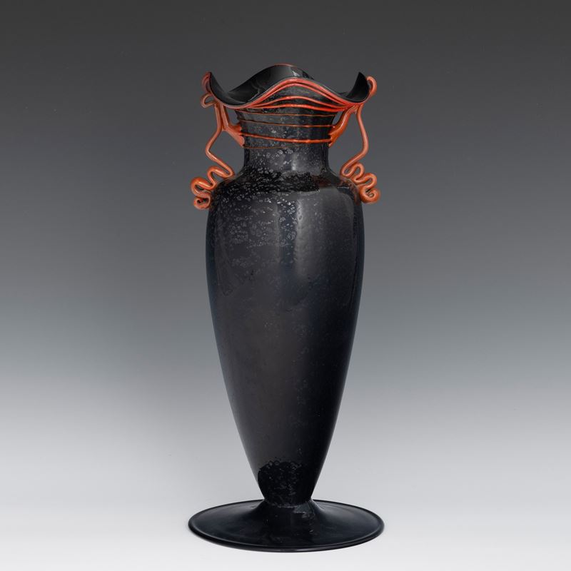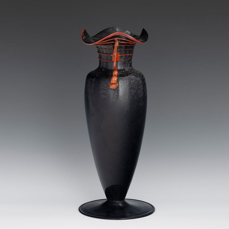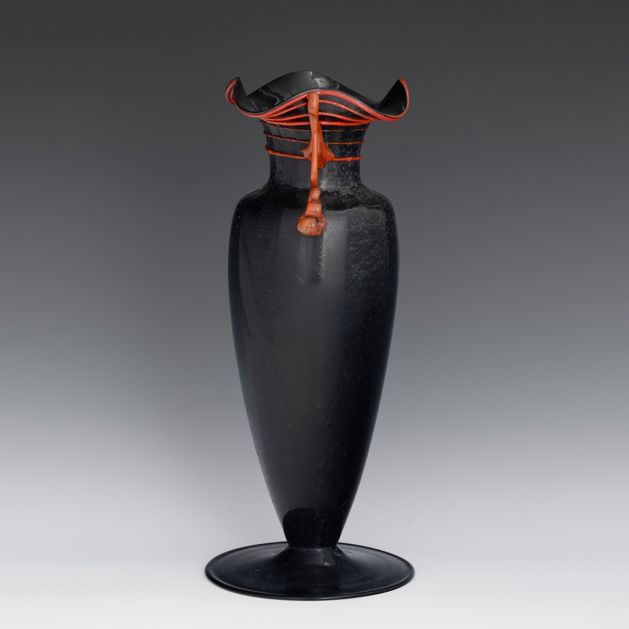 Vaso a goccia rovesciata su piede circolare e collo sagomato in vetro soffiato ciclamino con decoro di foglia argento.