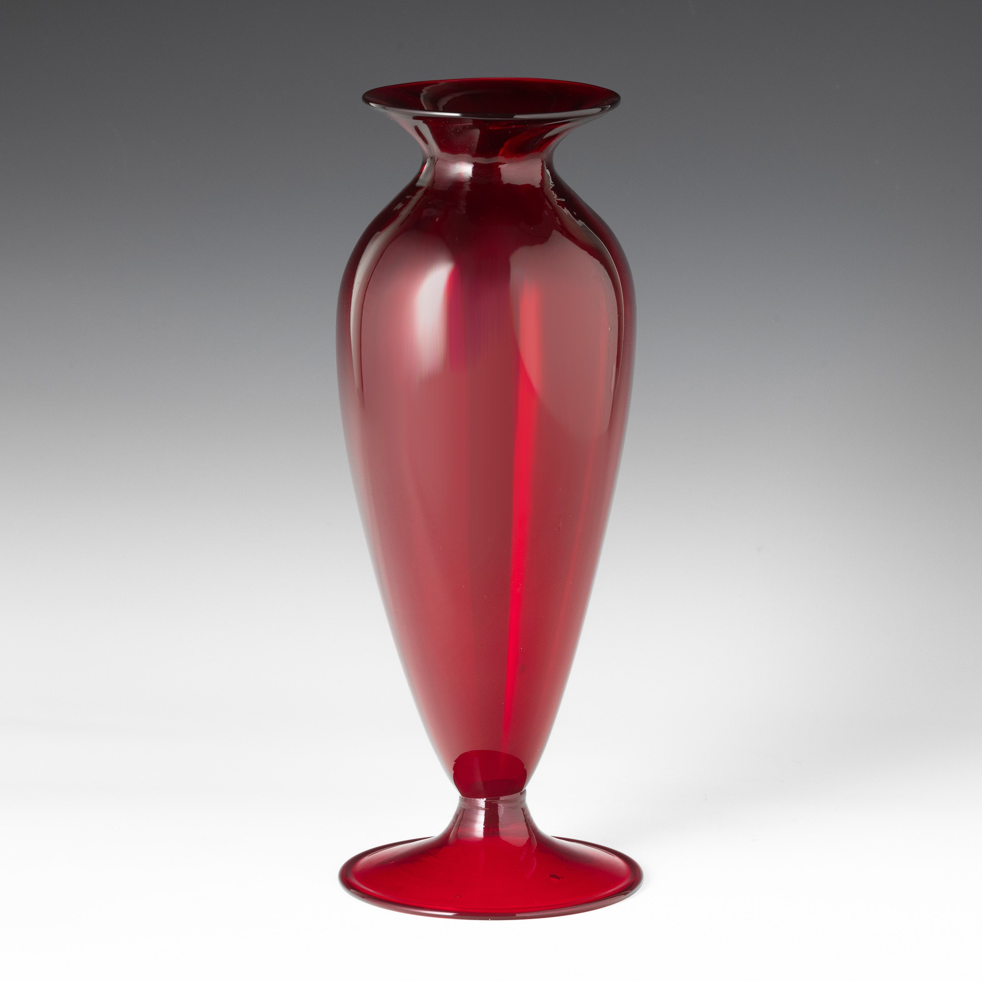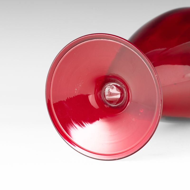 Vaso a balaustro in vetro soffiato rosso su piede circolare.