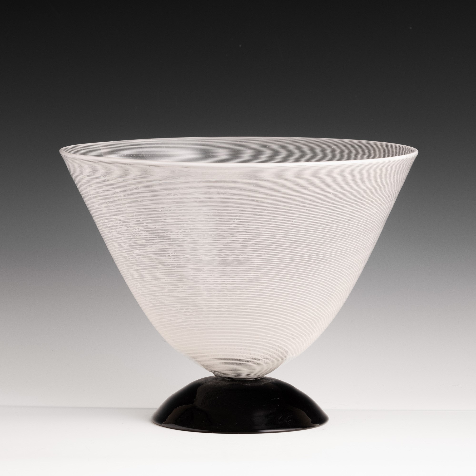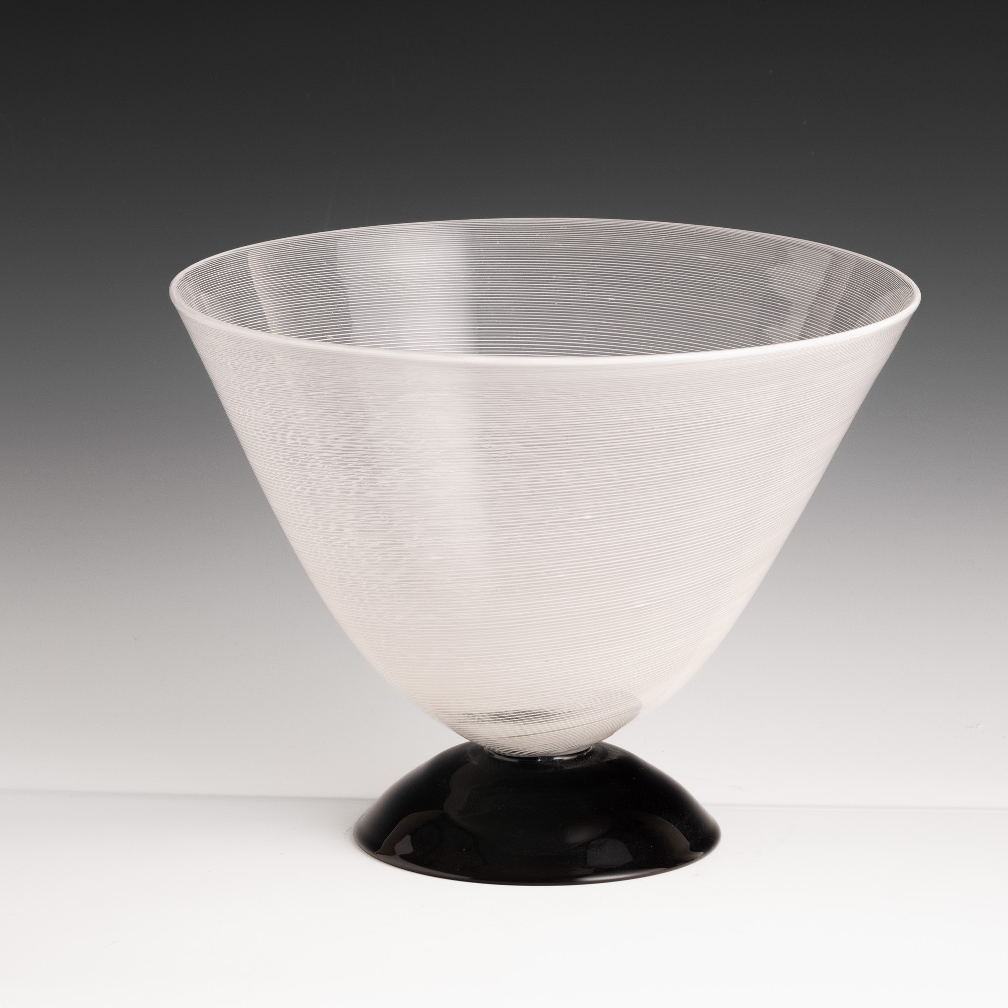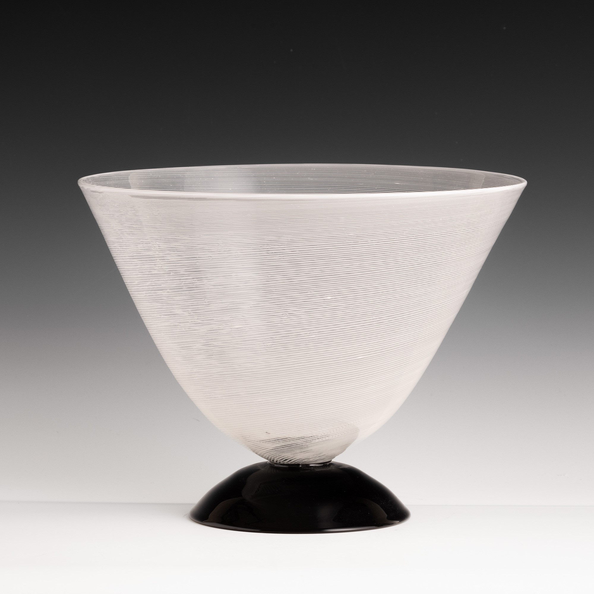 Coppa in vetro soffiato a mezza filigrana su piede semisferico in pasta vitrea nera.