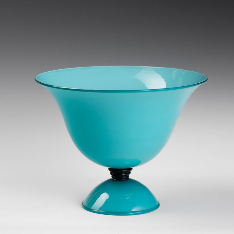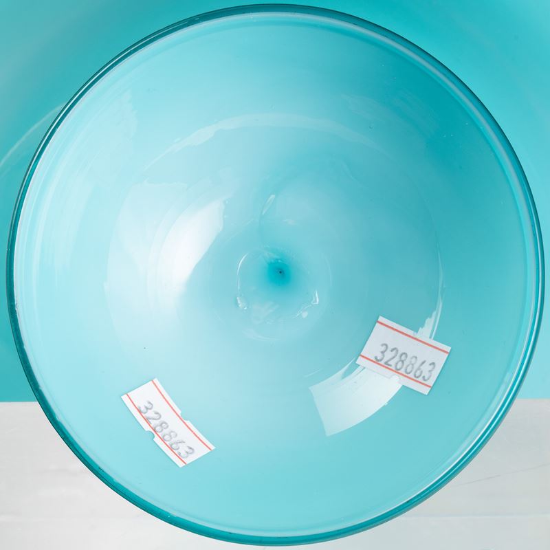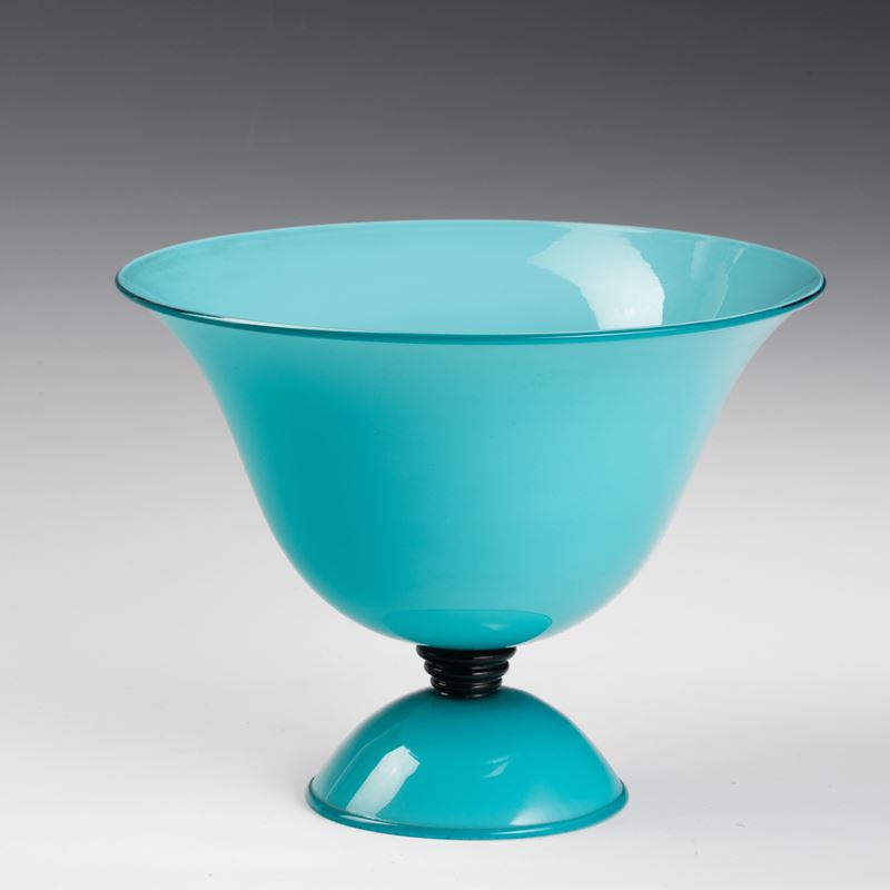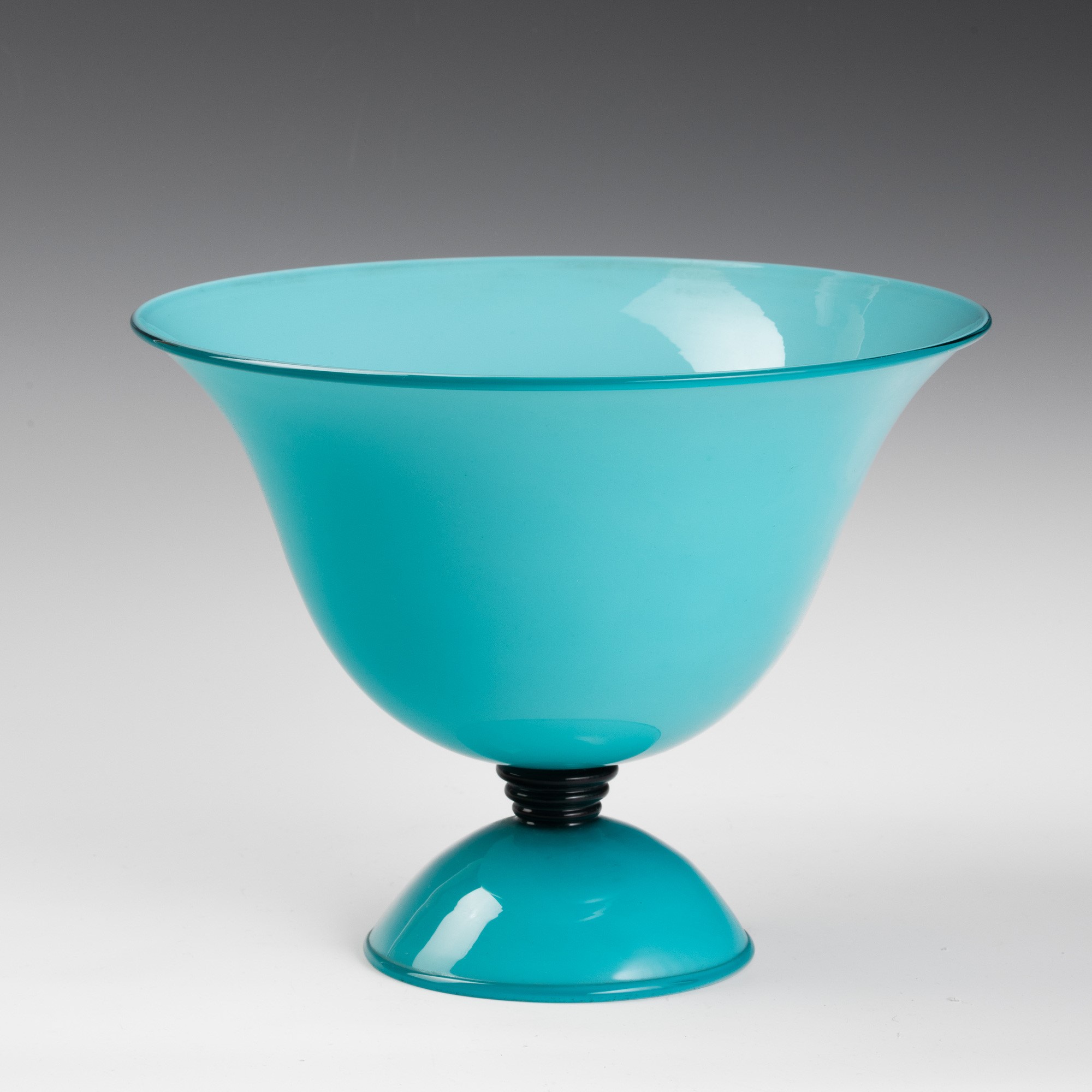 Coppa su piede semisferico in vetro soffiato incamiciato turchese. Filo applicato sulla bocca e sul piede.