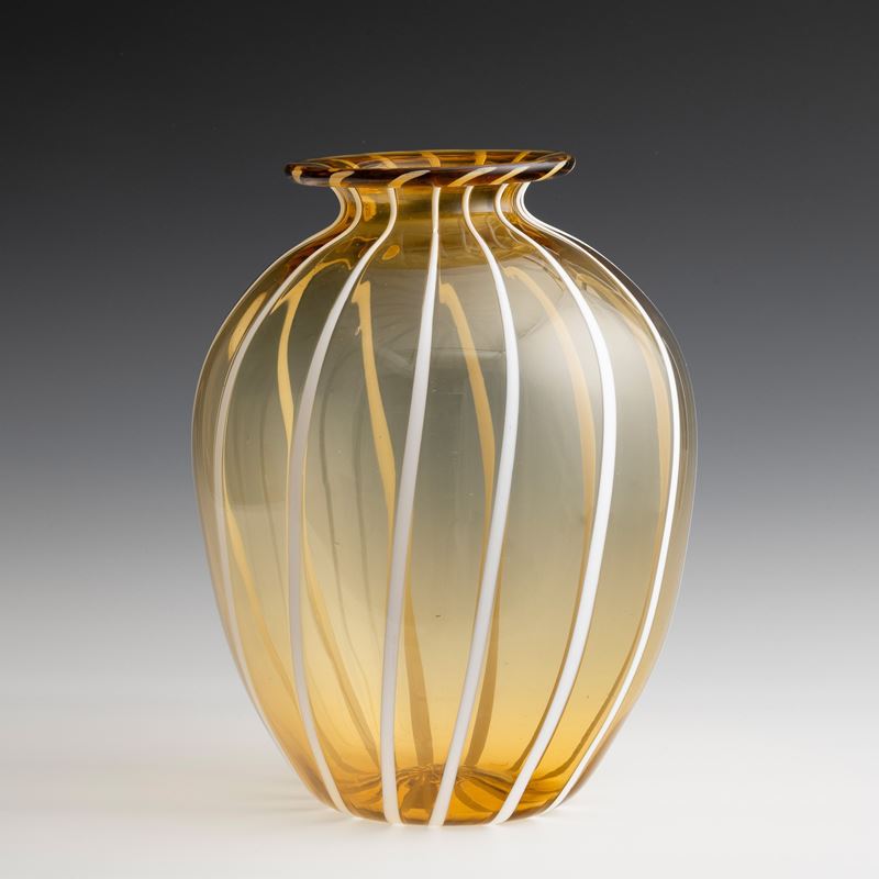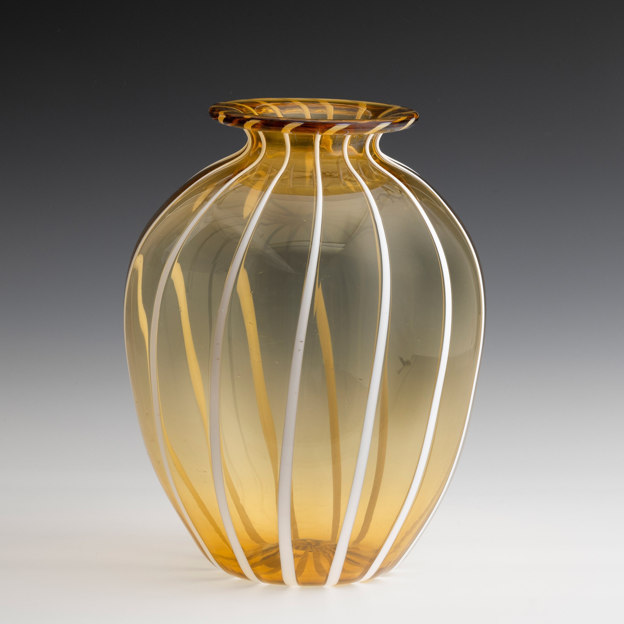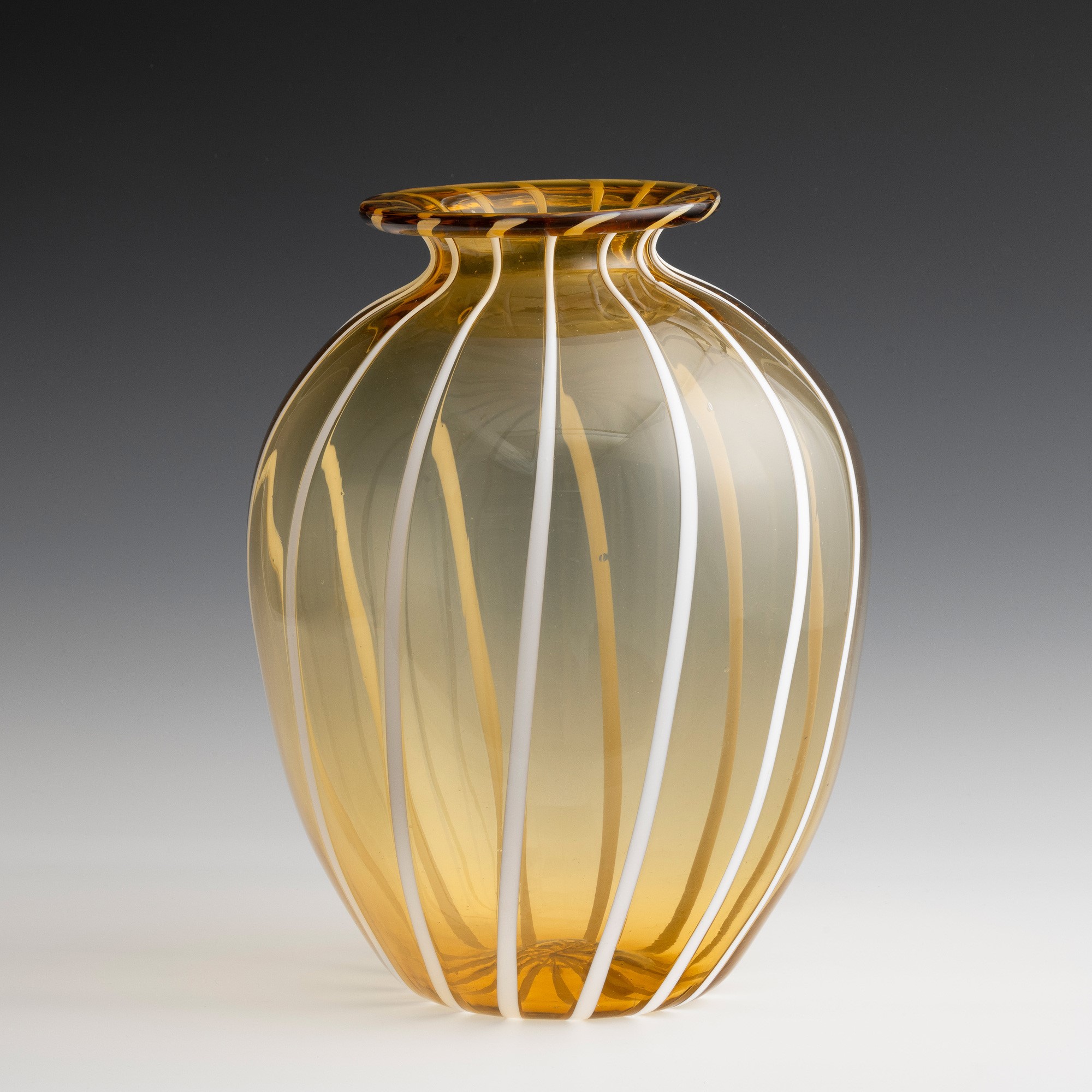 Grande vaso in vetro soffiato pagliesco con decoro di canne lattimo.