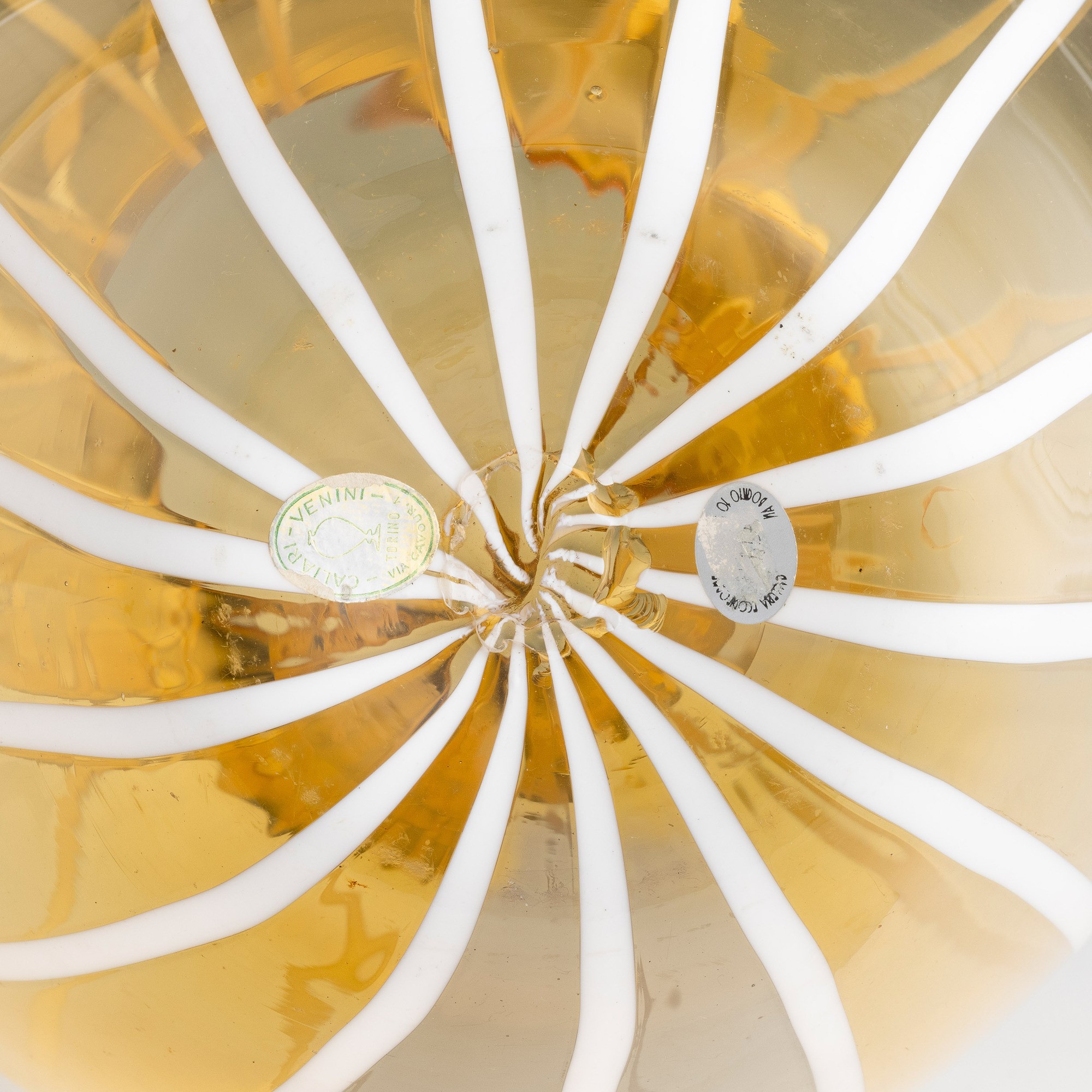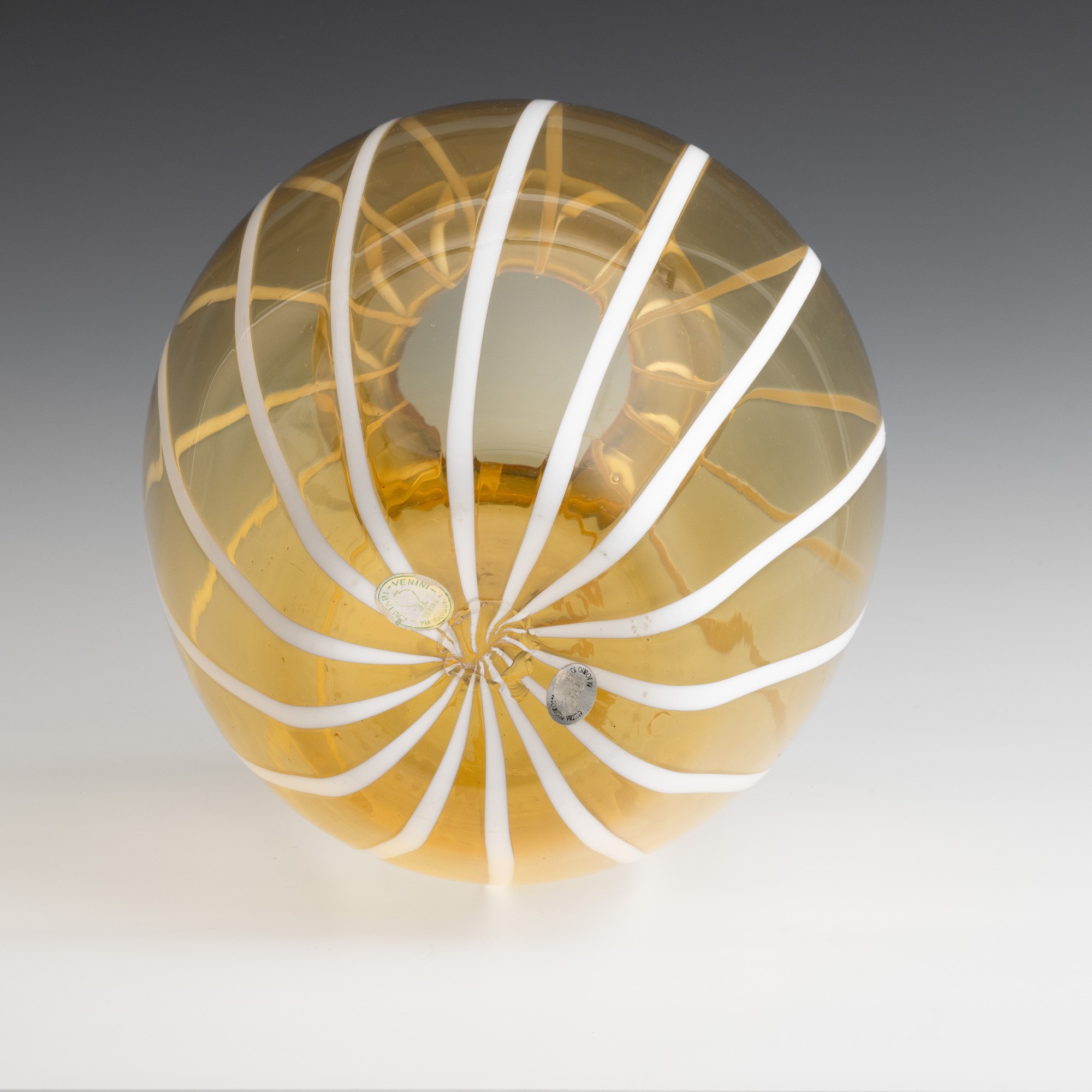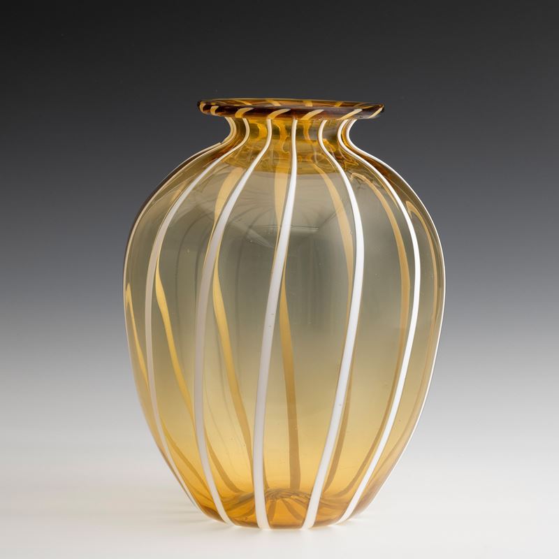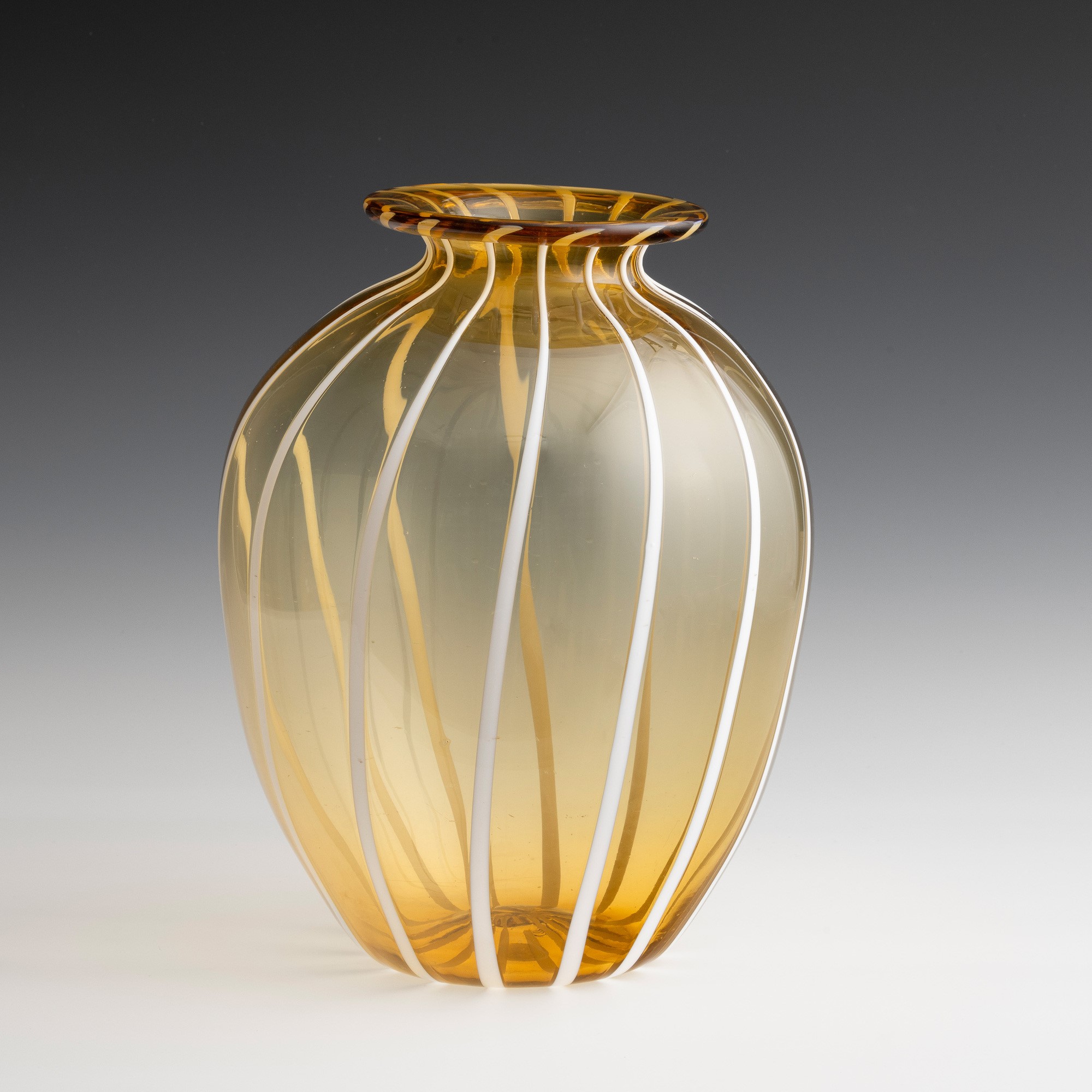 Grande vaso in vetro soffiato pagliesco con decoro di canne lattimo.
