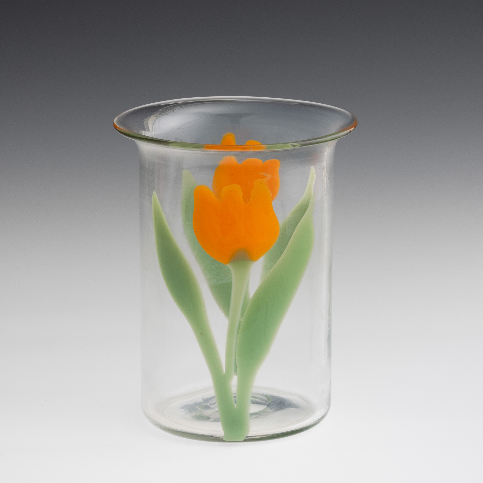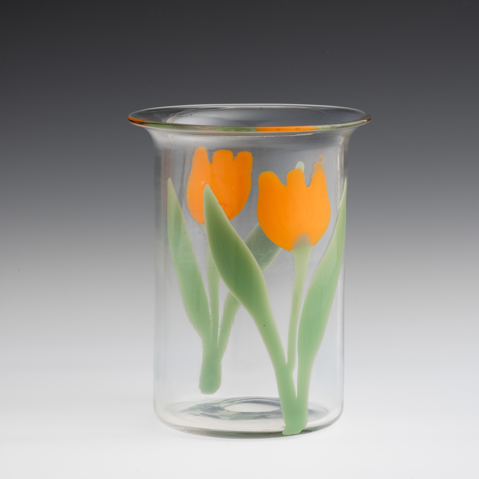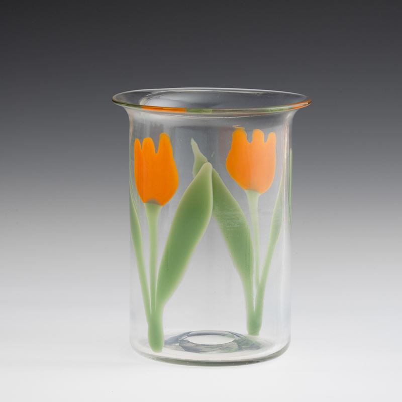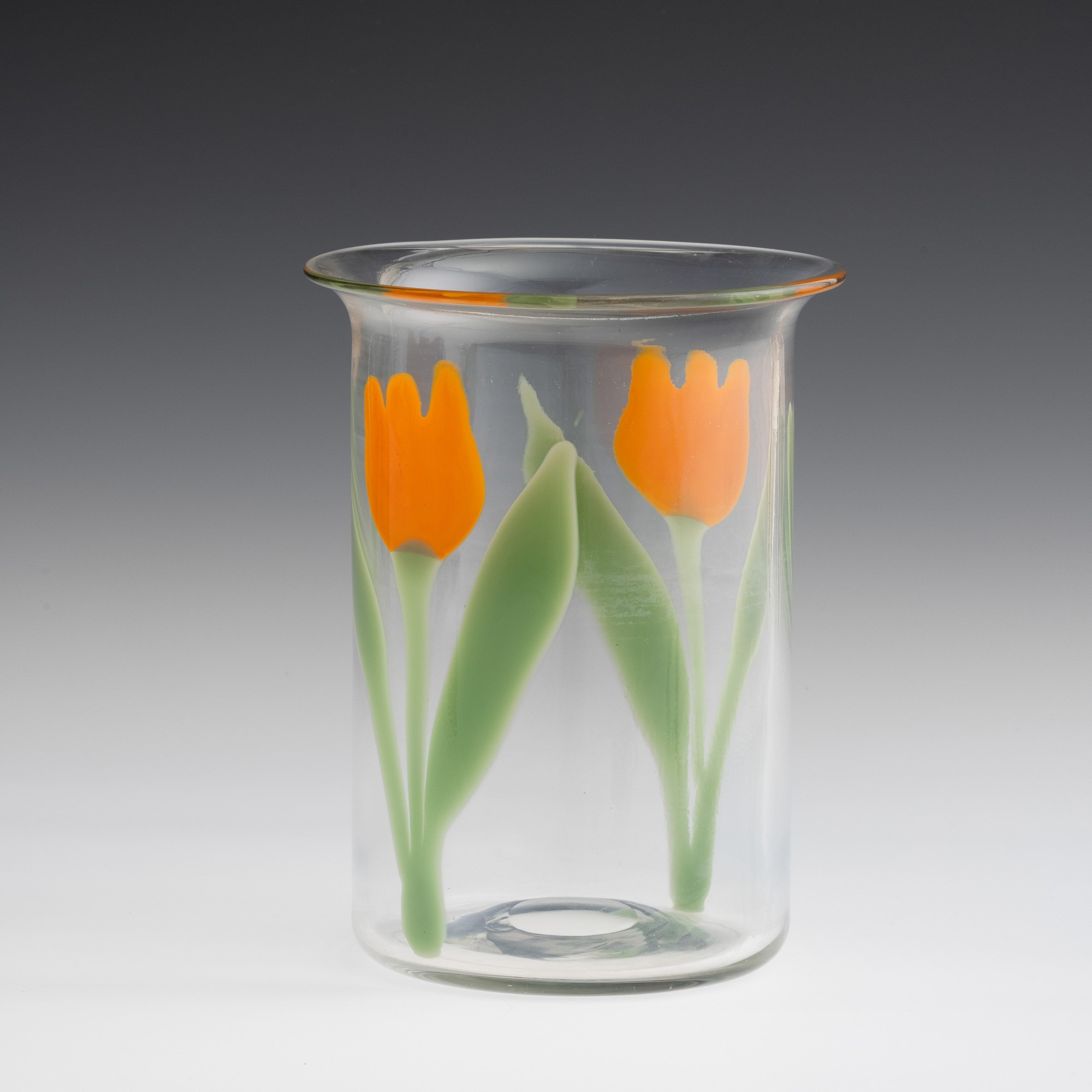 Vaso serie Primavera in vetro soffiato trasparente con decoro di tulipani in paste vitree policrome.