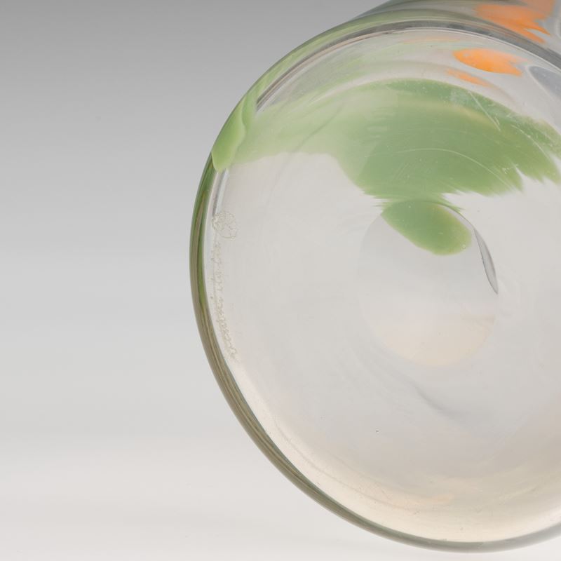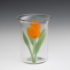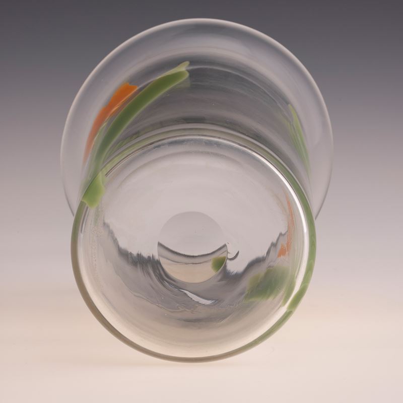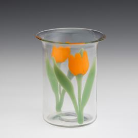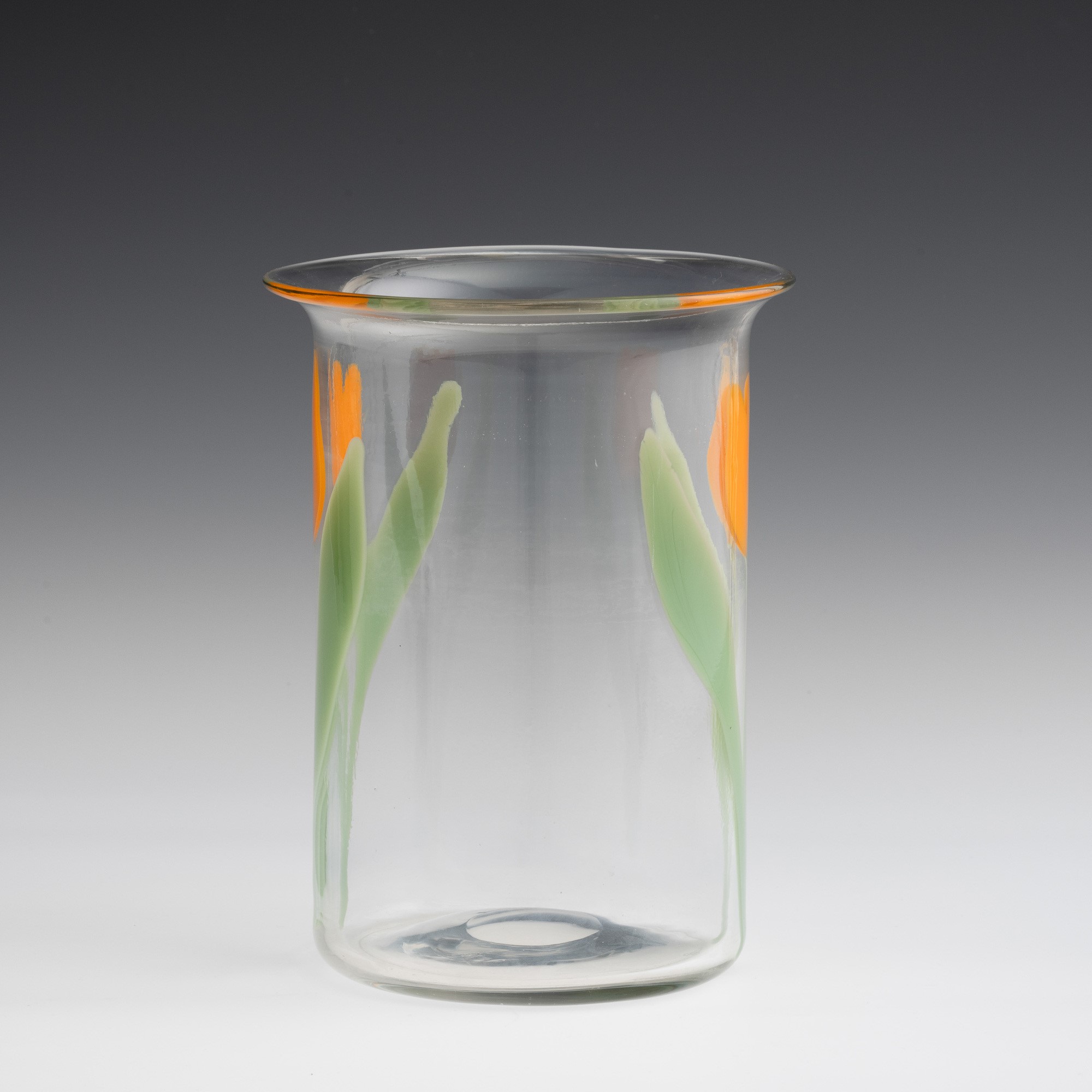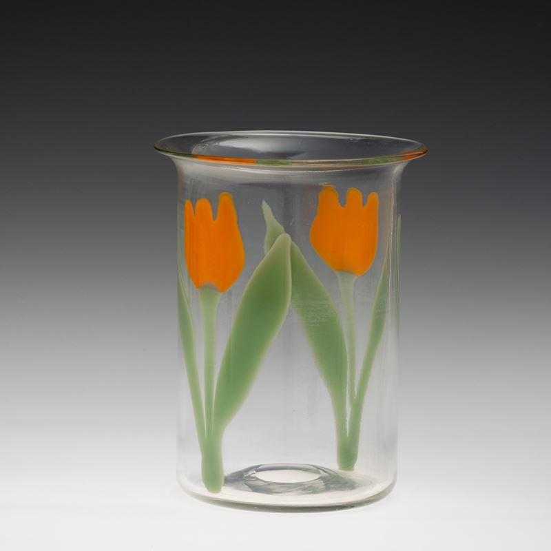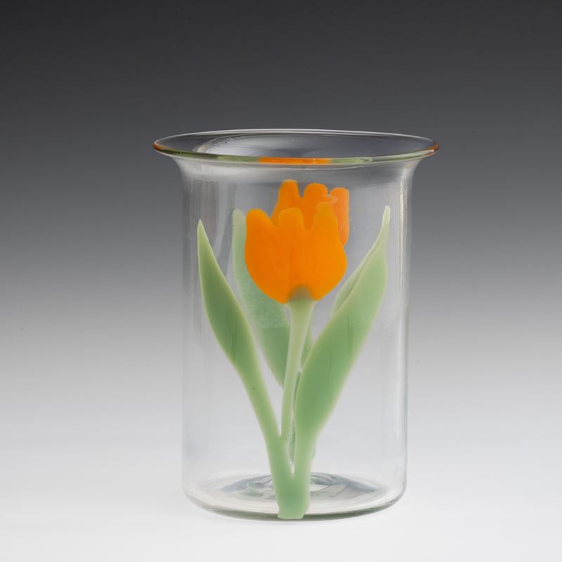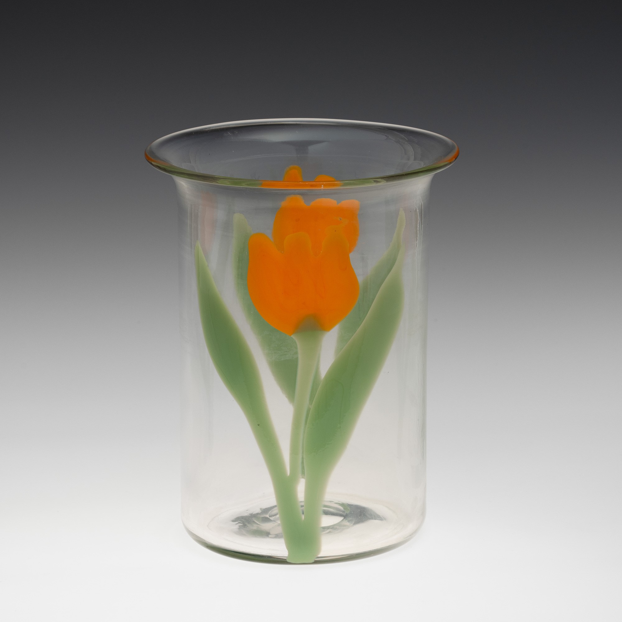Vaso serie Primavera in vetro soffiato trasparente con decoro di tulipani in paste vitree policrome.
