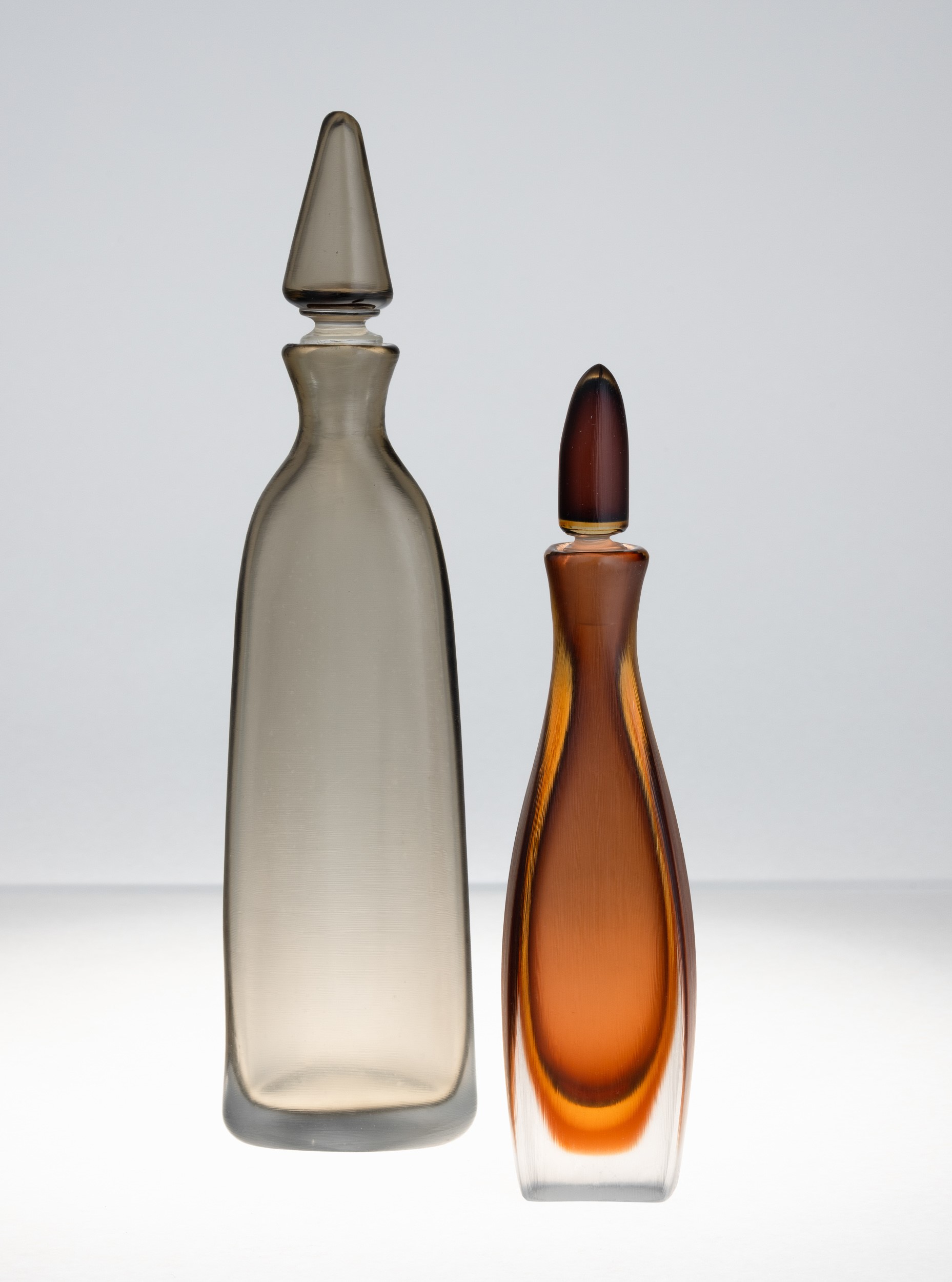 Due bottiglie serie Incisi in vetro sommerso prugna giallo e talpa con superficie interamente lavorata alla mola.
