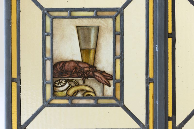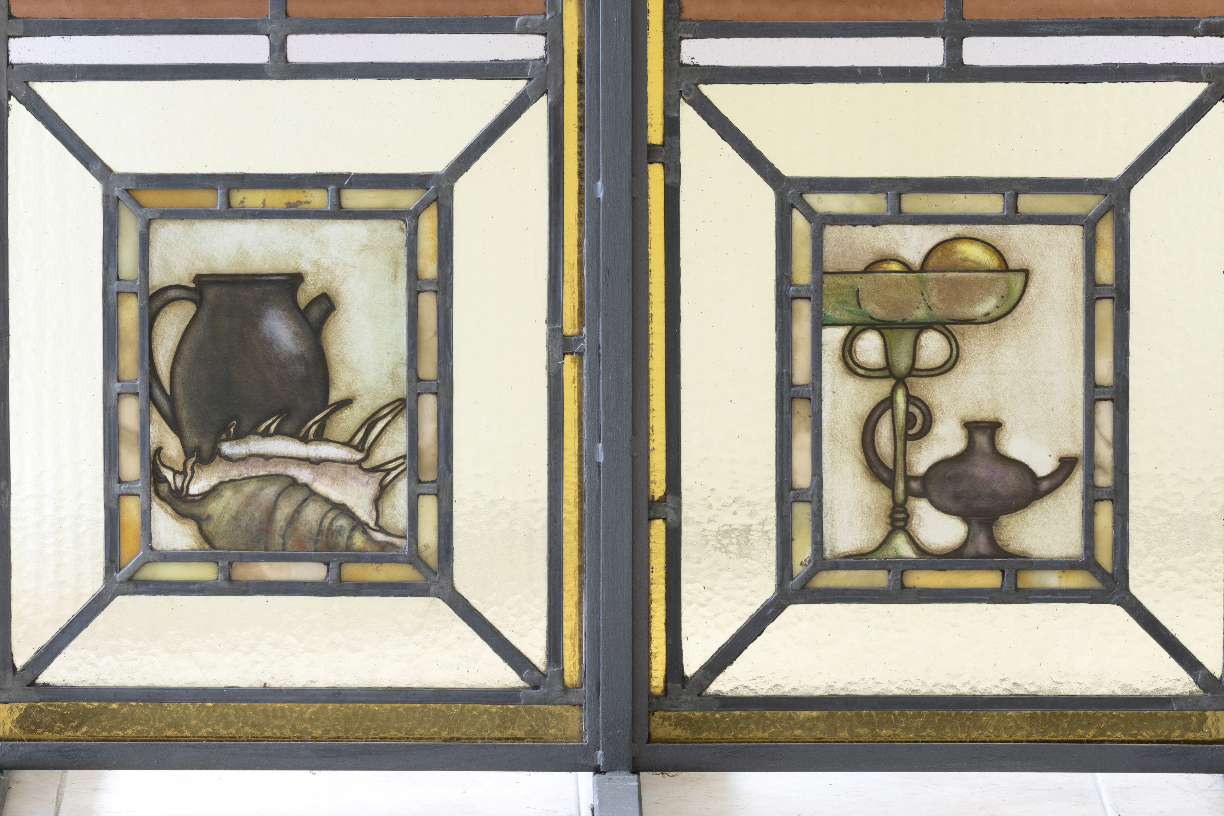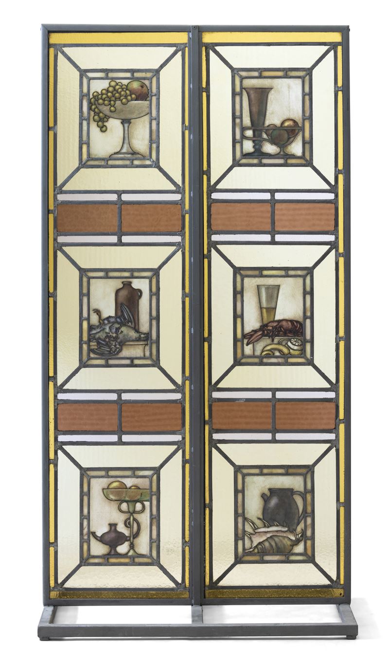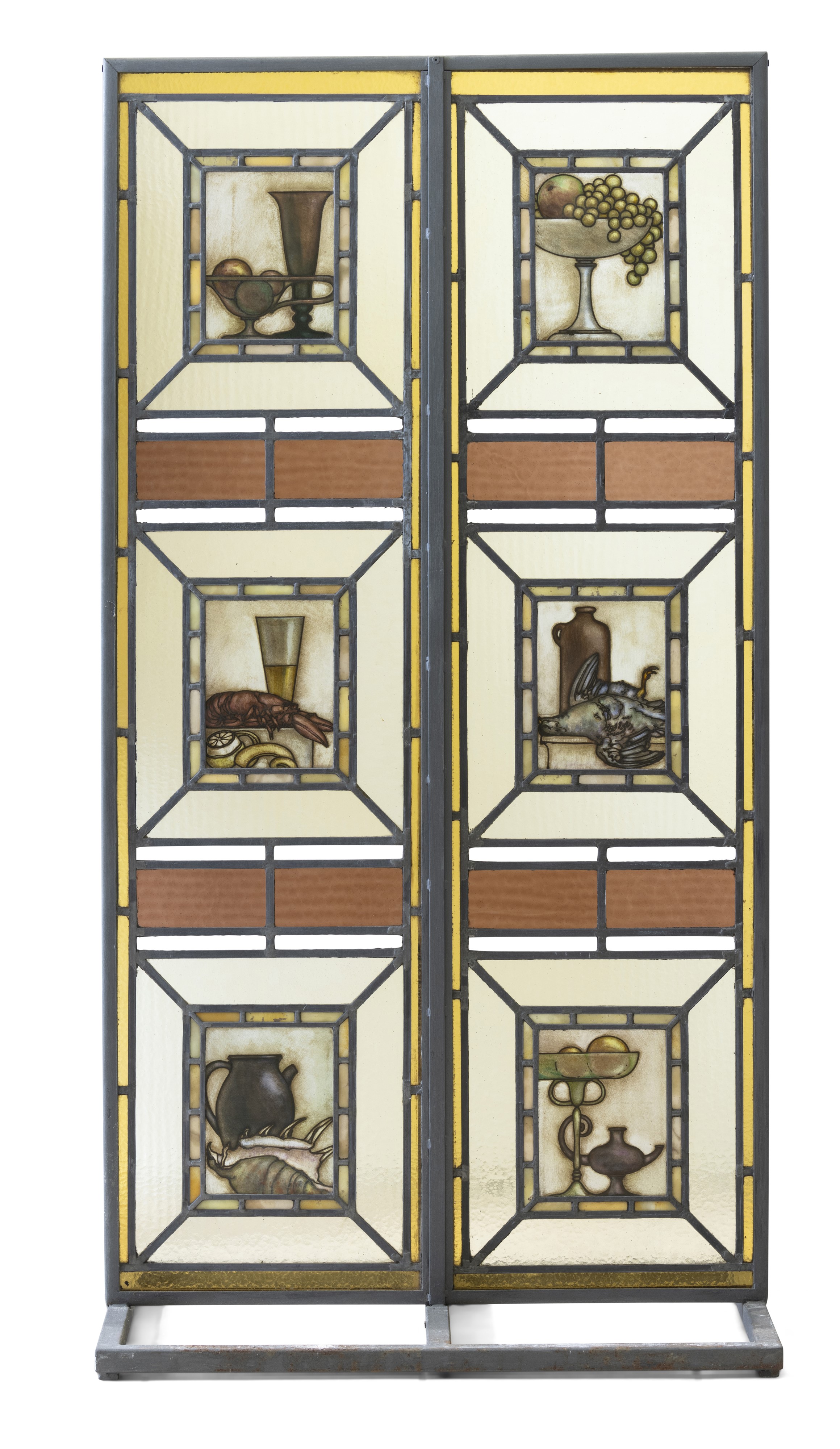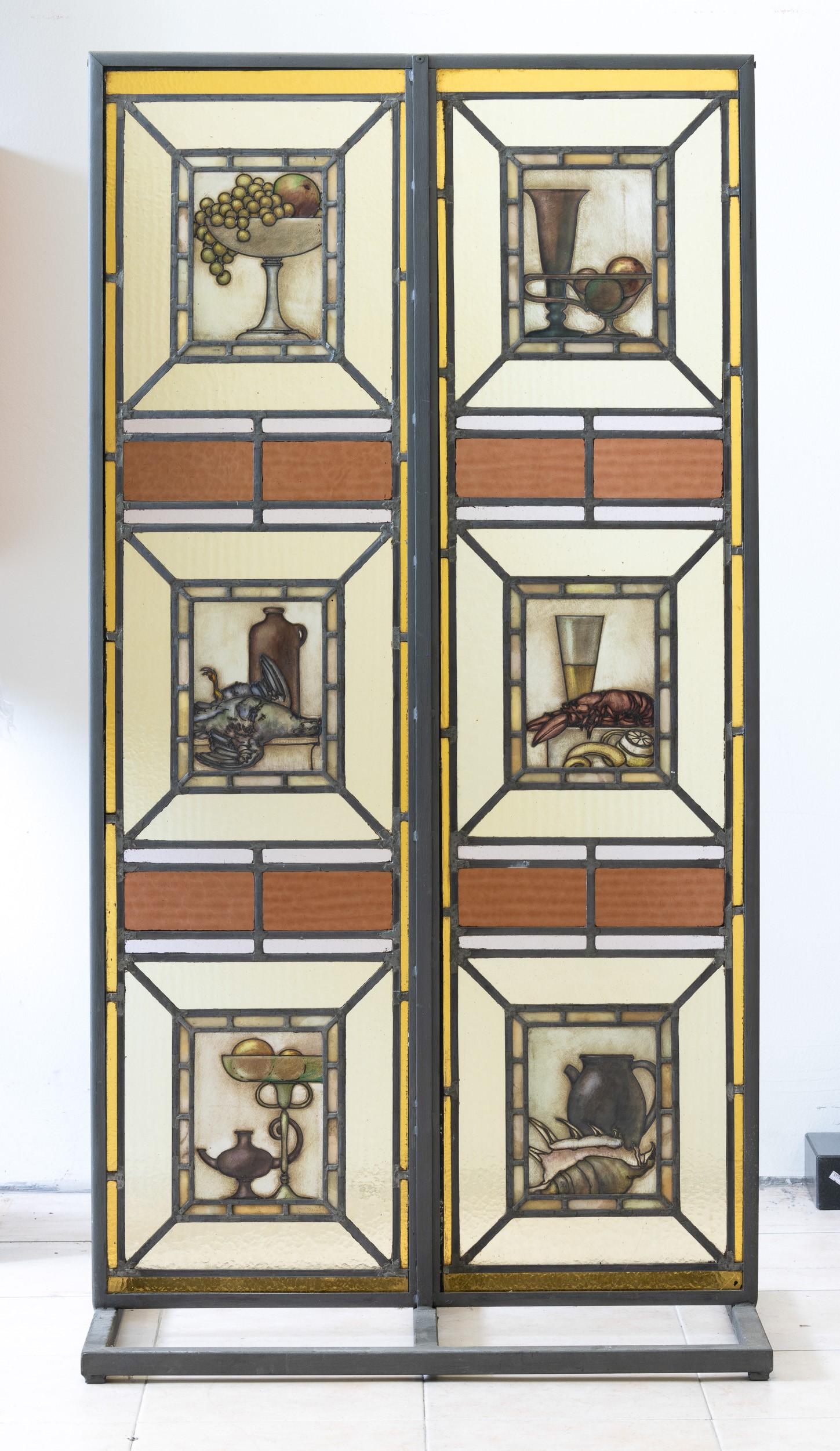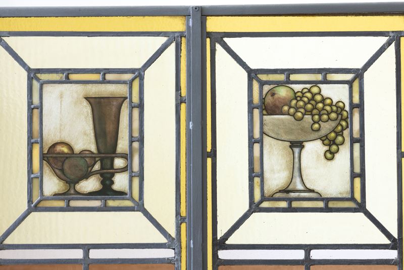 Rara vetrata in vetro legato al piombo composta da sei scomparti raffiguranti nature morte con celebri modelli della produzione vetraria muranese coeva (Vittorio Zecchin, Ercole Barovier, Umberto Bellotto).
