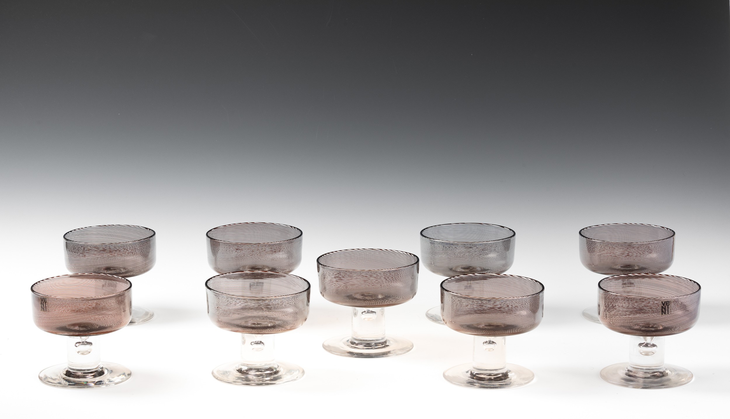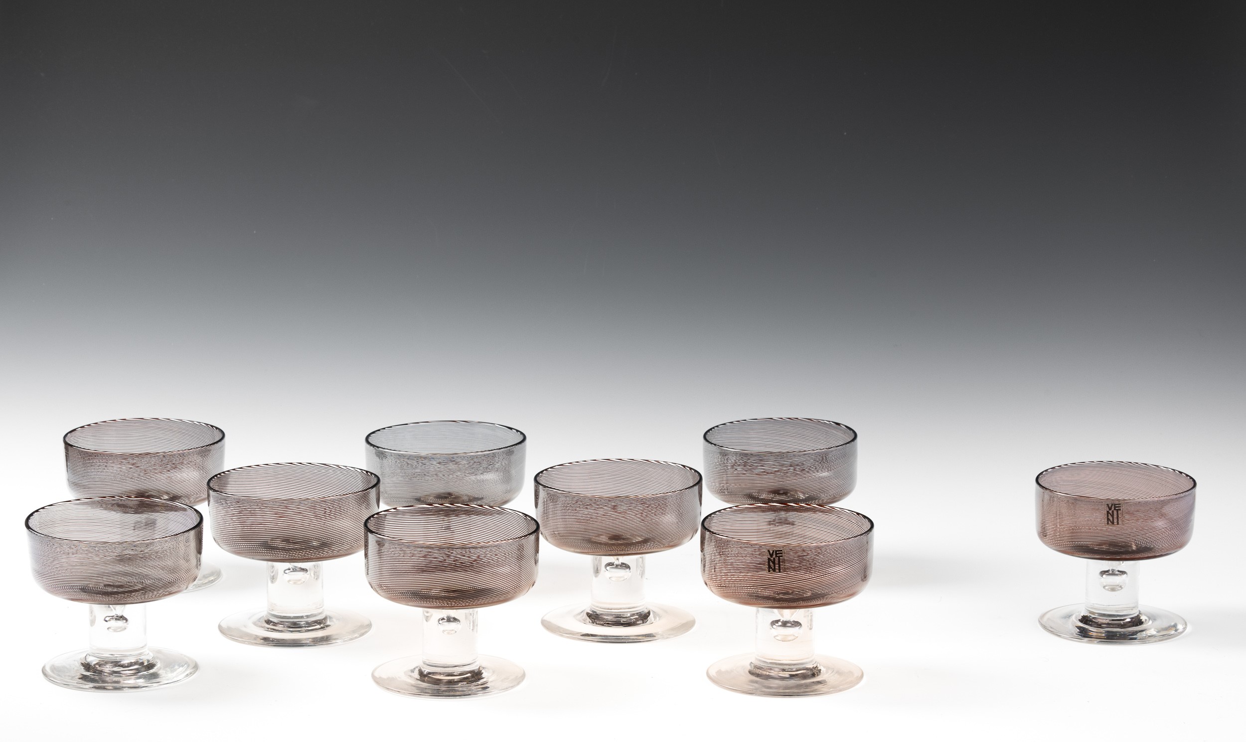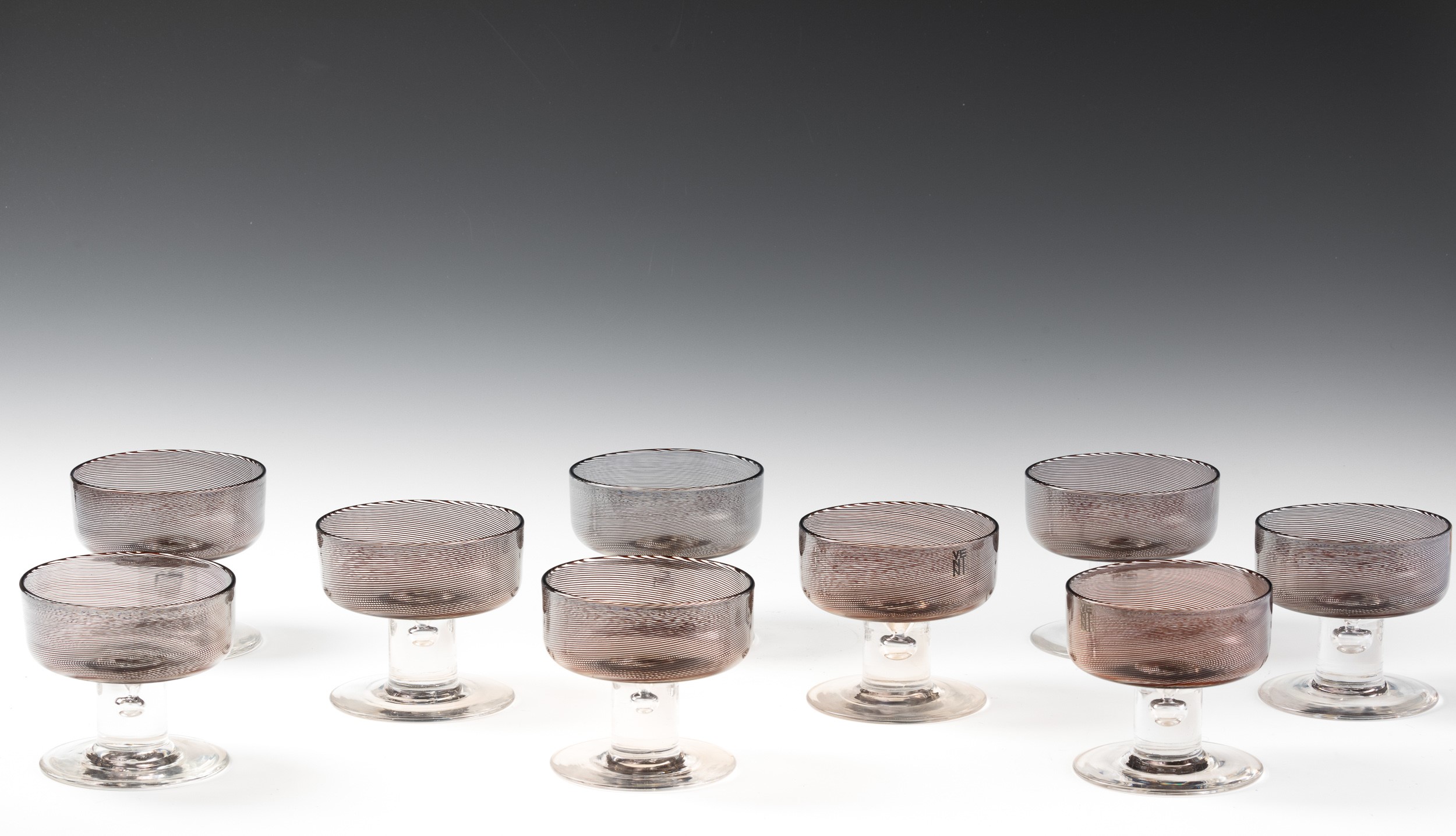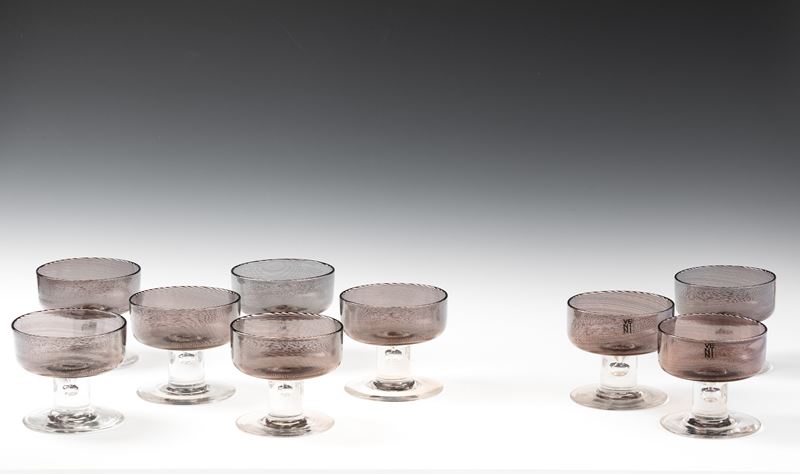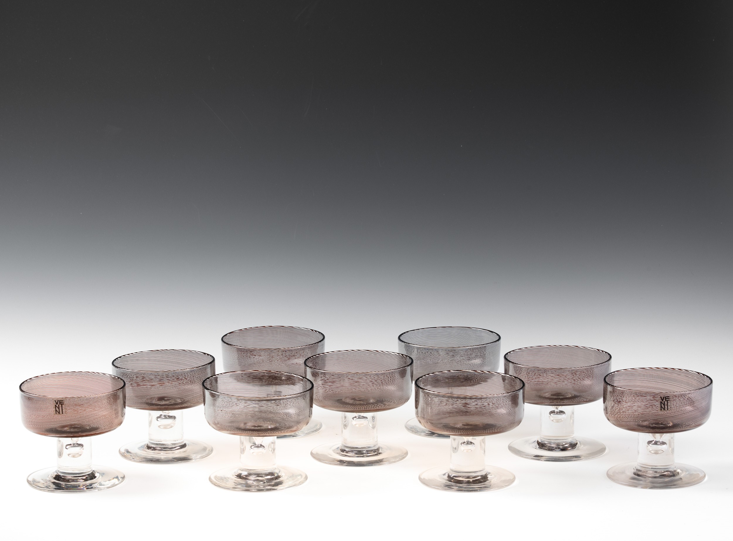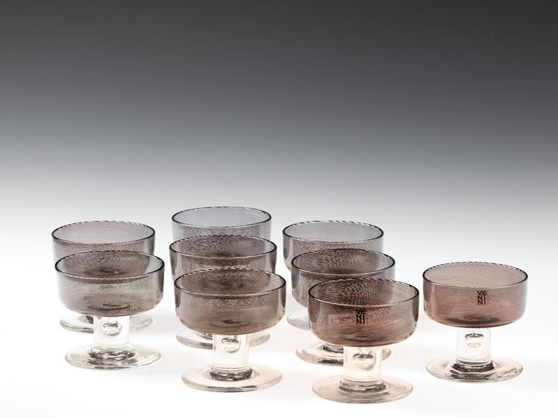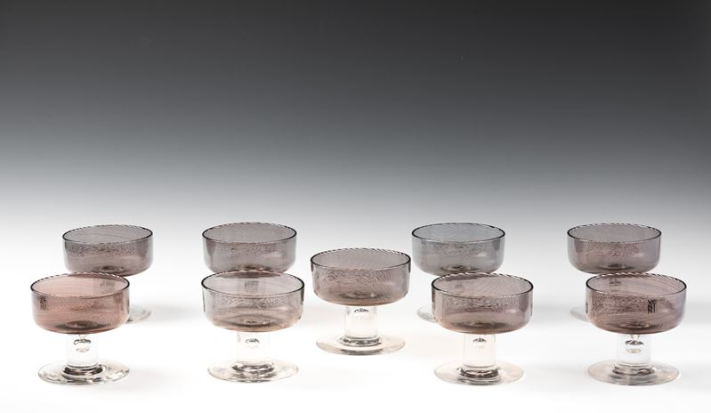 Nove coppe serie Rovaniemi in vetro soffiato con decoro a filigrana ametista su alto piede in cristallo trasparente.
