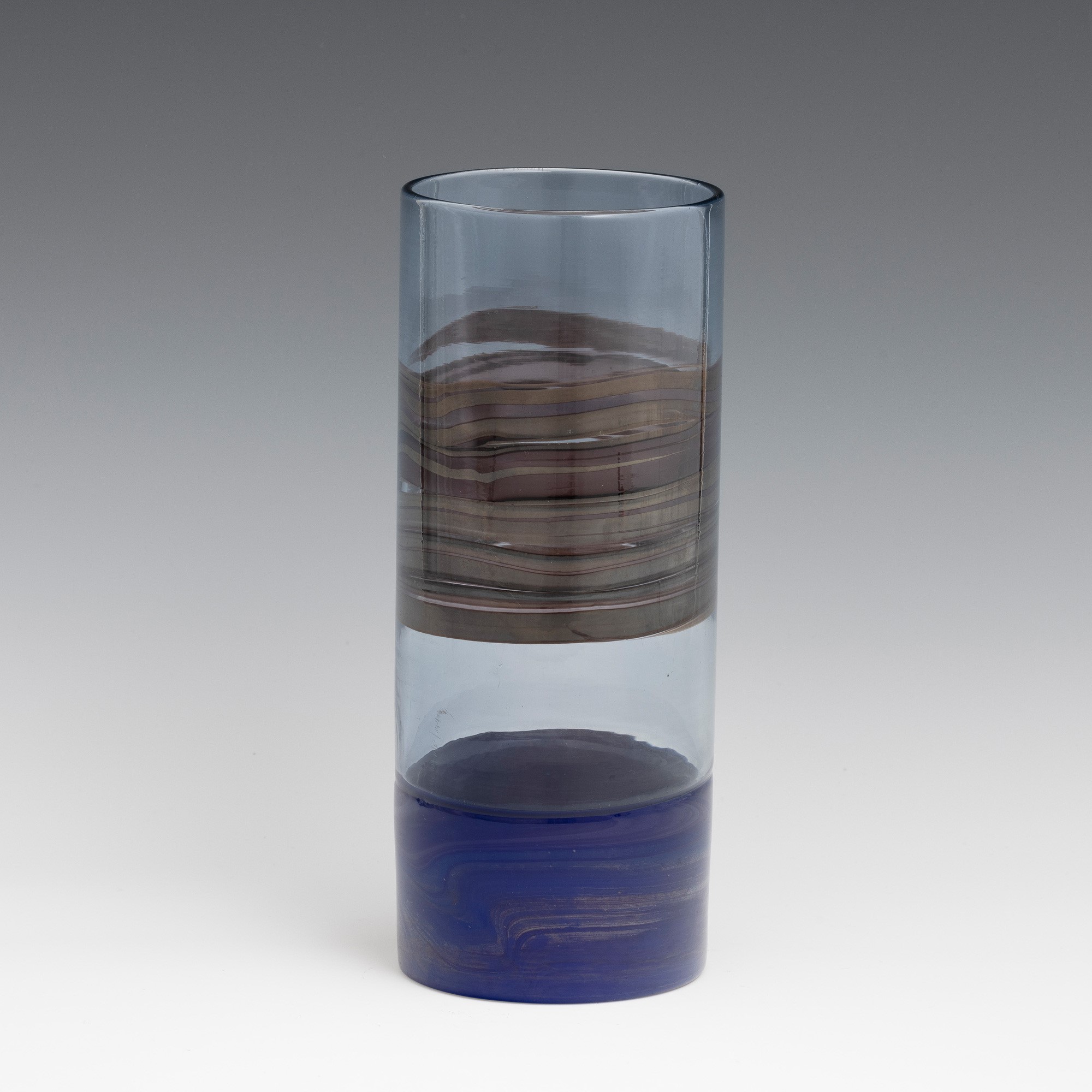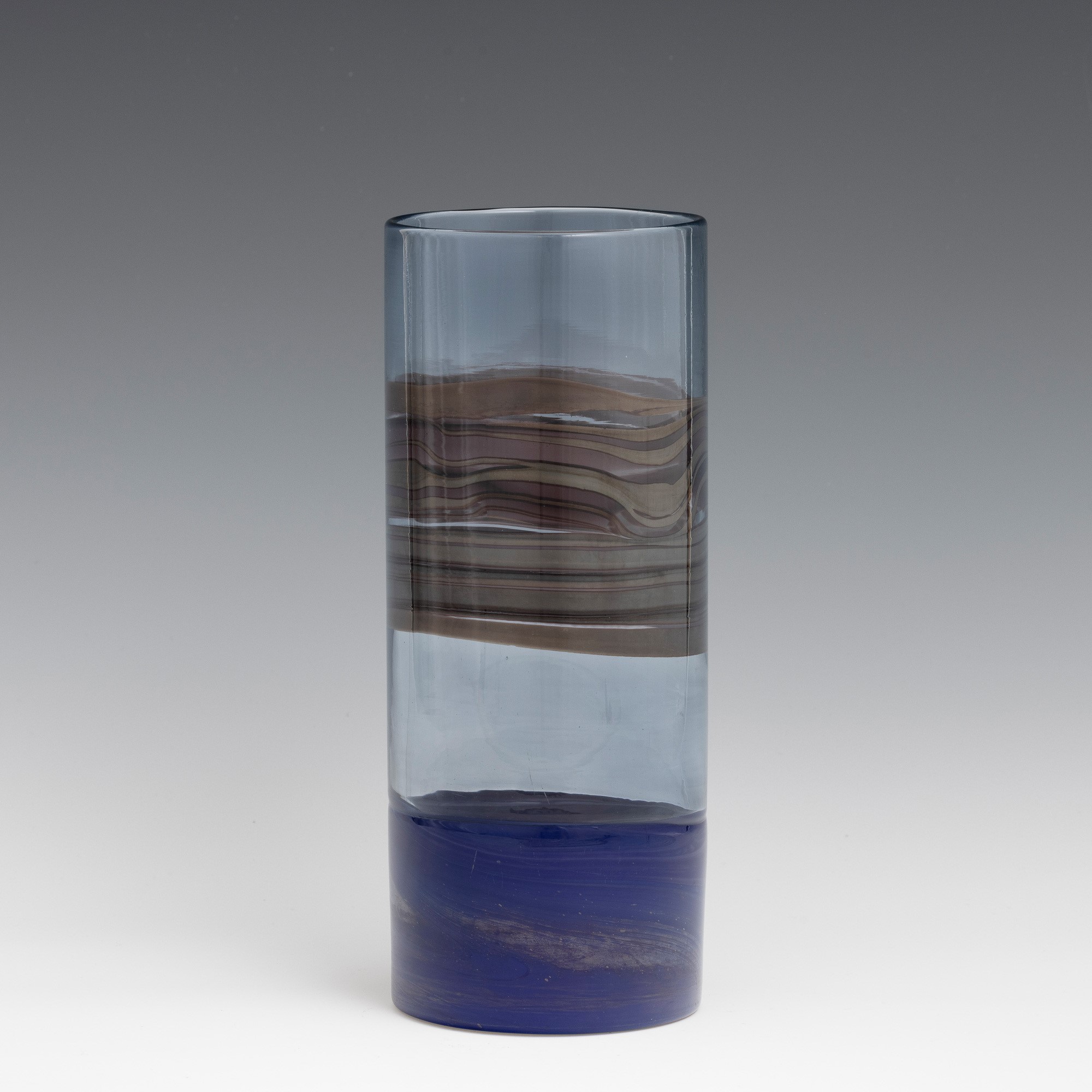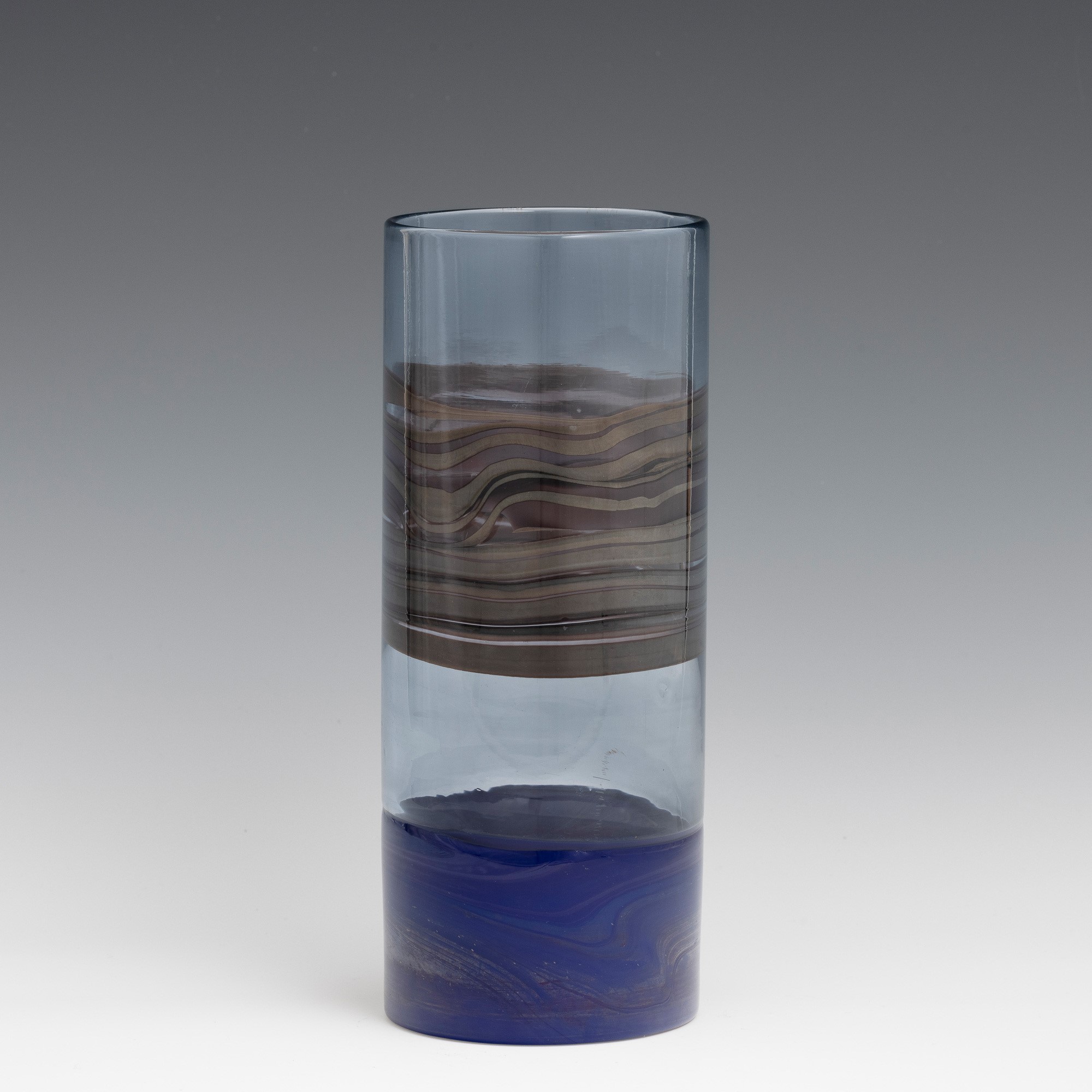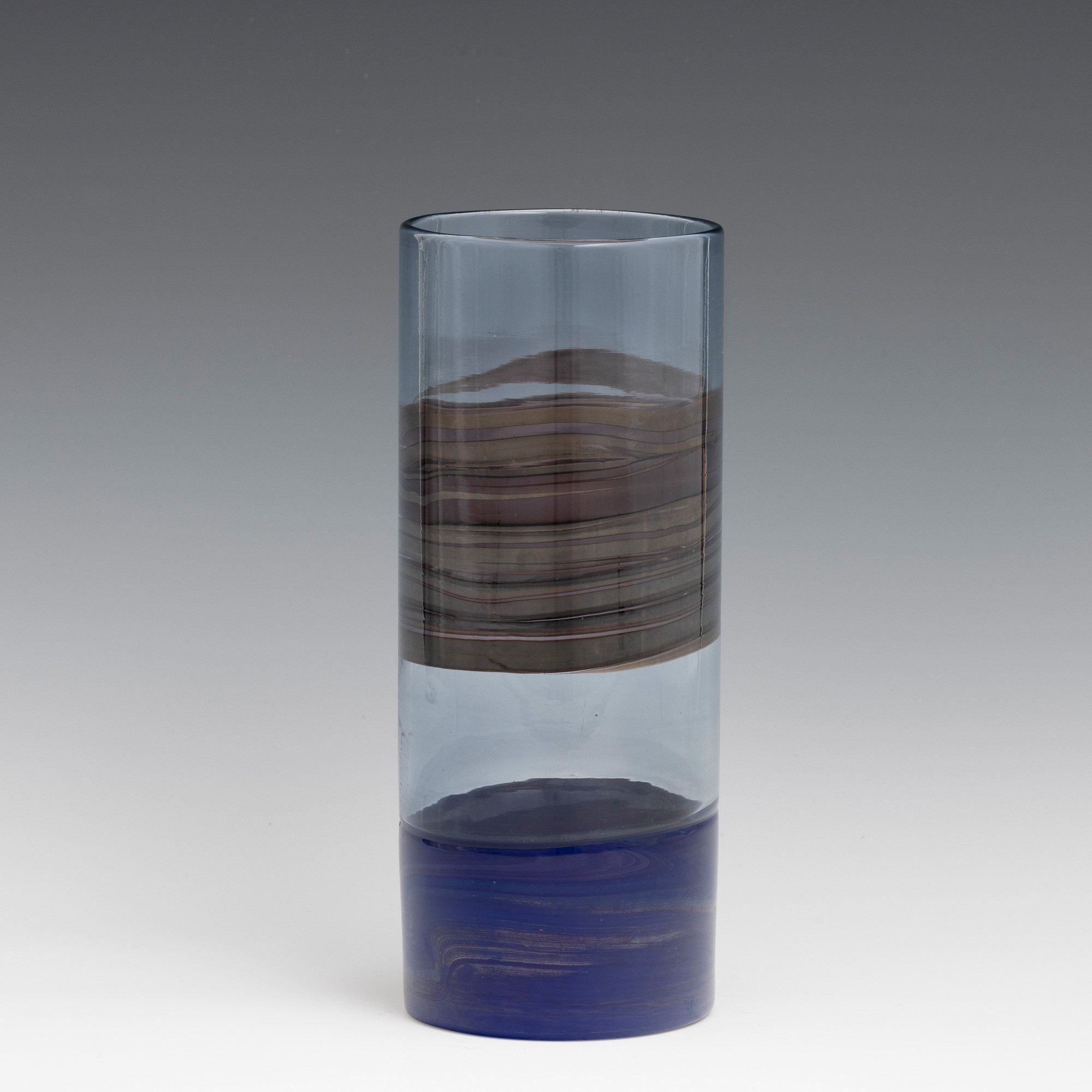 Vaso a cilindro in vetro soffiato con base a incalmo blu e parte superiore con decoro di fasce orizzontali antracite.