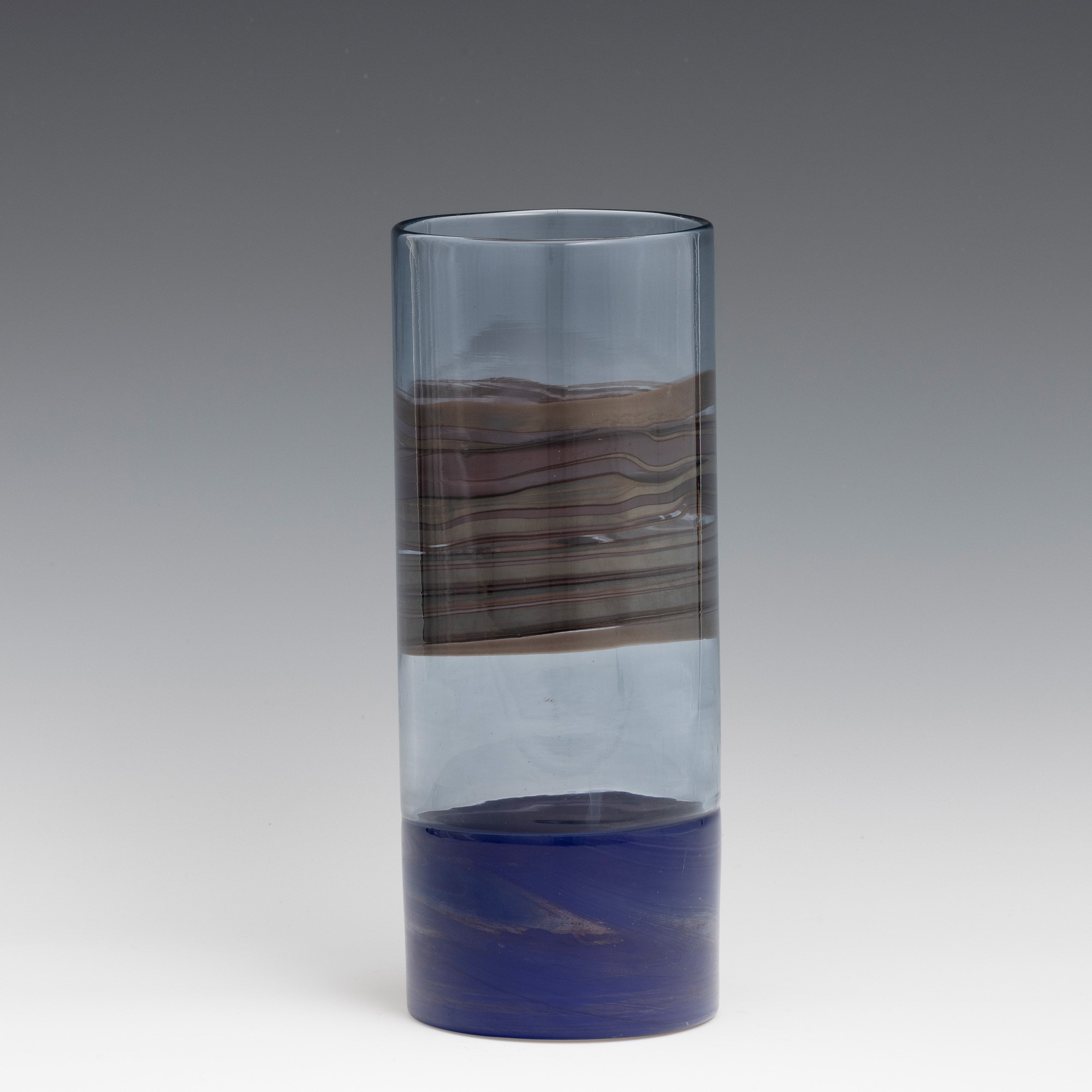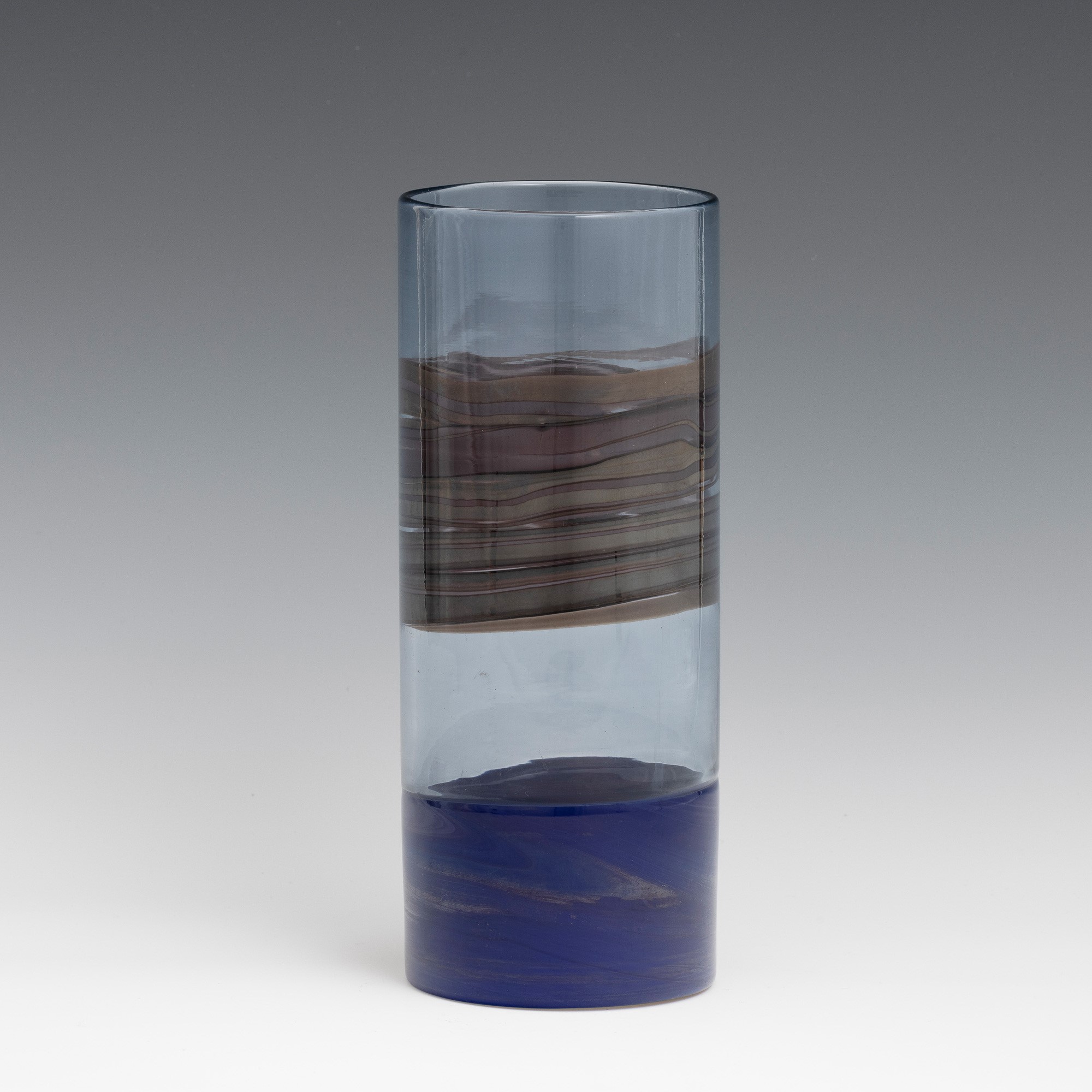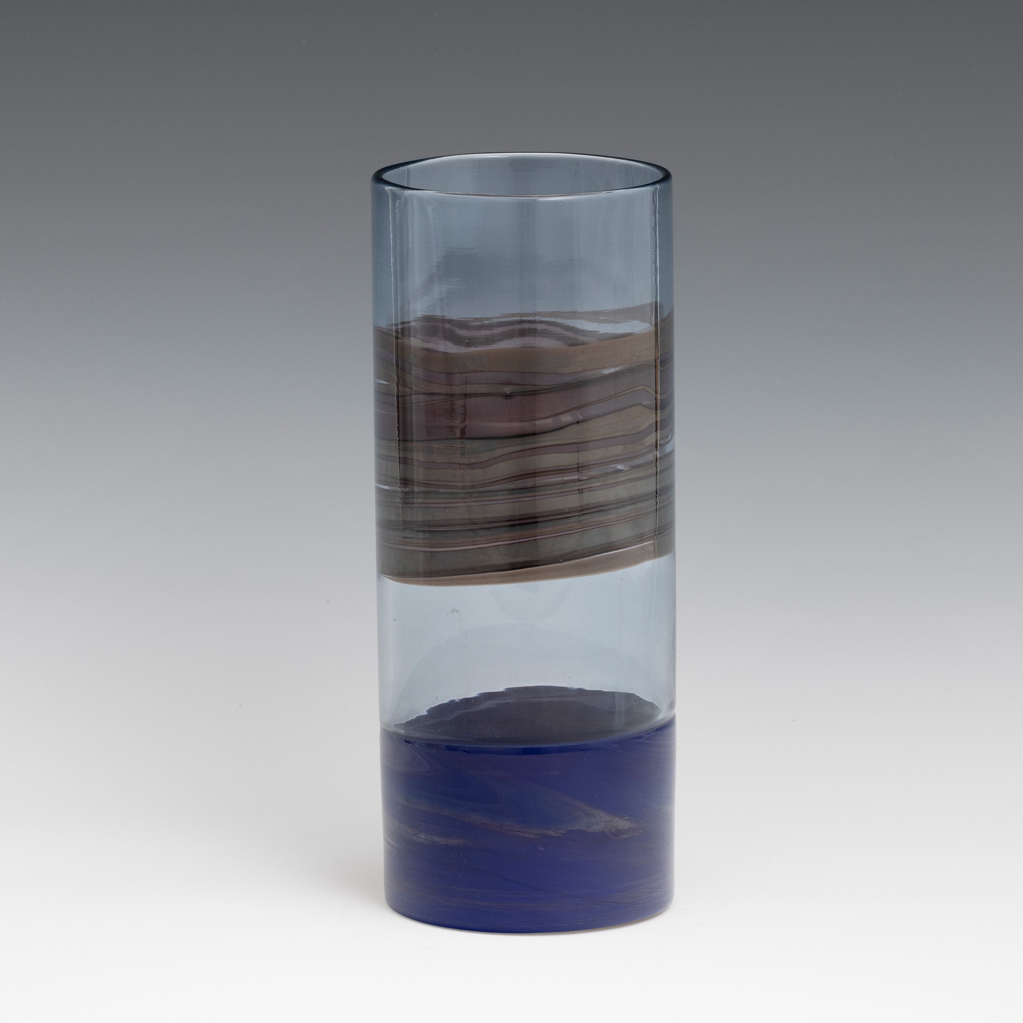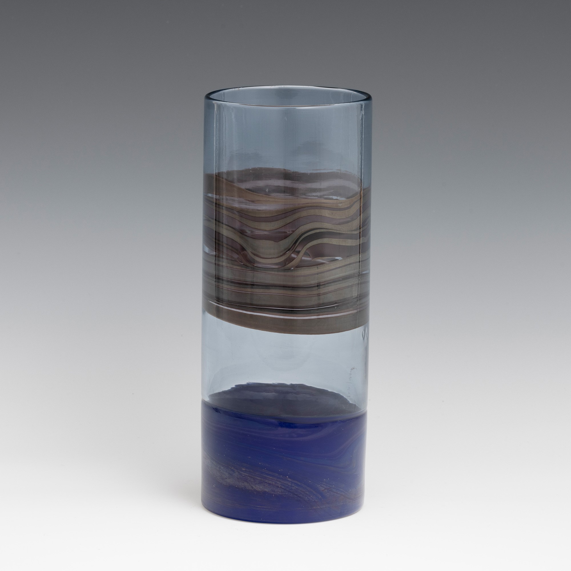 Vaso a cilindro in vetro soffiato con base a incalmo blu e parte superiore con decoro di fasce orizzontali antracite.
