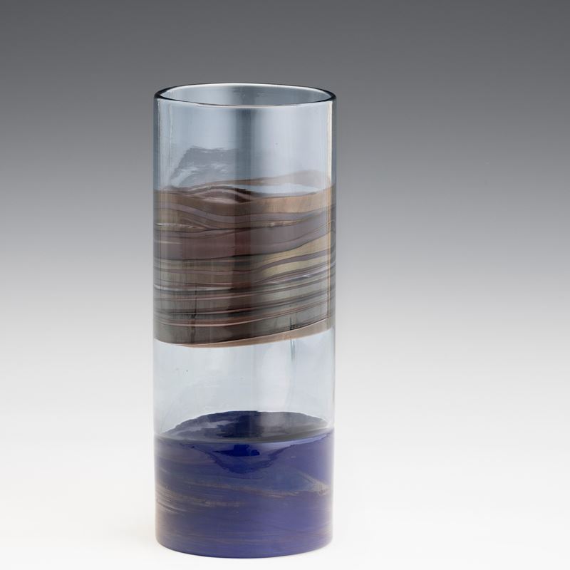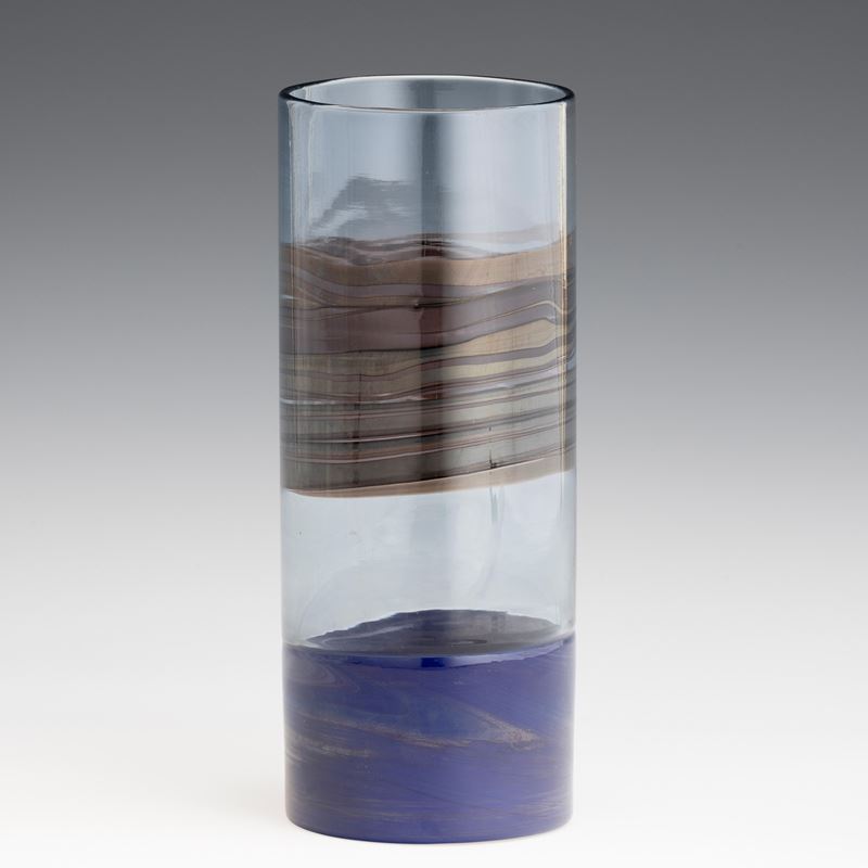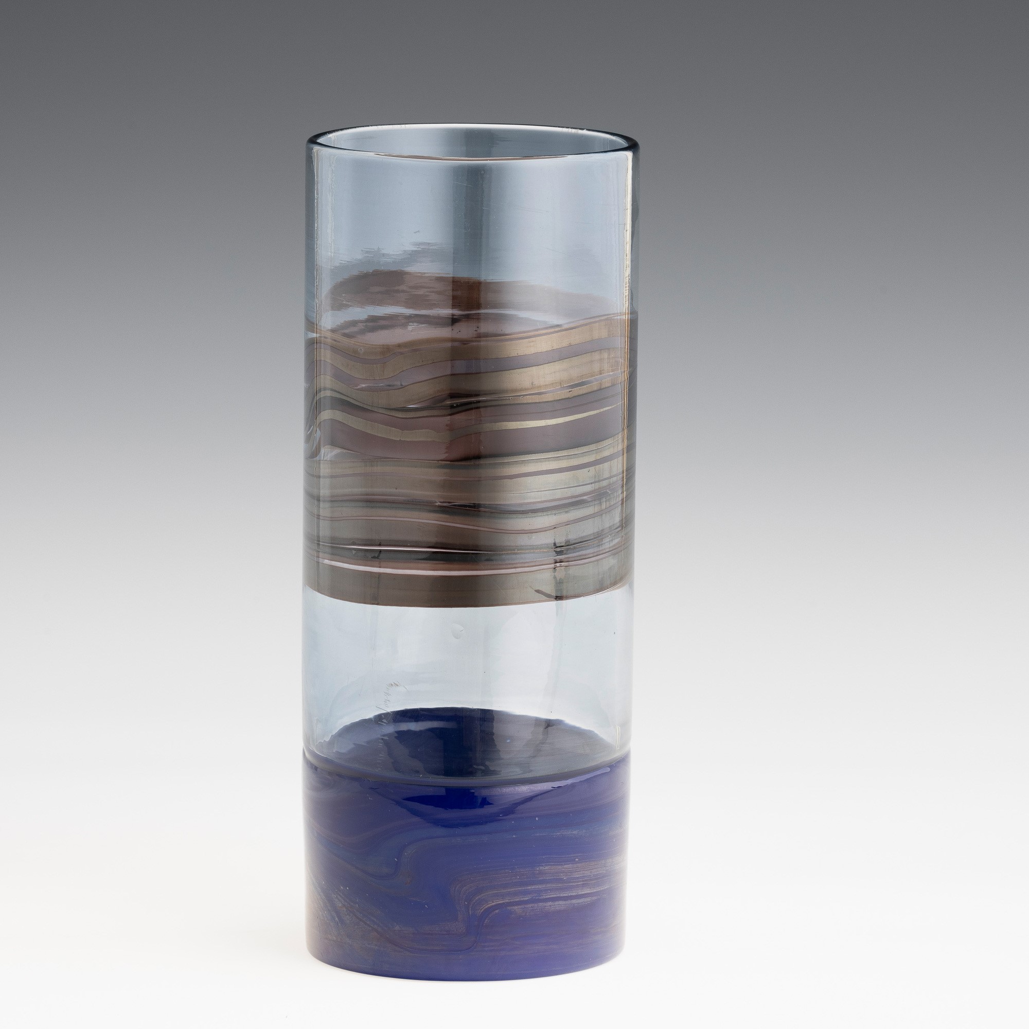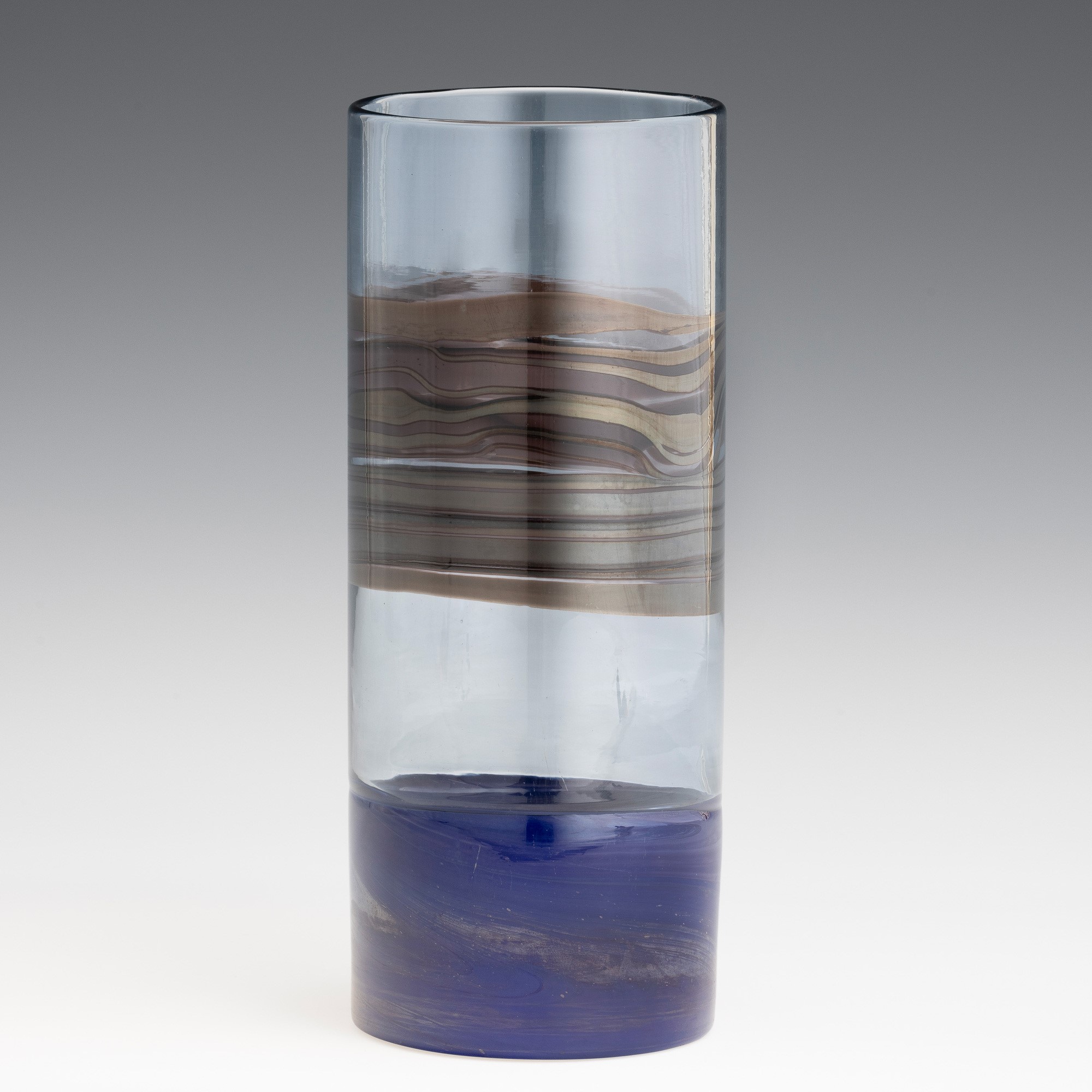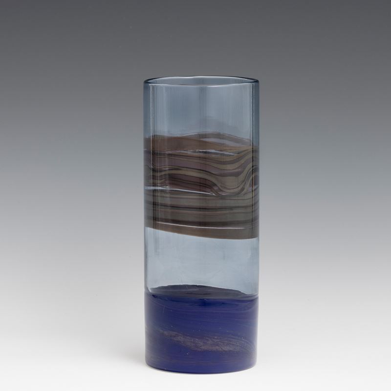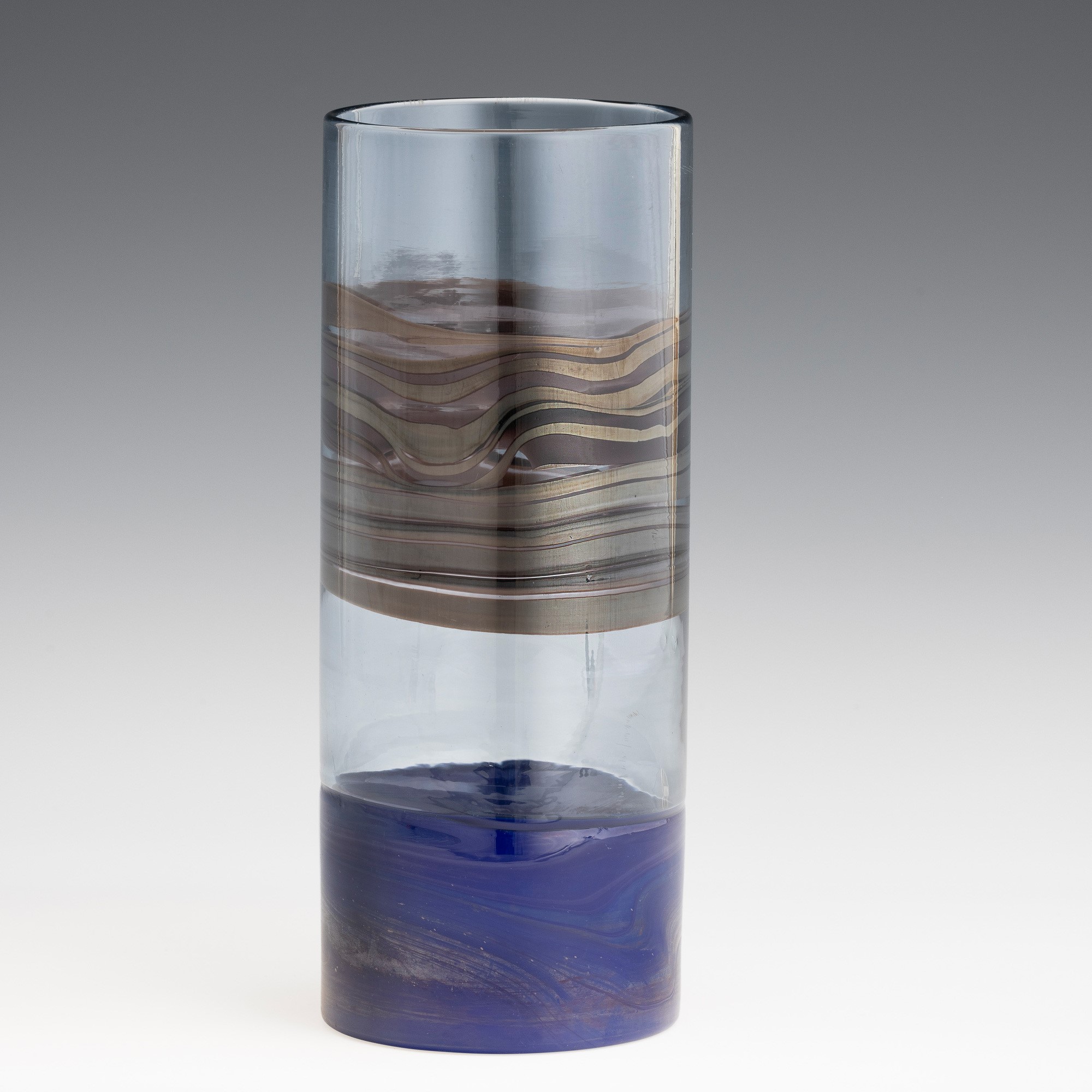 Vaso a cilindro in vetro soffiato con base a incalmo blu e parte superiore con decoro di fasce orizzontali antracite.