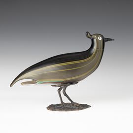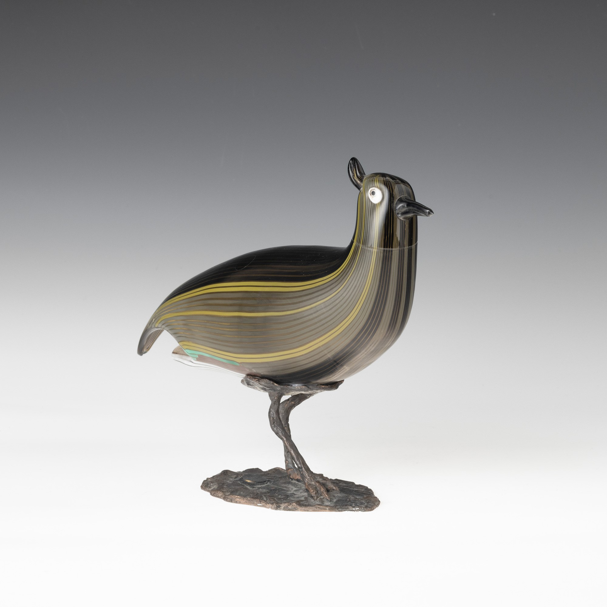 Scultura in vetro soffiato con decoro di canne policrome. Corpo con superficie interamente battuto alla mola.