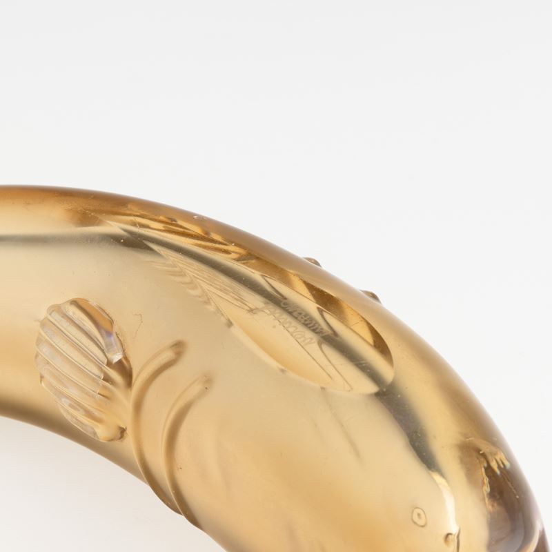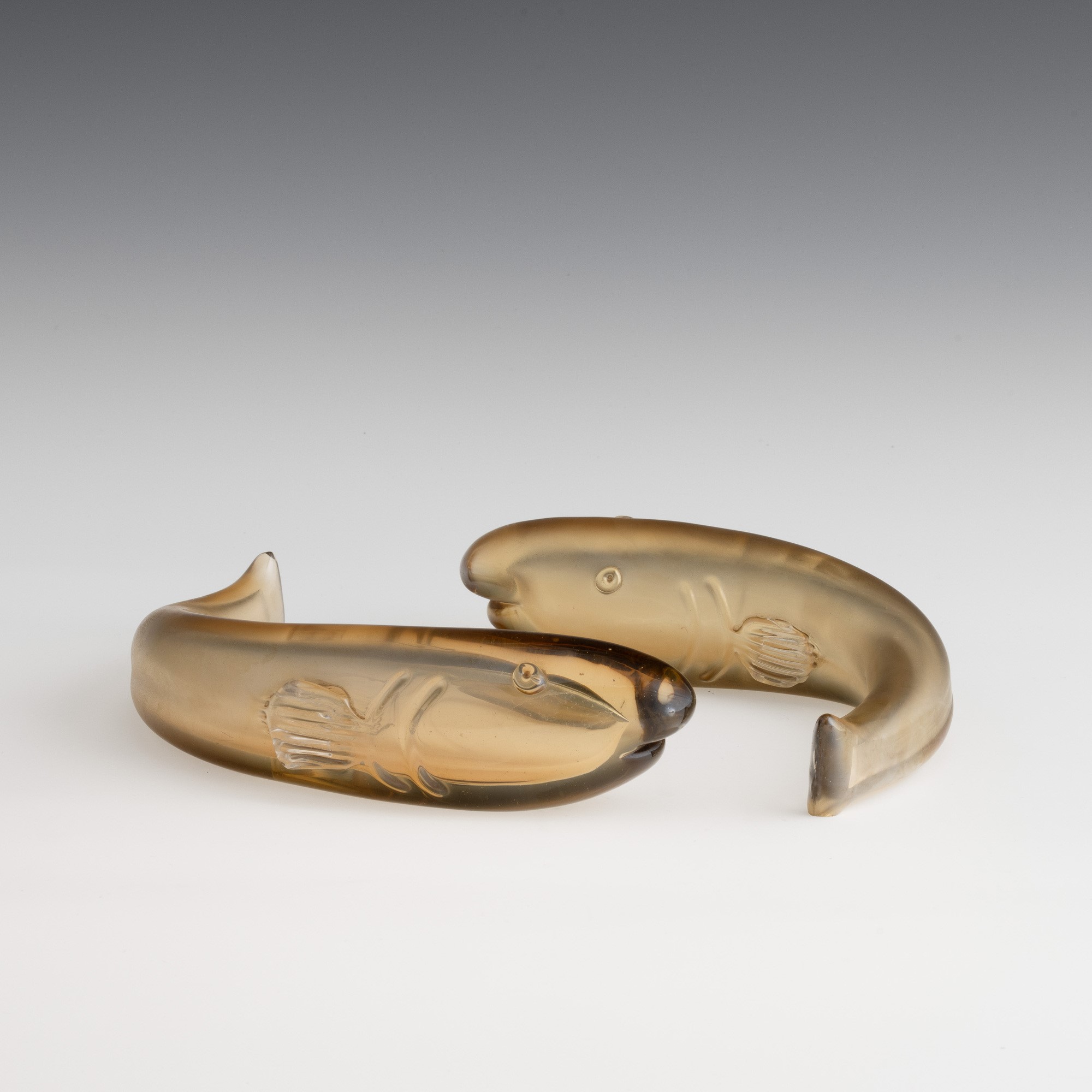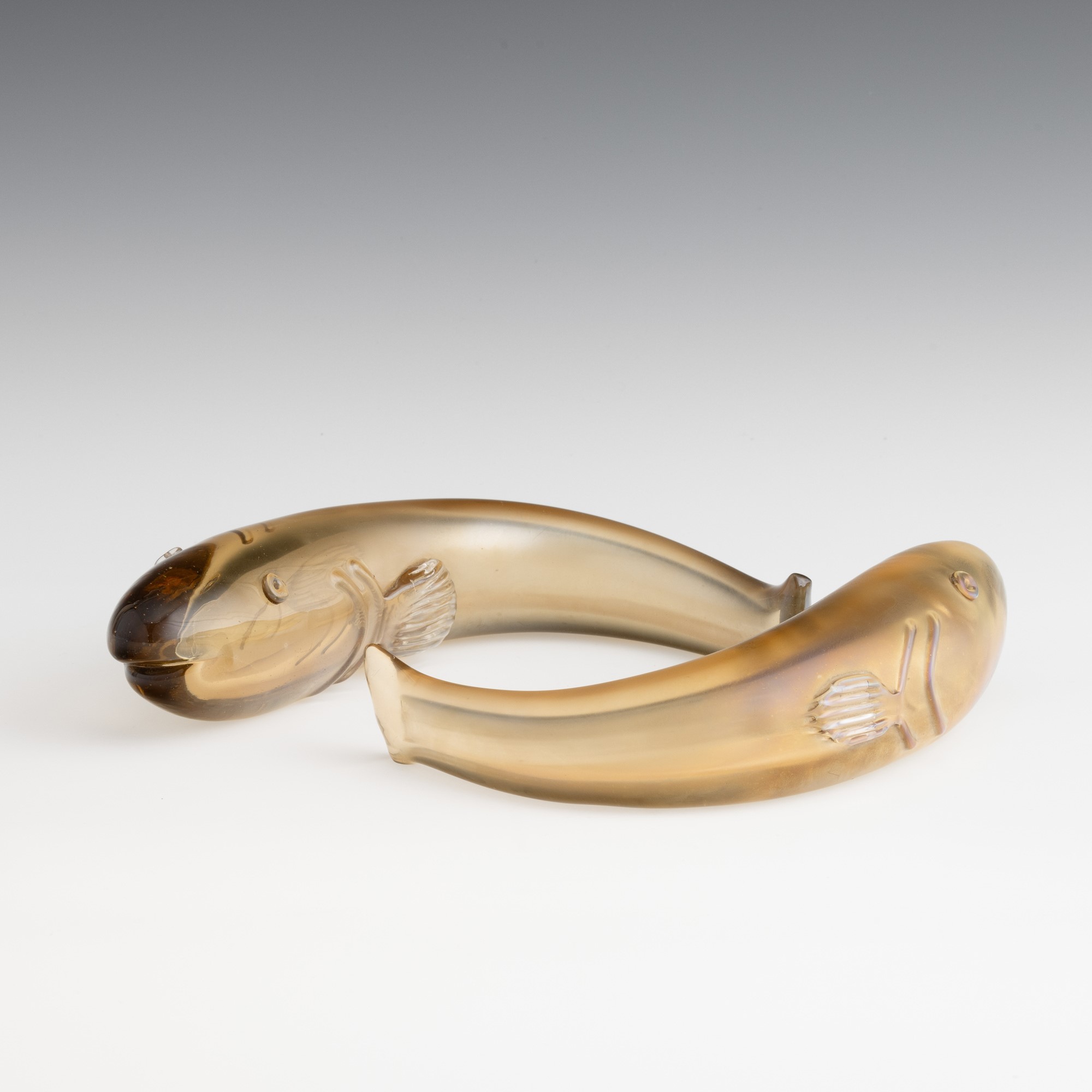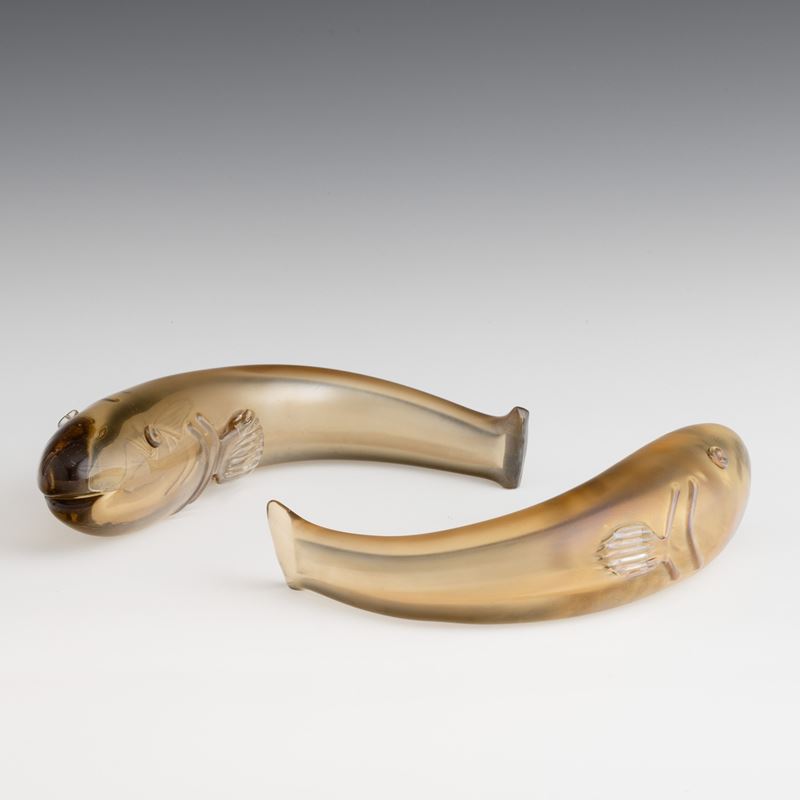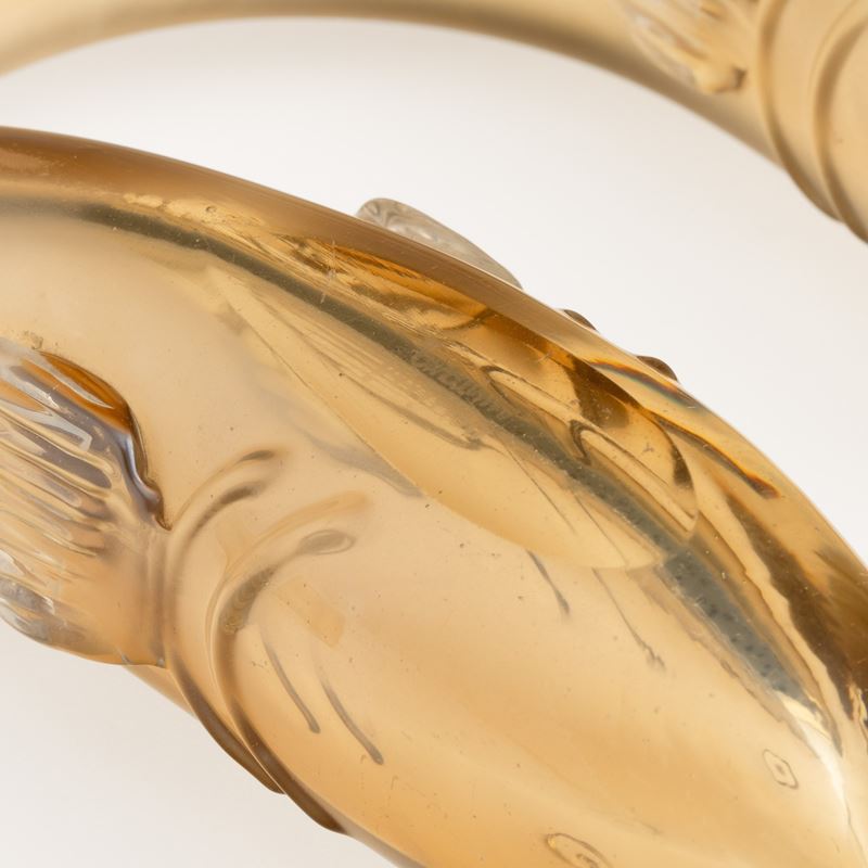 Coppia di pesci con corpo ricurvo in vetro sommerso pagliesco. Superficie iridata.