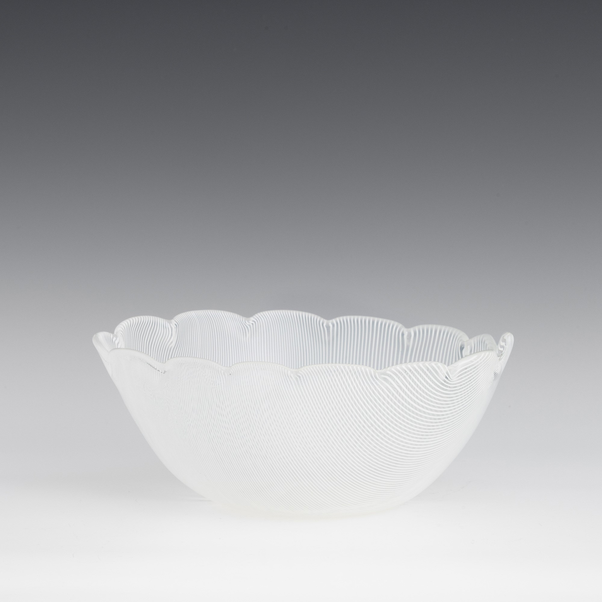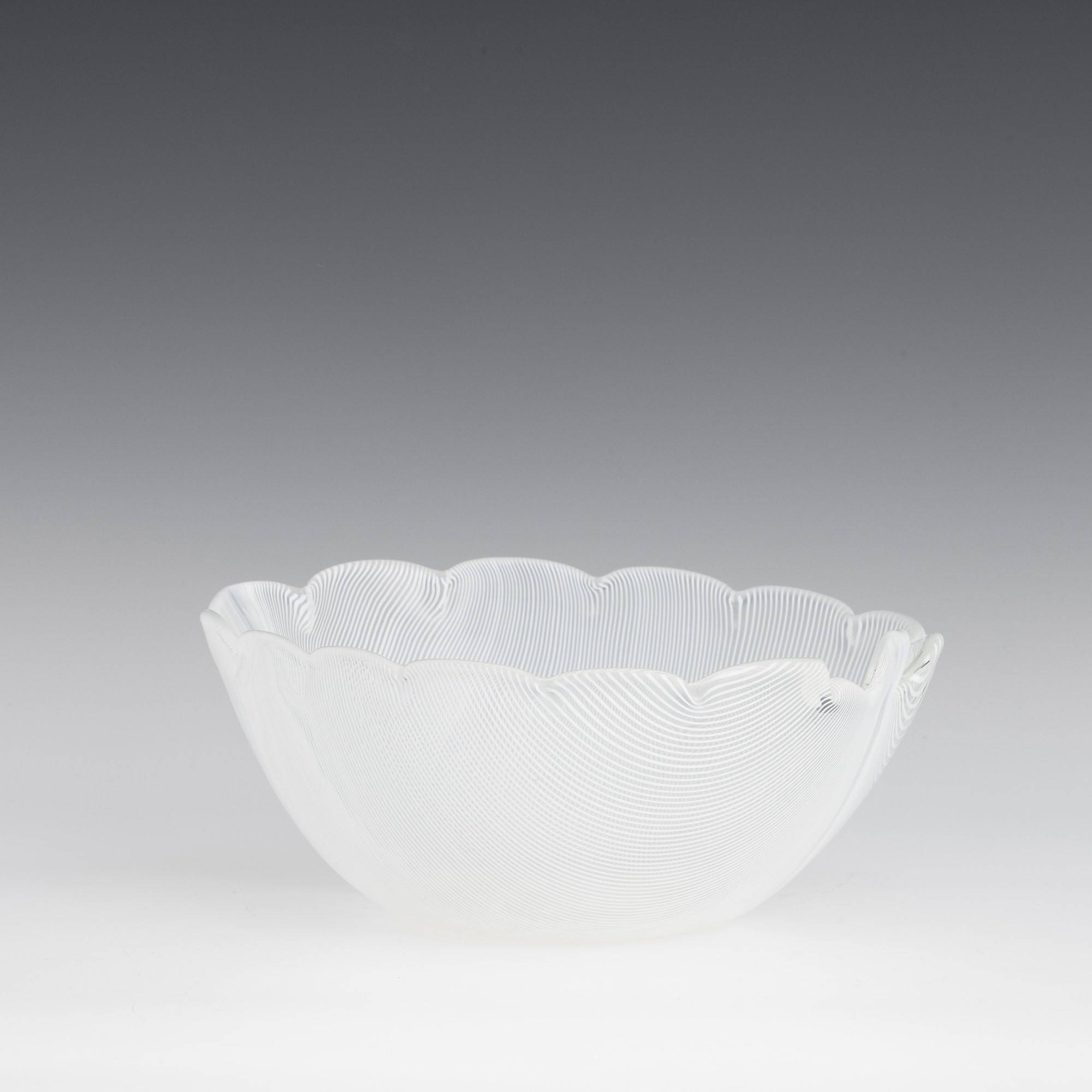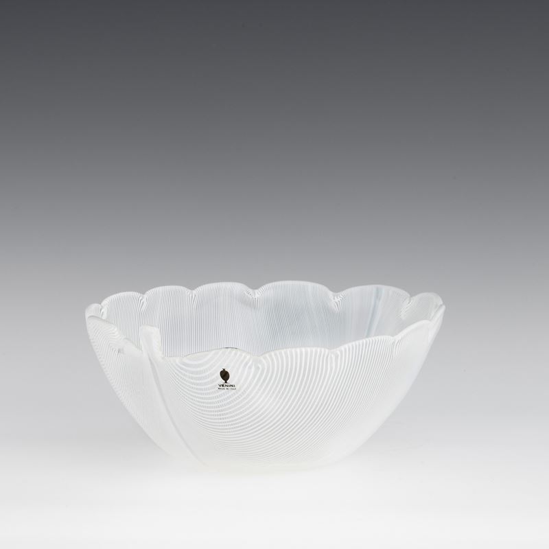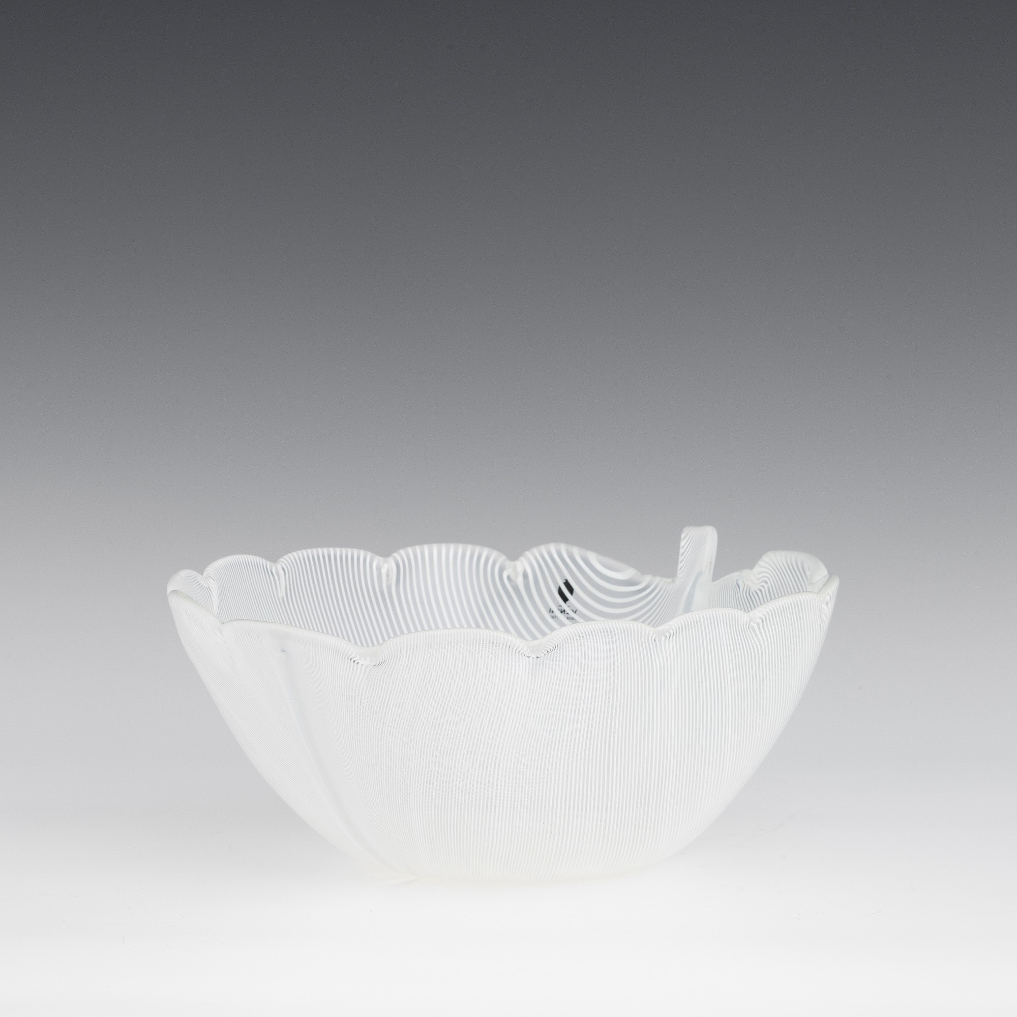 Soprammobile in forma di foglia in vetro soffiato con decoro a mezza filigrana lattimo.