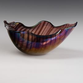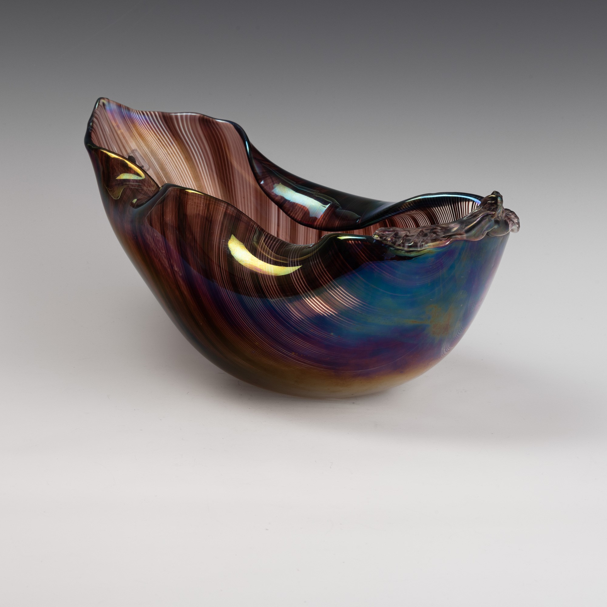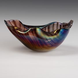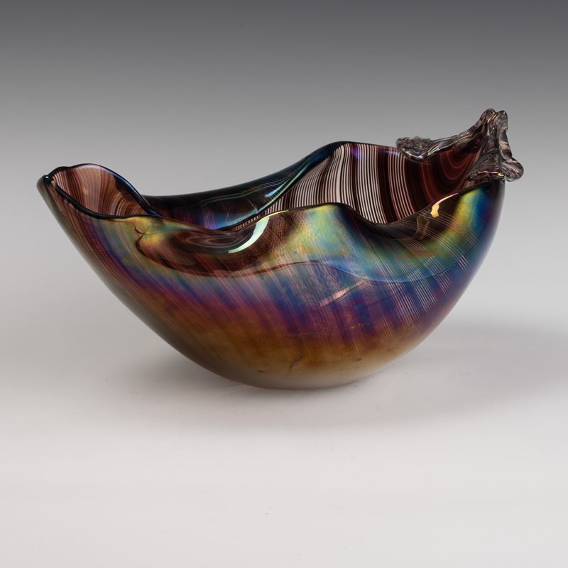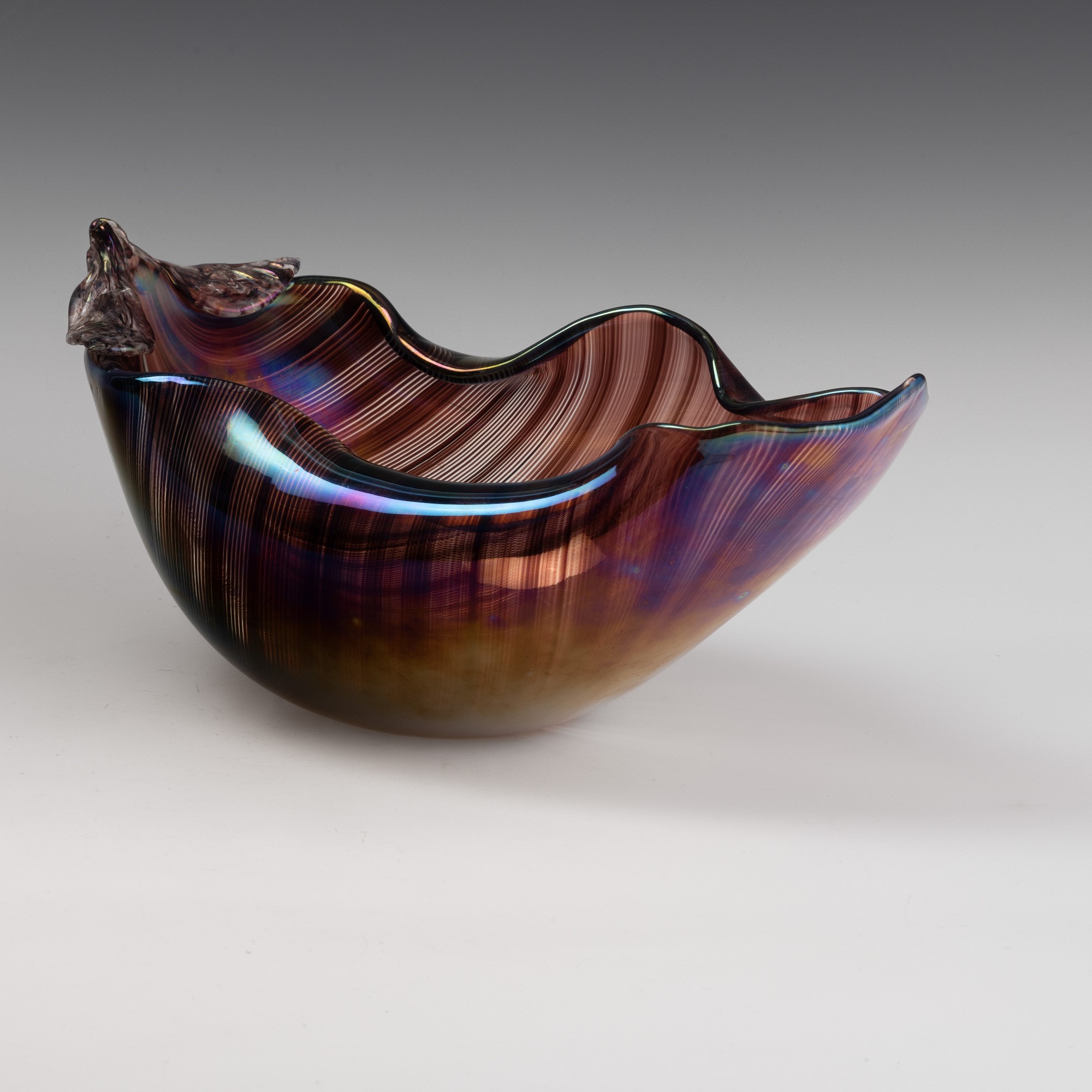 Soprammobile in forma di foglia con bordo ondulato in vetro a mezza filigrana sommersa. Superficie interamente iridata.