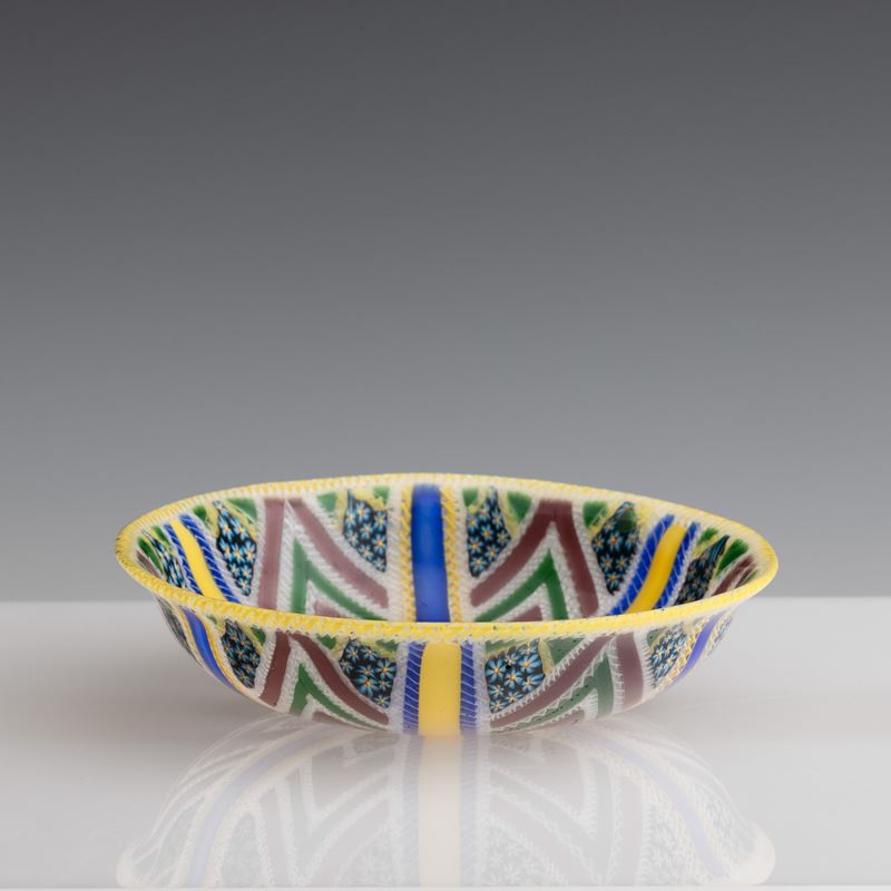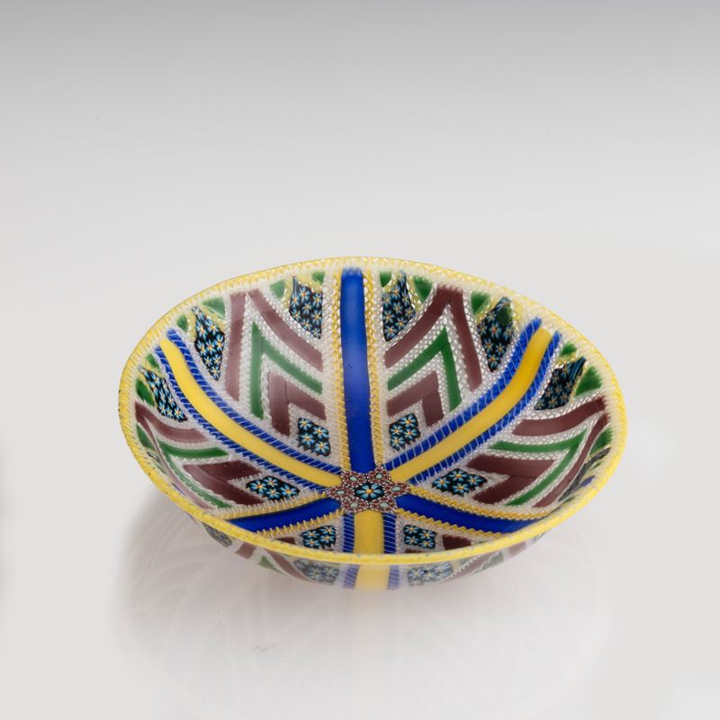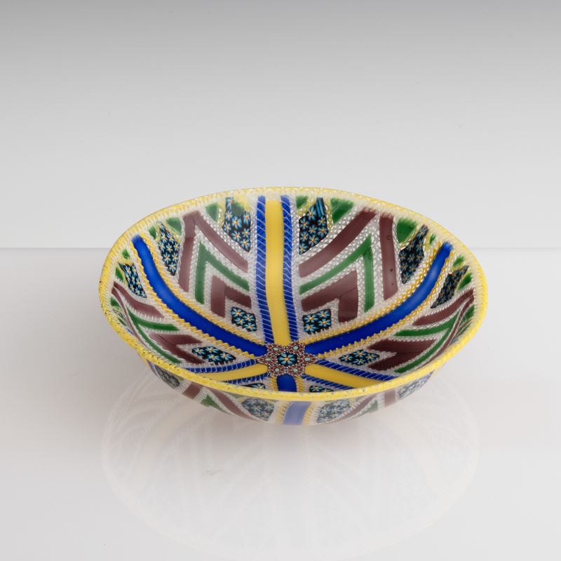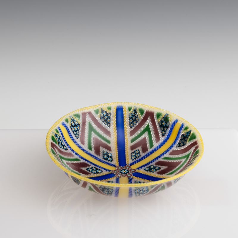 Coppa in vetro soffiato formata da tessuto a mosaico di murrine millefiori e canne ritorte policrome.