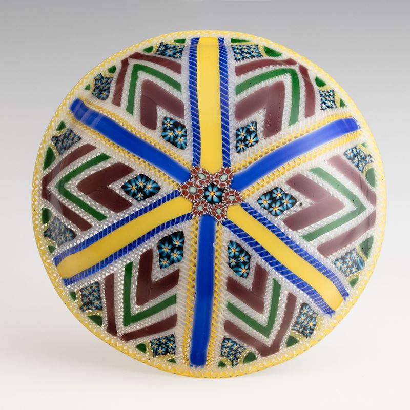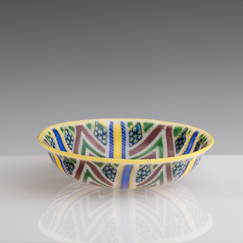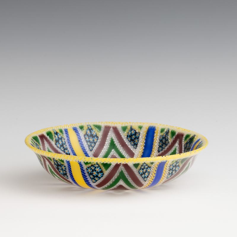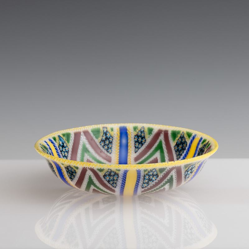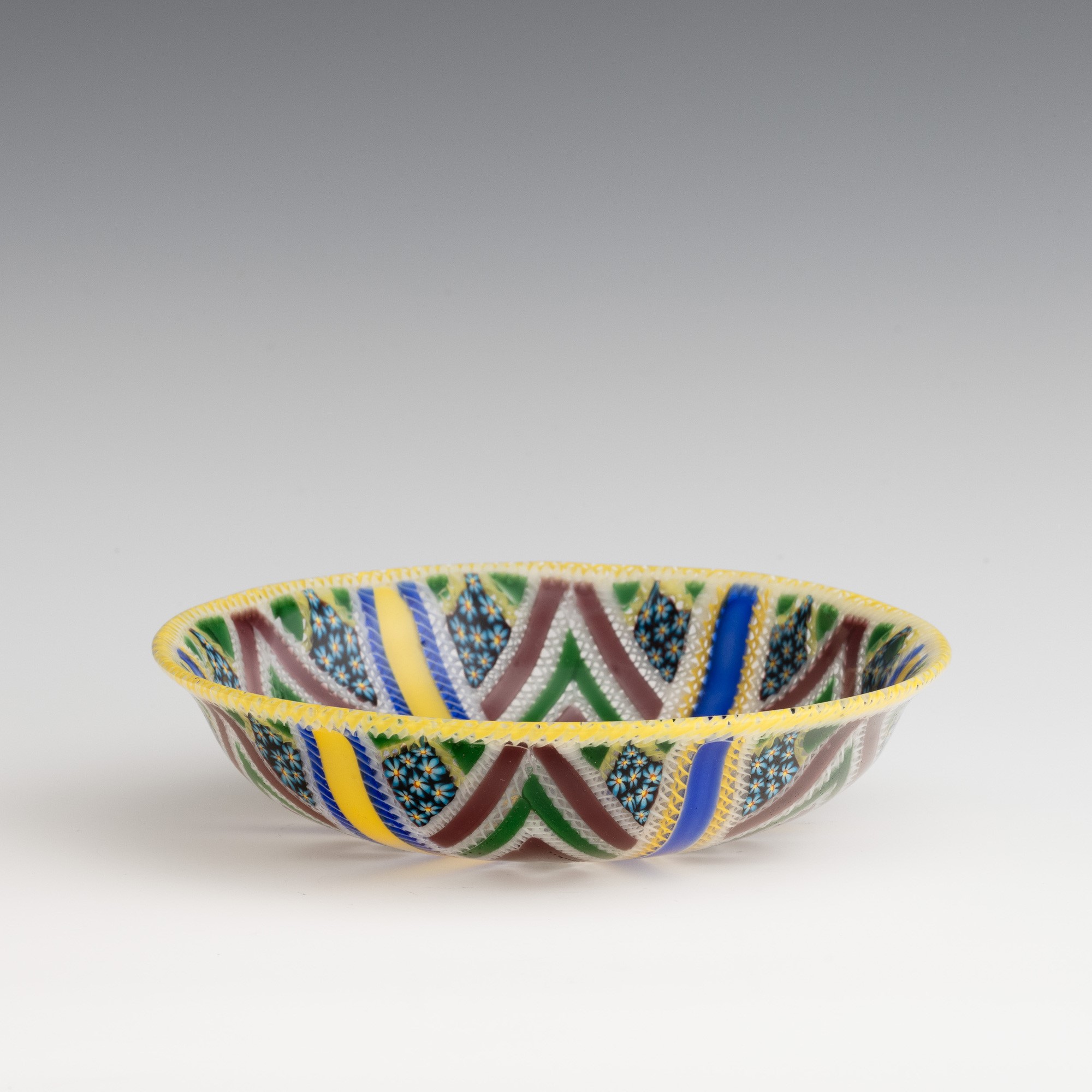 Coppa in vetro soffiato formata da tessuto a mosaico di murrine millefiori e canne ritorte policrome.