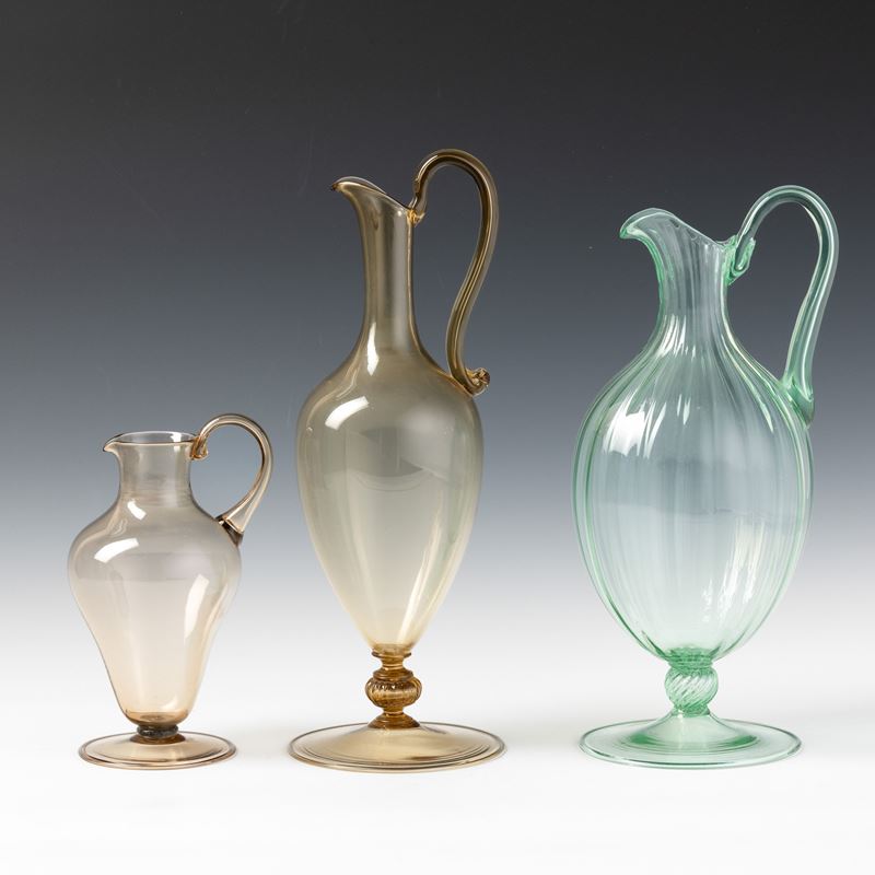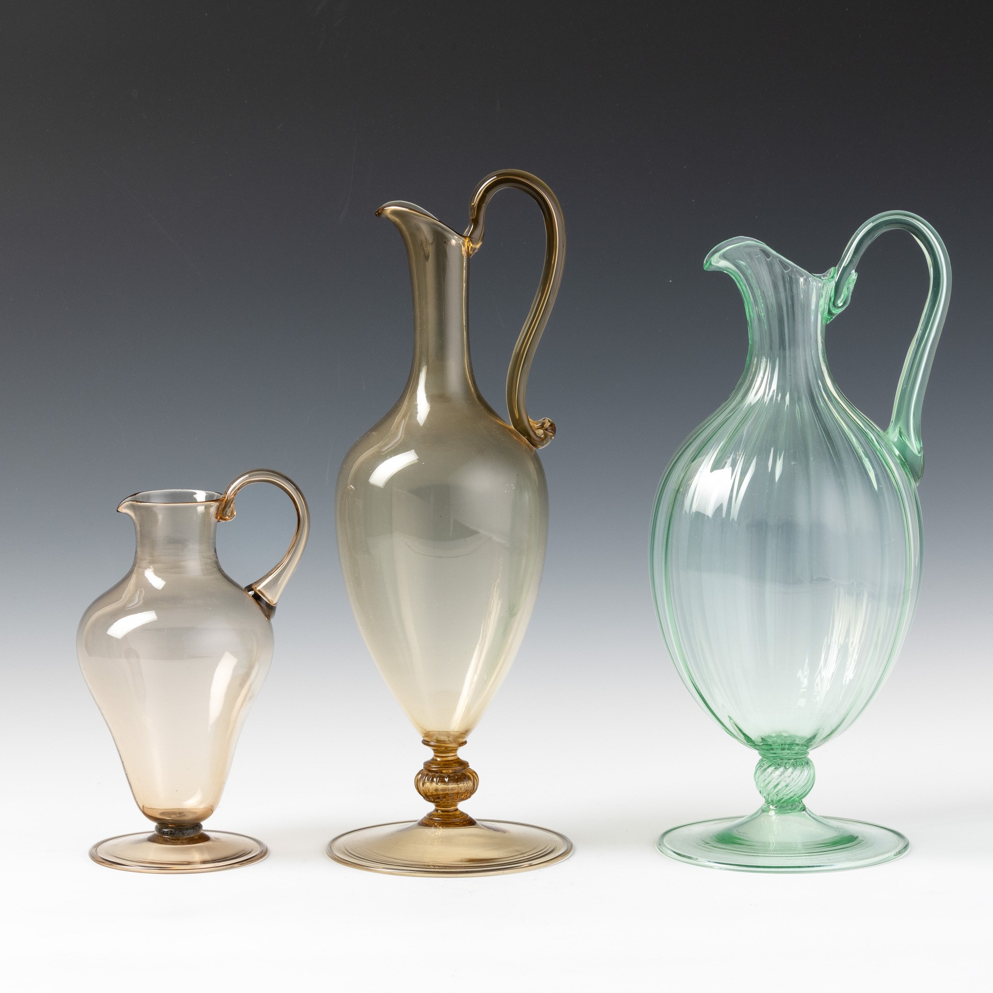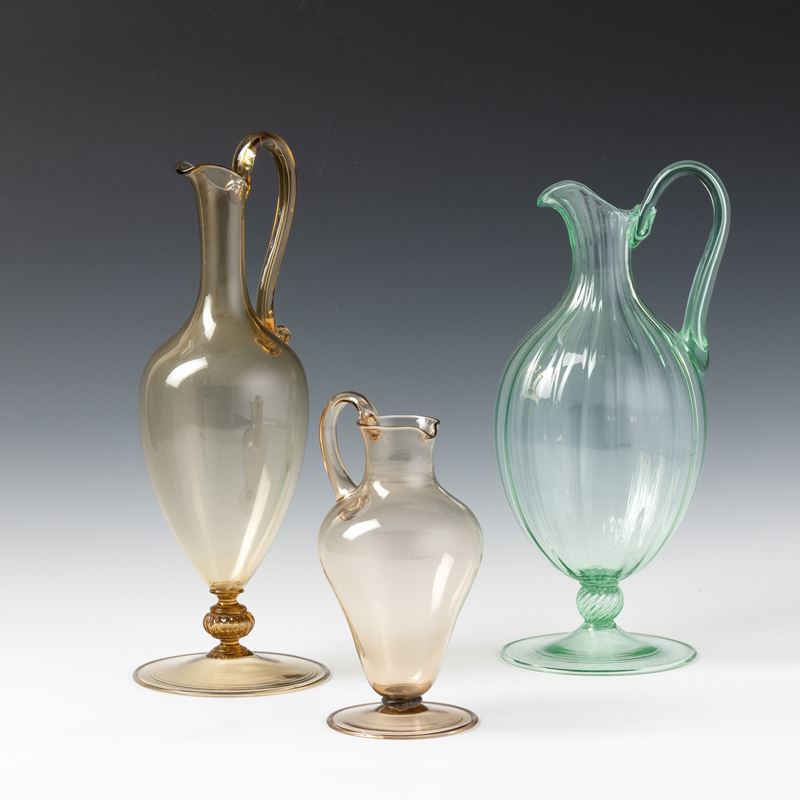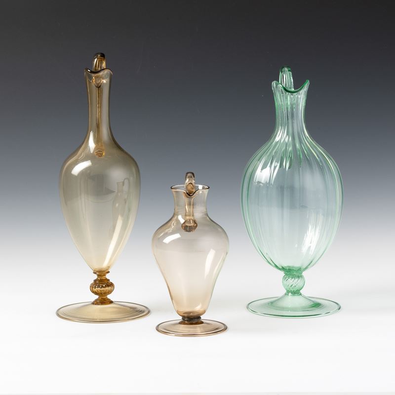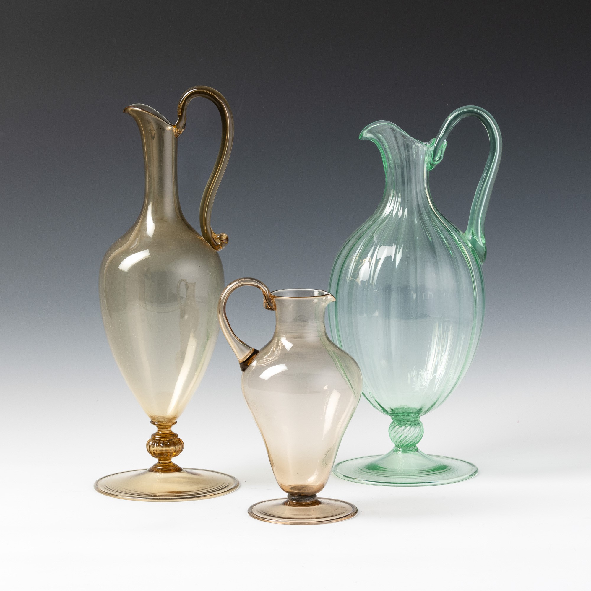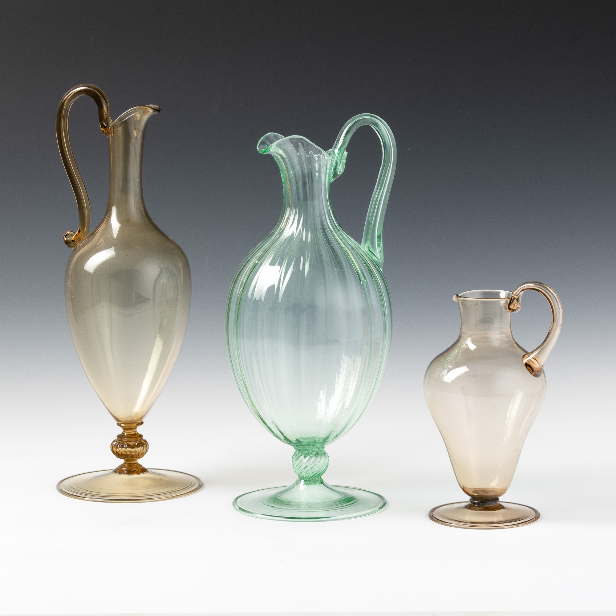 Lotto formato da tre caraffe in vetro soffiato pagliesco e verde a costolature con anse applicate.