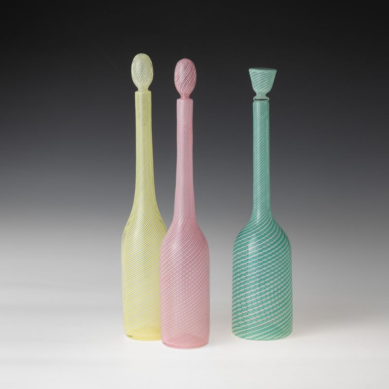 Lotto di tre bottiglie con tappi in vetro soffiato con decoro di canne policrome a spirale.
