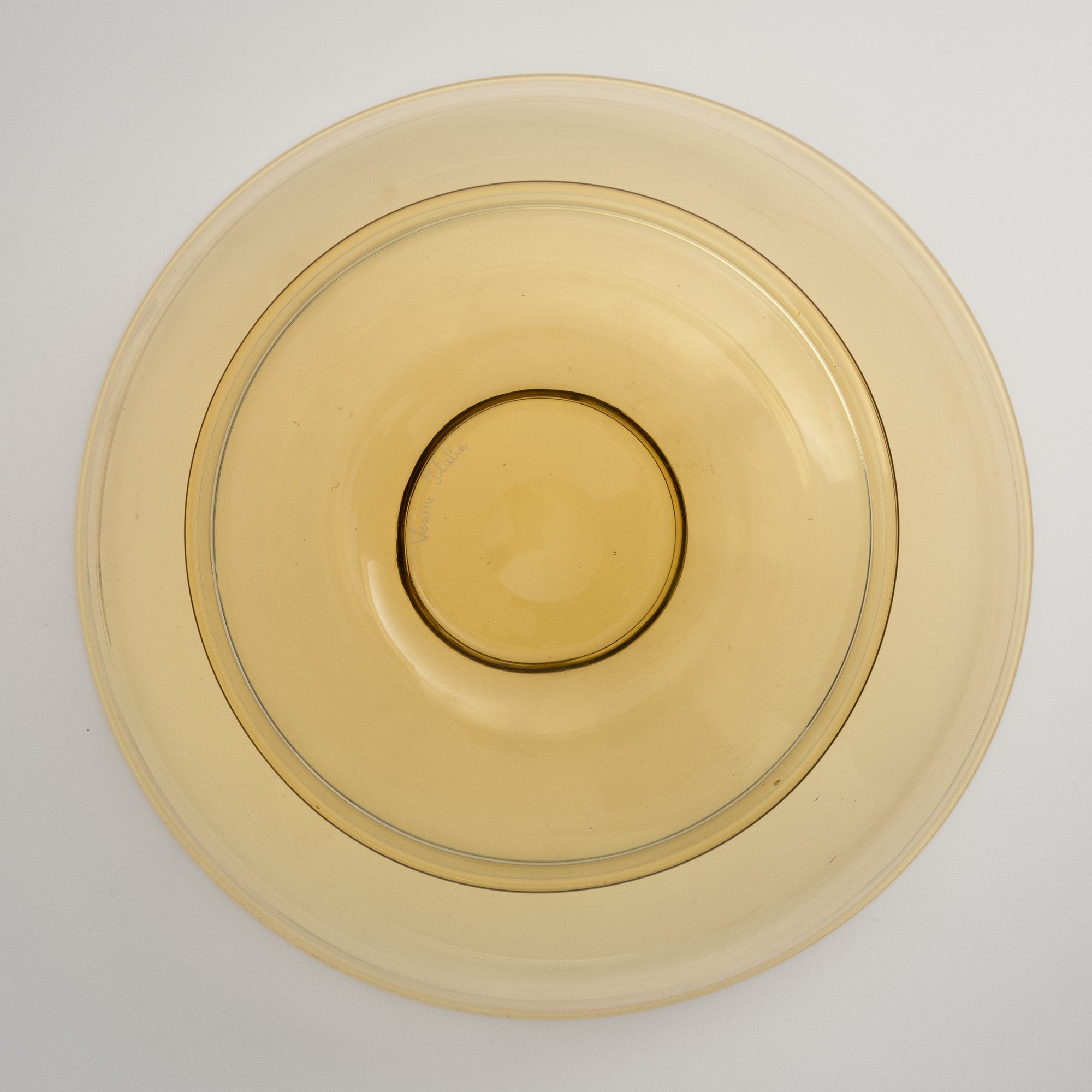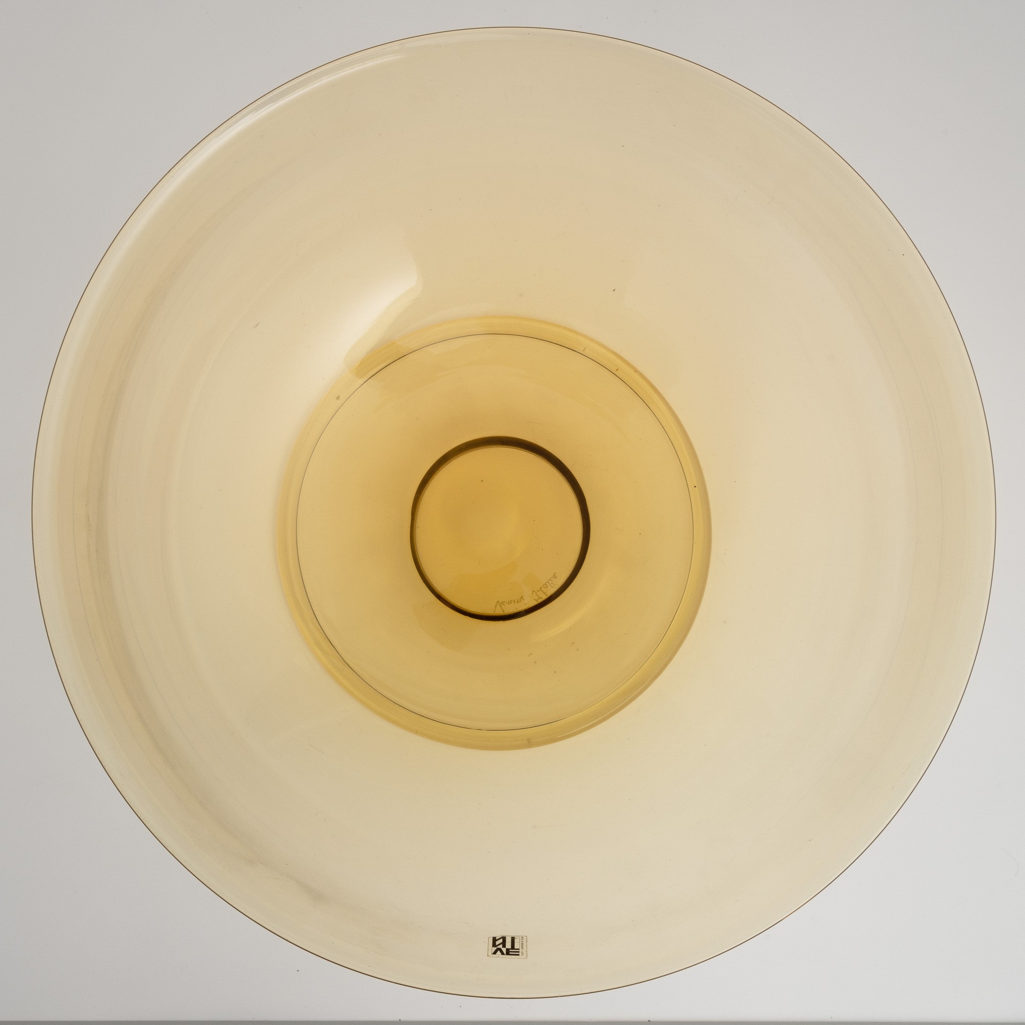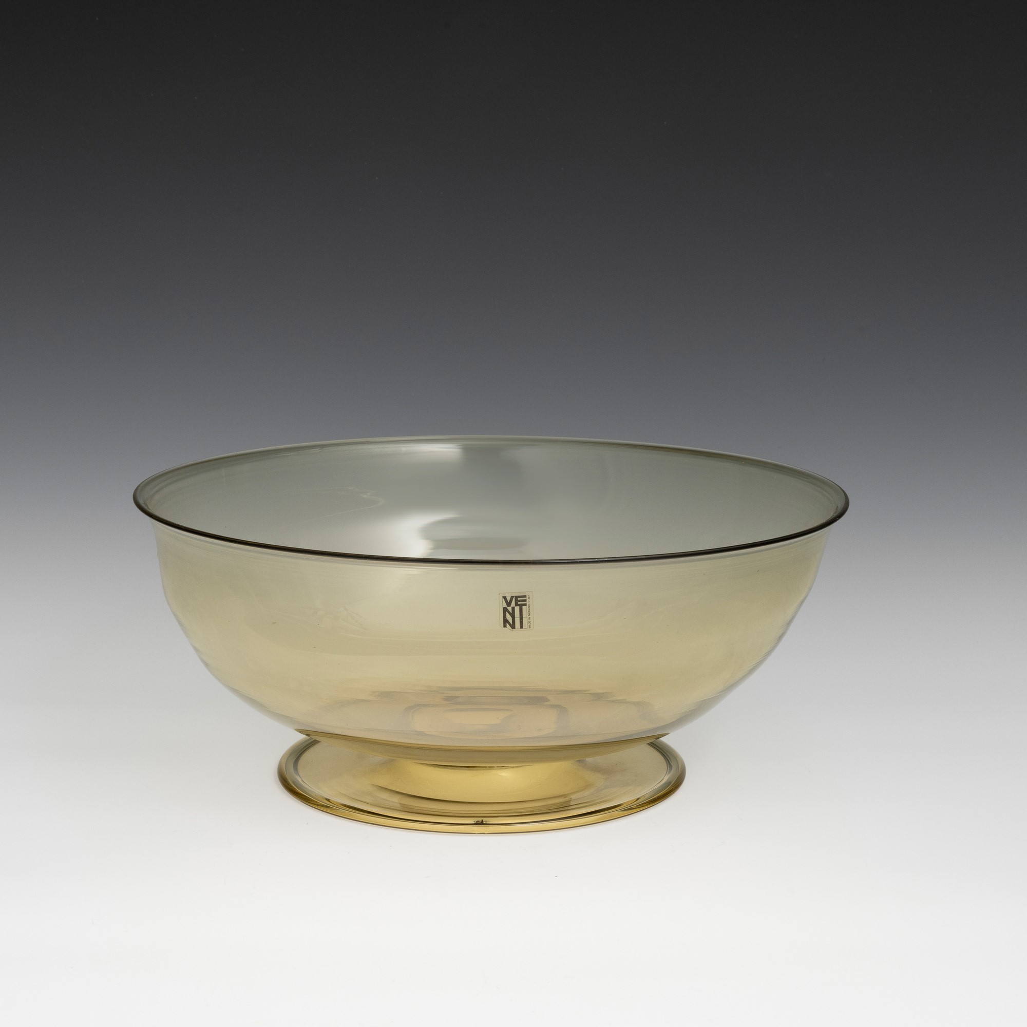 Grande coppa in vetro soffiato paglierino su piede circolare.