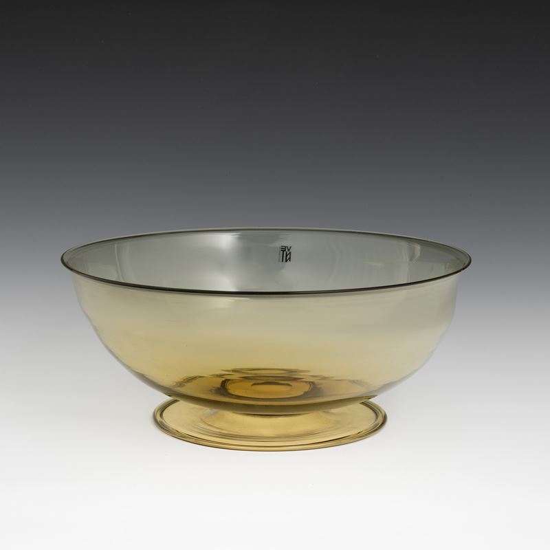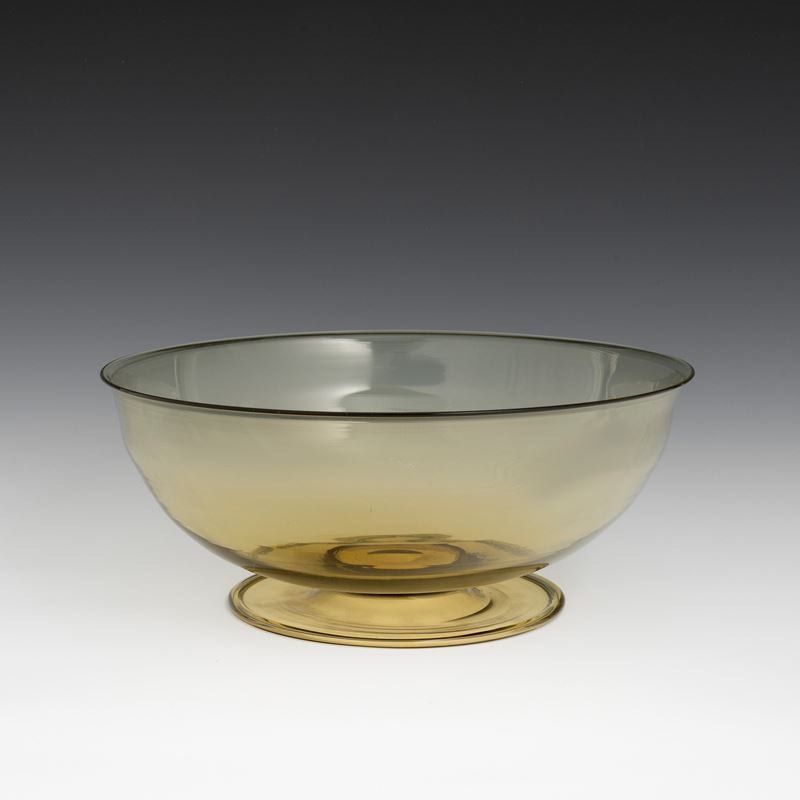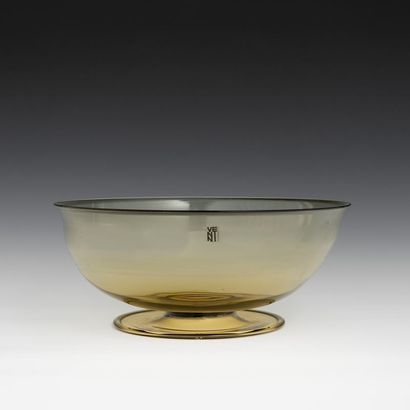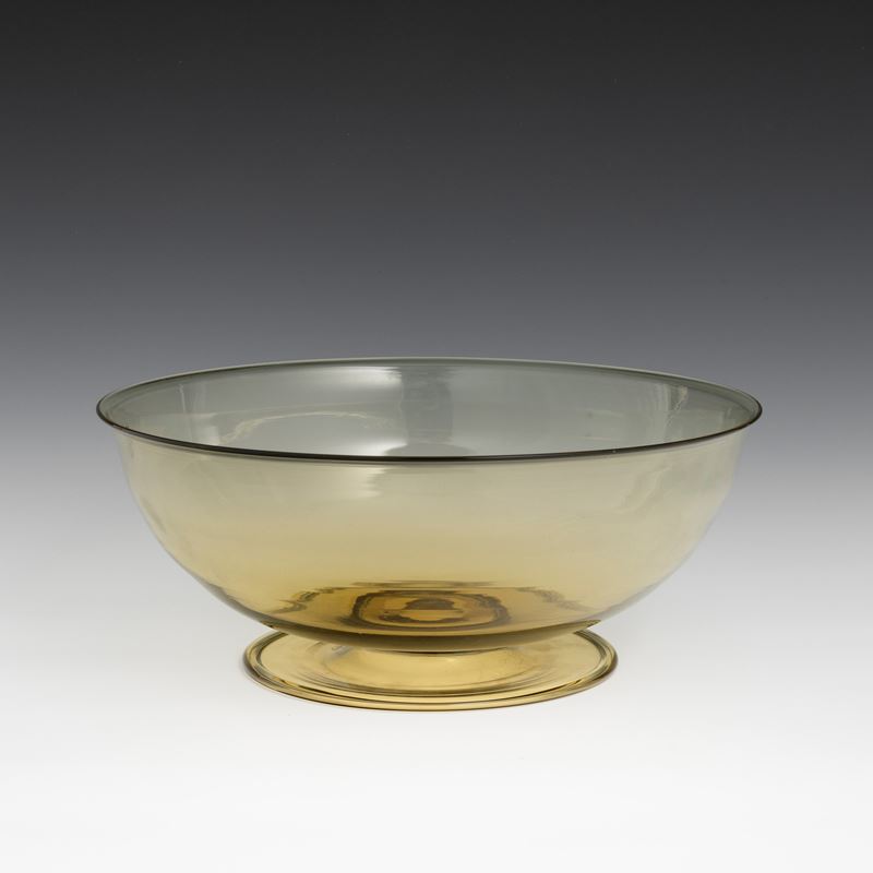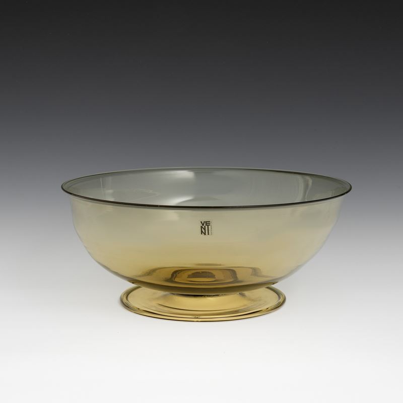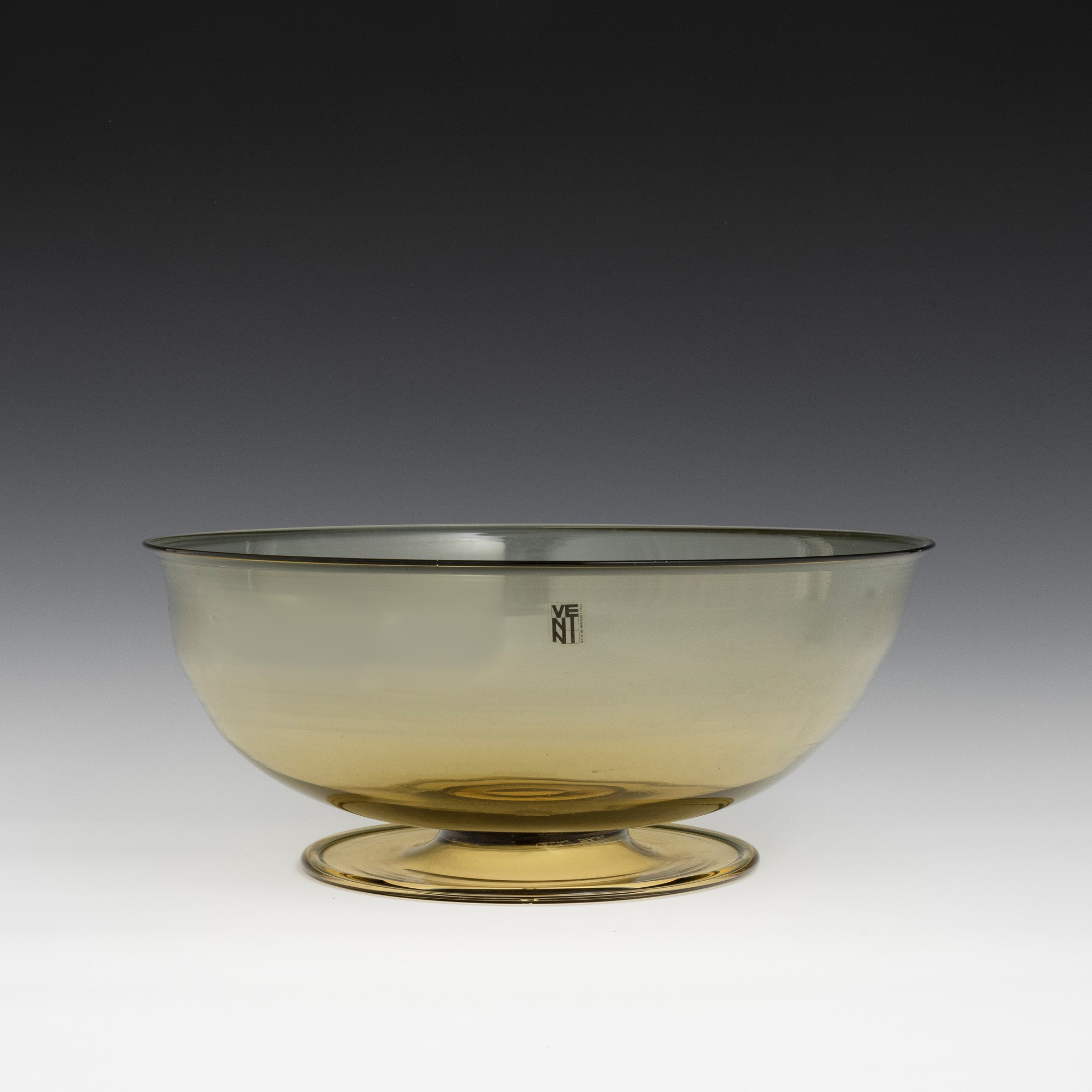 Grande coppa in vetro soffiato paglierino su piede circolare.