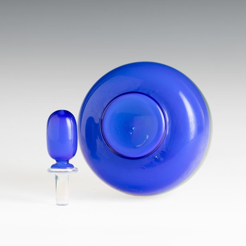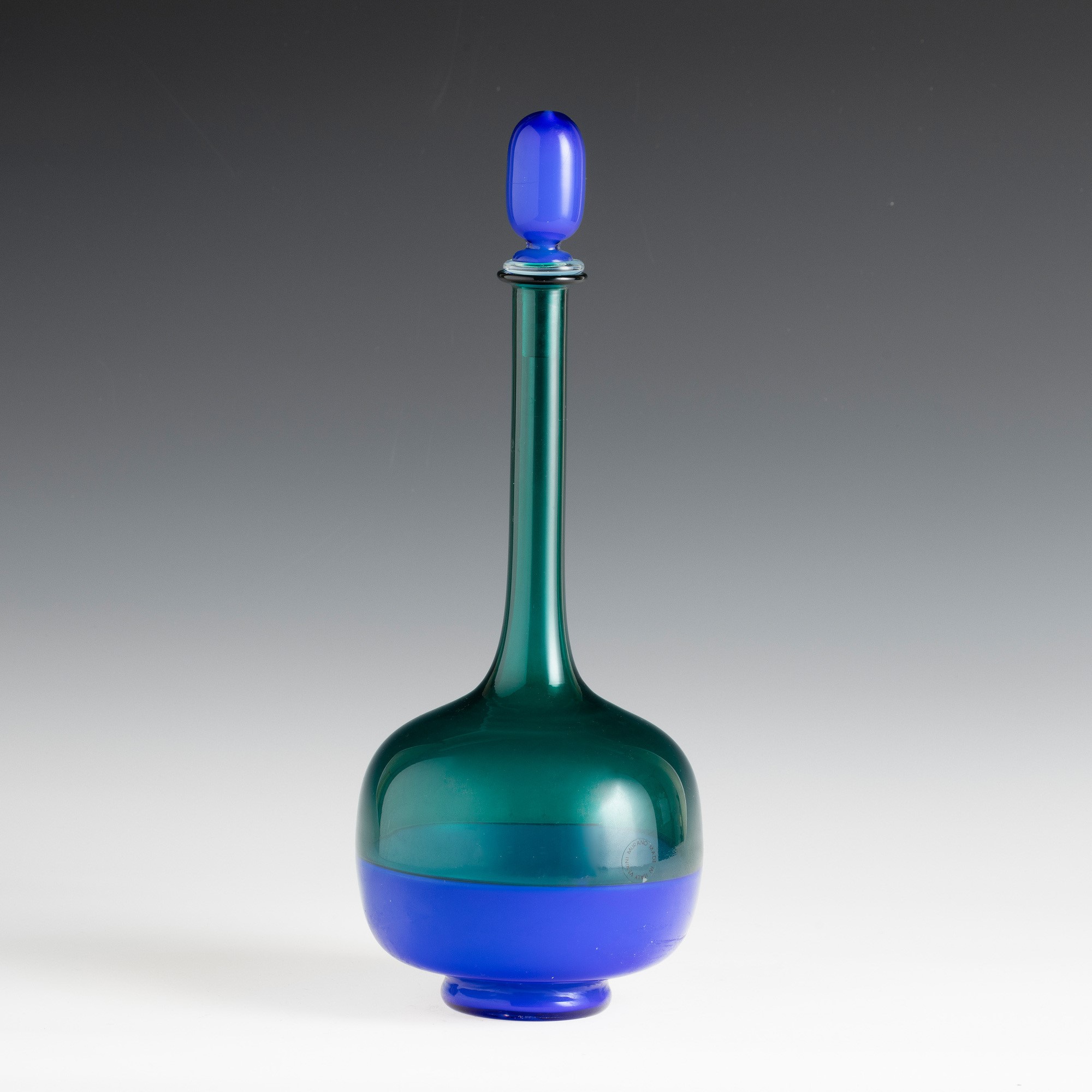 Bottiglia serie a Incalmi in vetro soffiato verde con fondo a incalmo in vetro opalino blu. Tappo in forma di oliva.