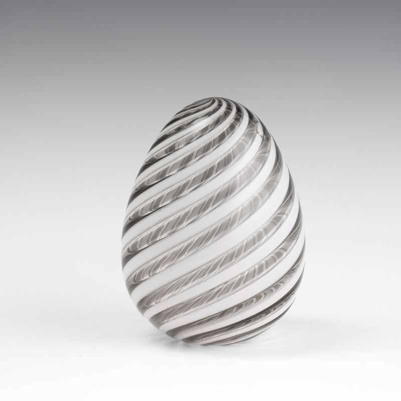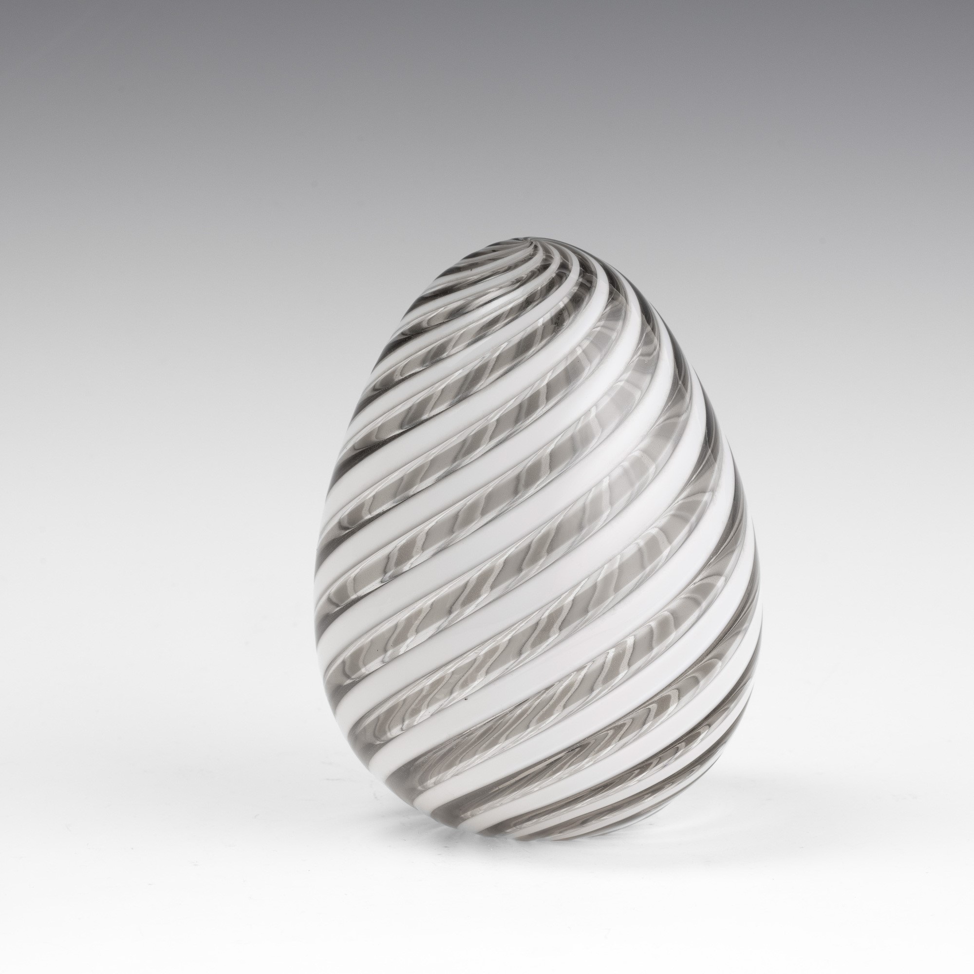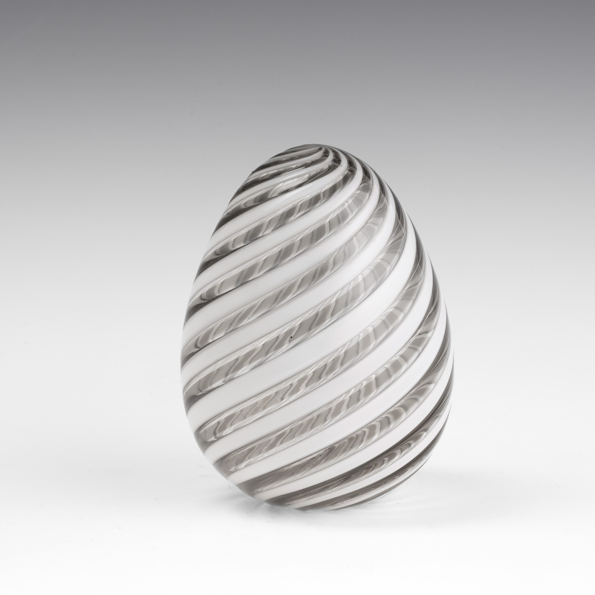 Uovo in vetro soffiato con decoro di canne policrome bicolore a spirale.