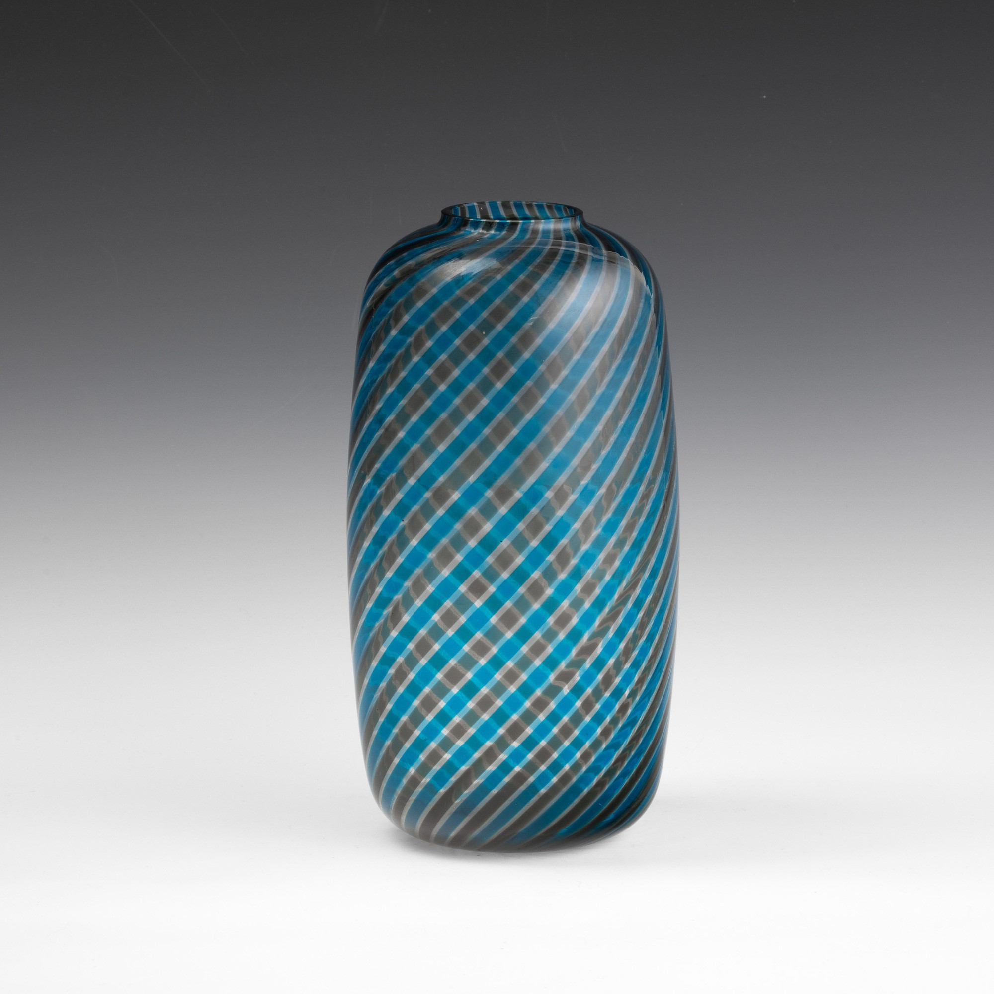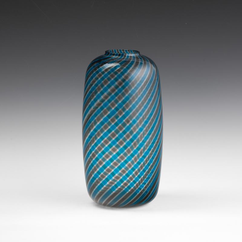 Vaso a sezione cilindrica in vetro soffiato con decoro di canne policrome a spirale.