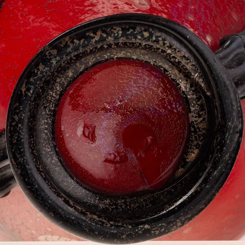 Vaso ad anfora in vetro soffiato rosso con decoro di grandi murrine ad anello. Anse applicate serpentiformi e piede circolare in pasta vitrea nera con foglia argento.
