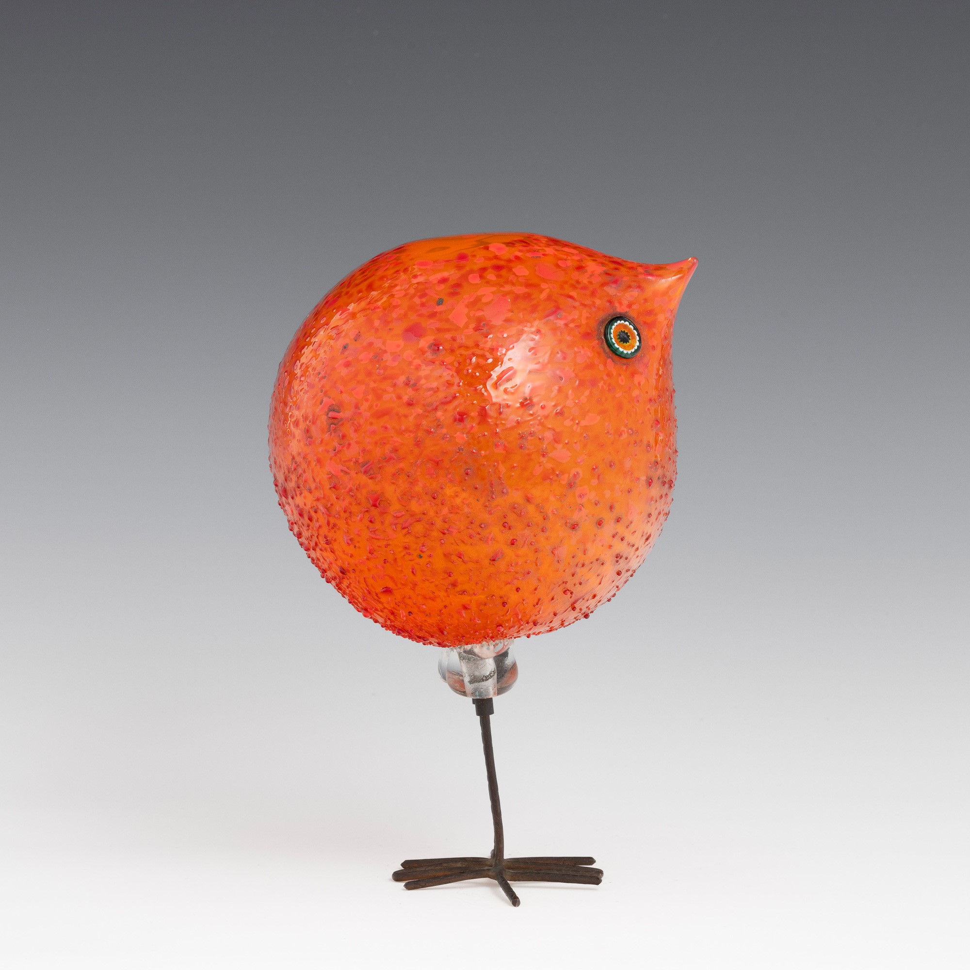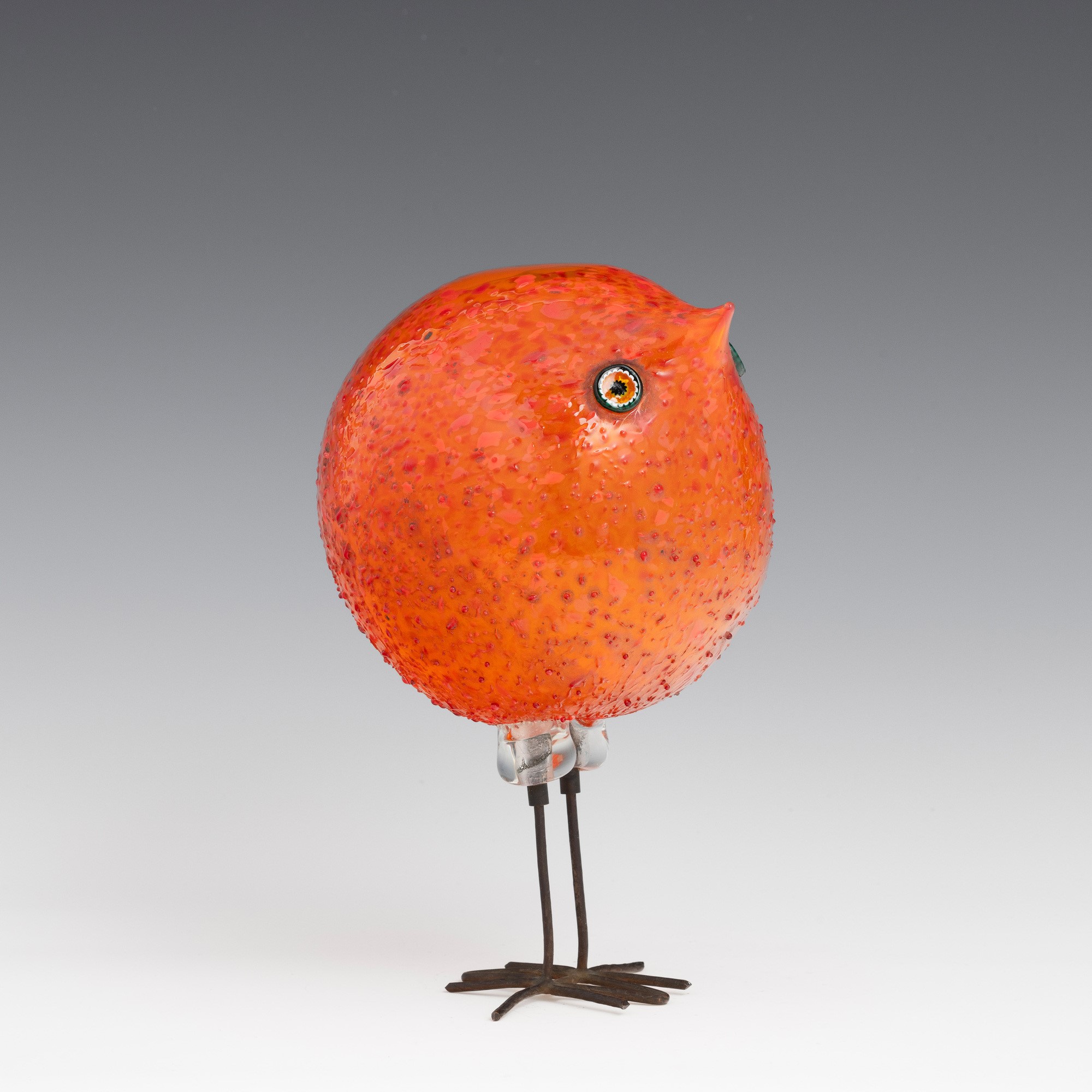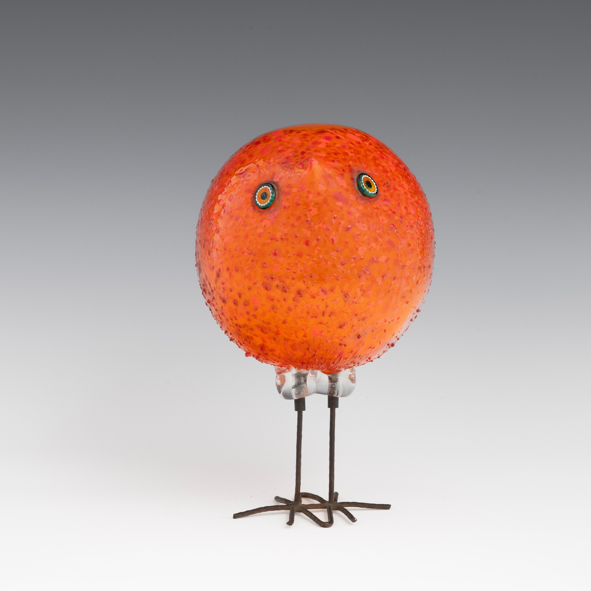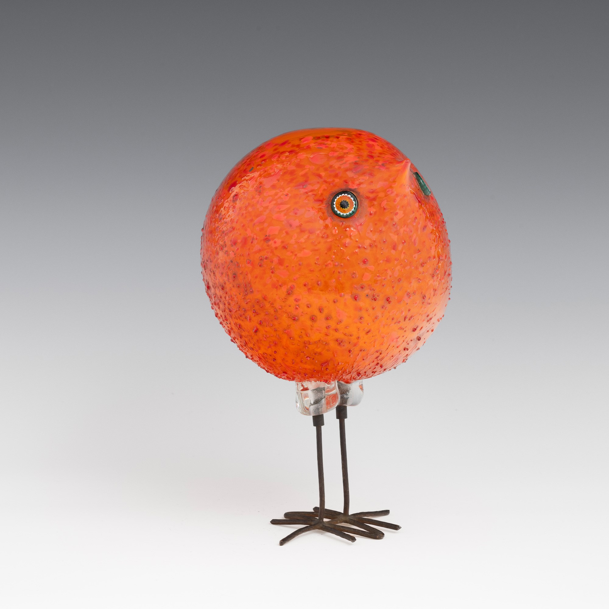 Scultura raffigurante pulcino di forma sferica in vetro soffiato con occhi applicati a murrina.