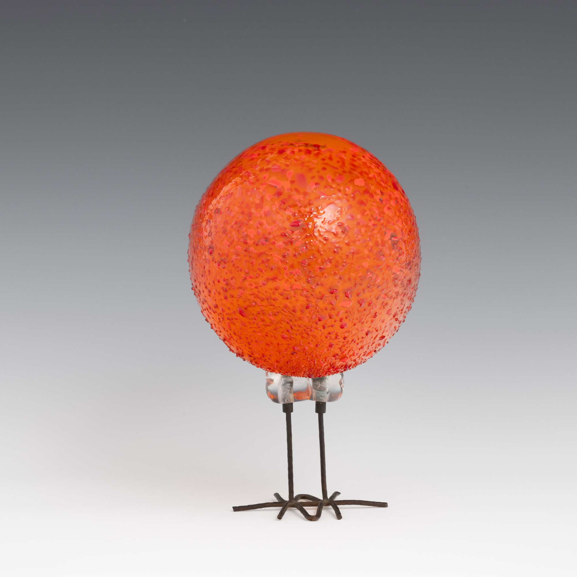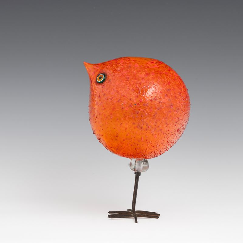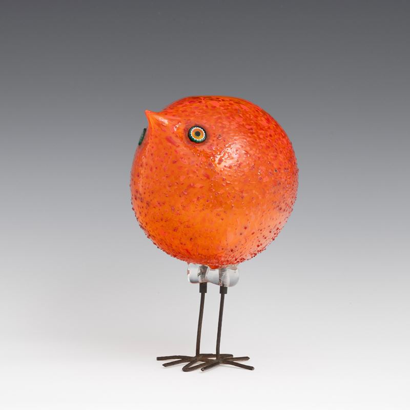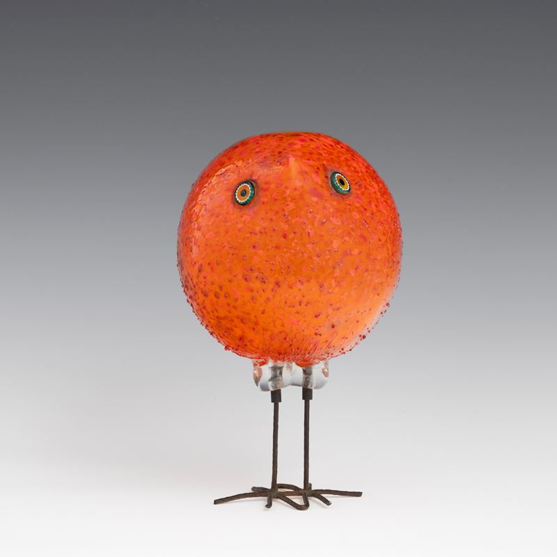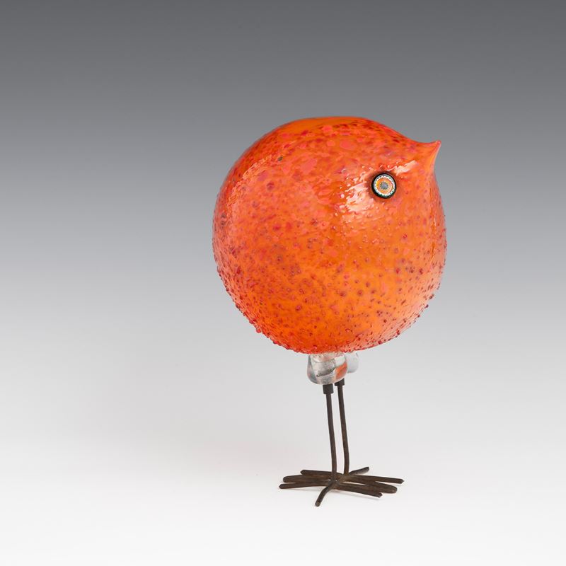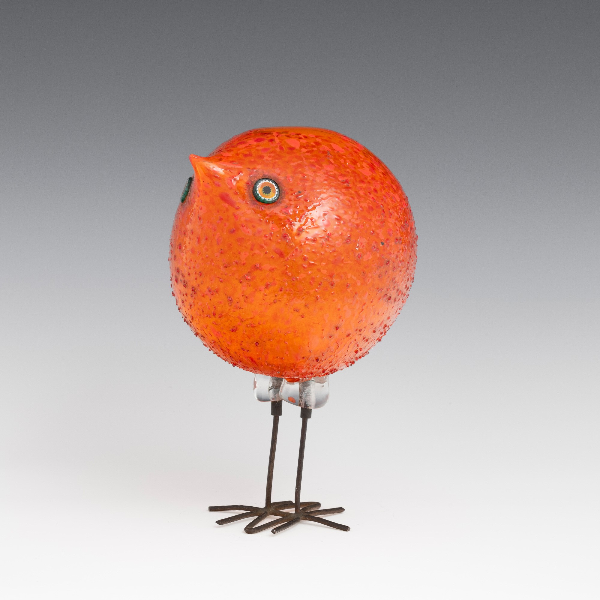 Scultura raffigurante pulcino di forma sferica in vetro soffiato con occhi applicati a murrina.