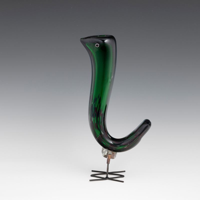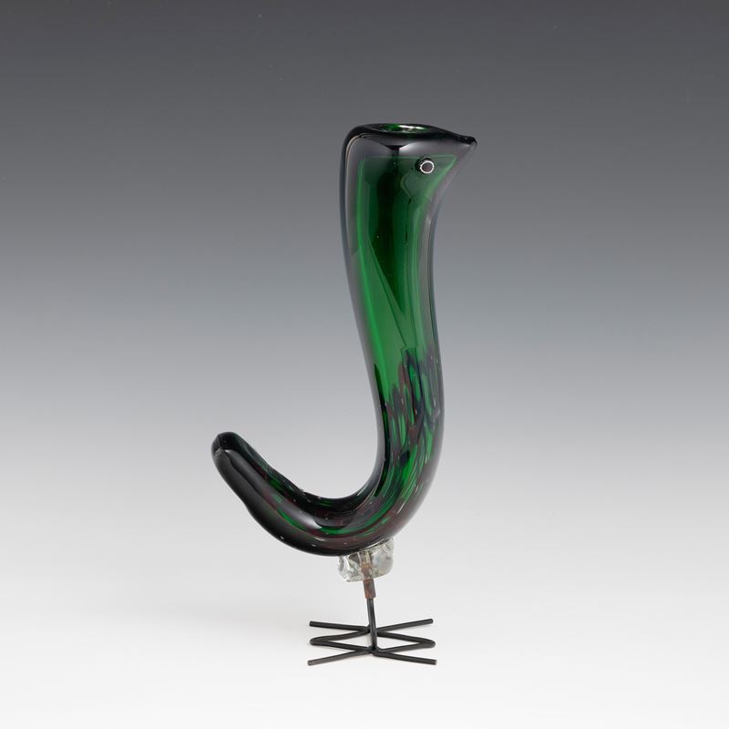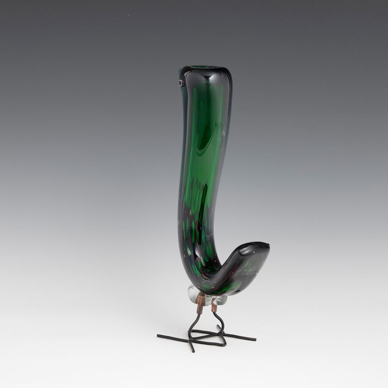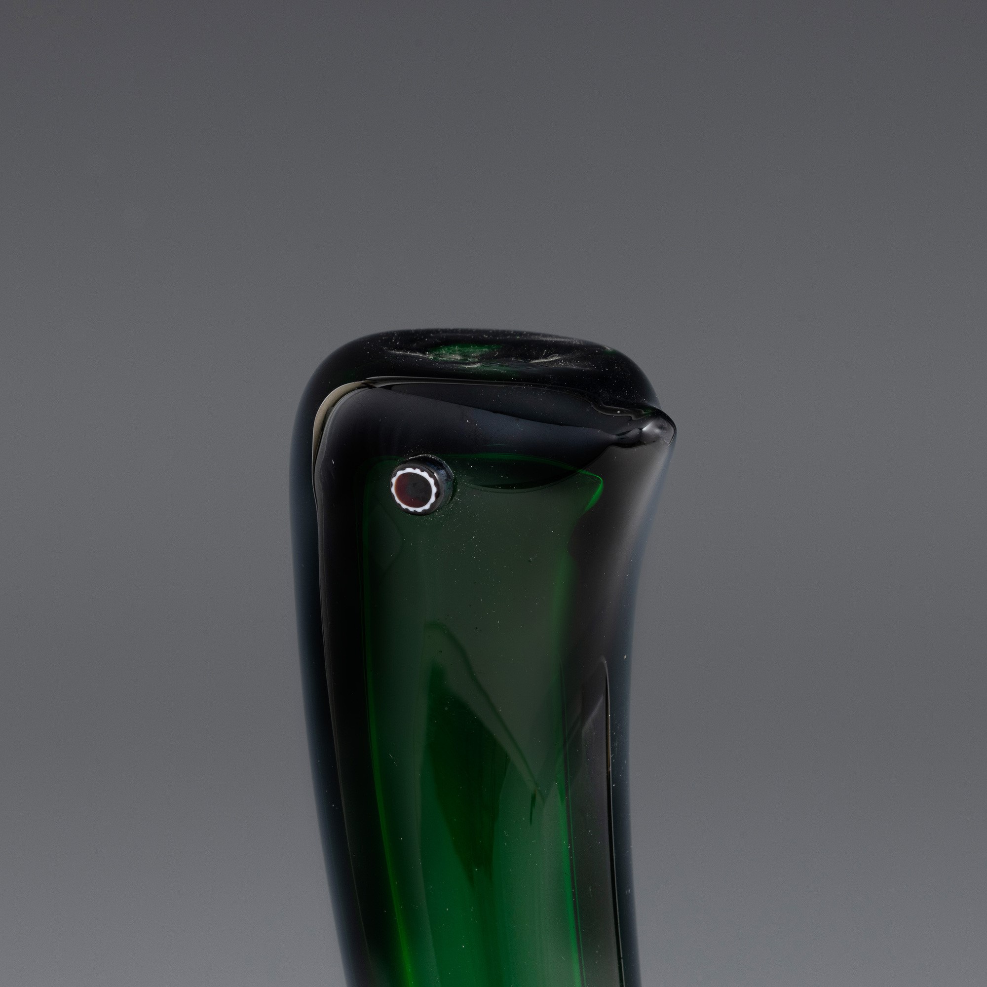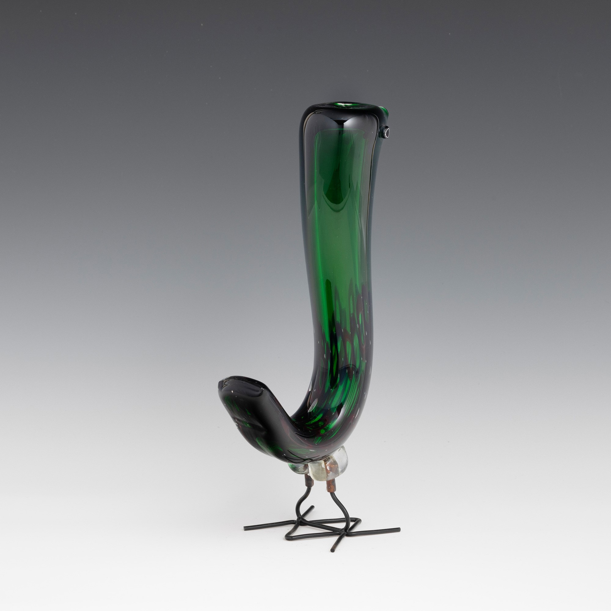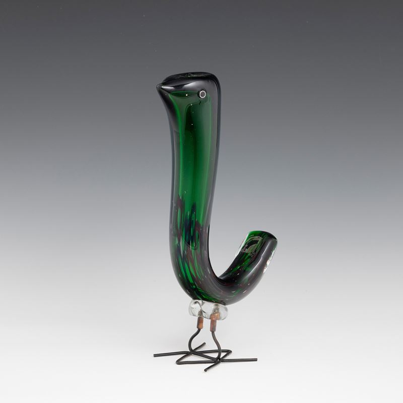 Scultura raffigurante uccellino in vetro soffiato con decoro di murrine policrome.