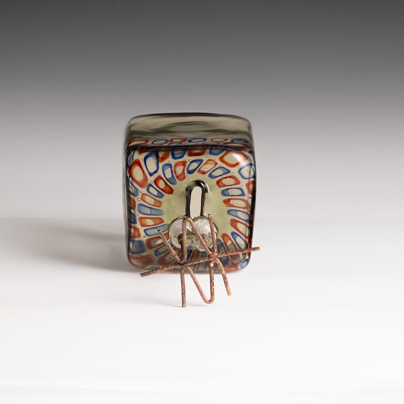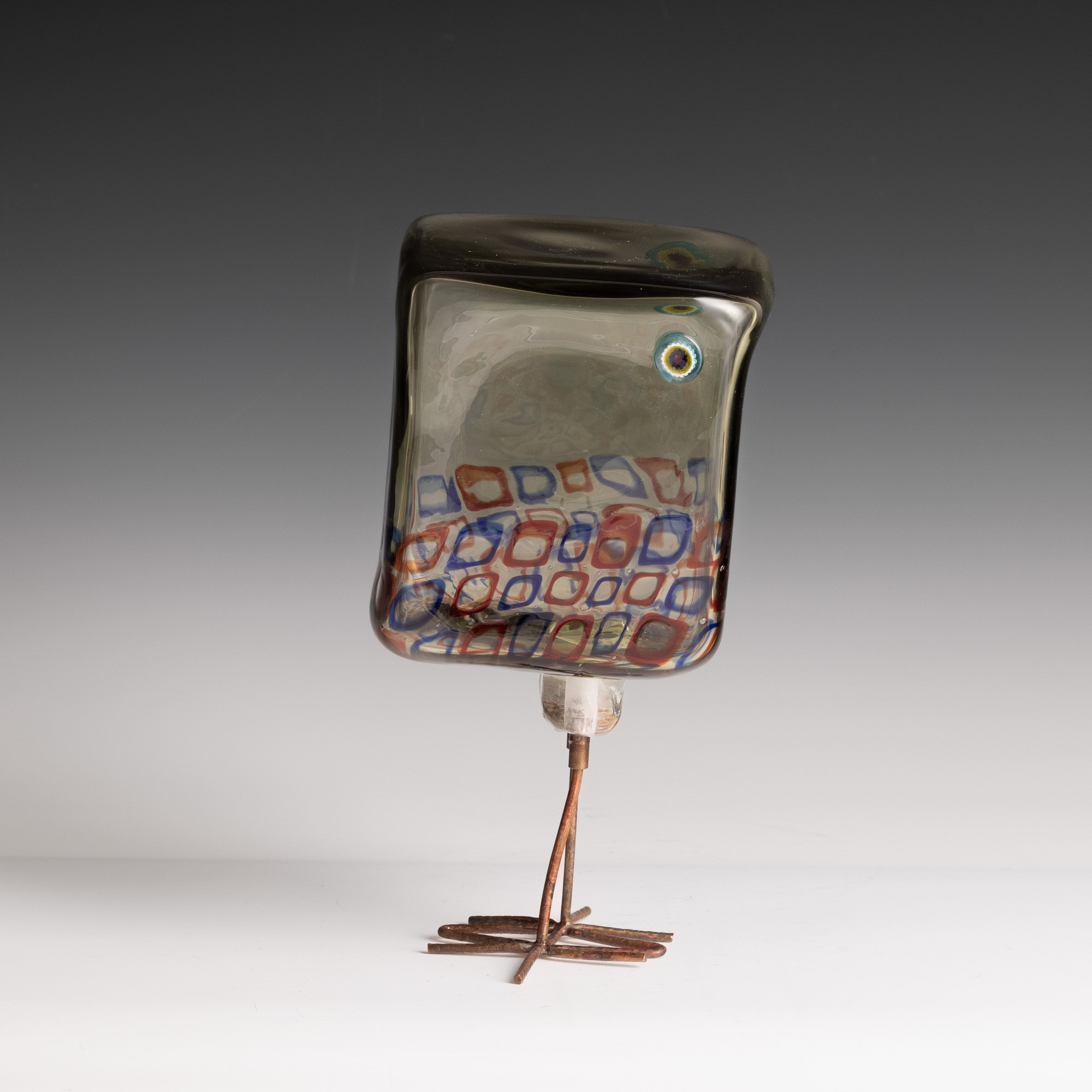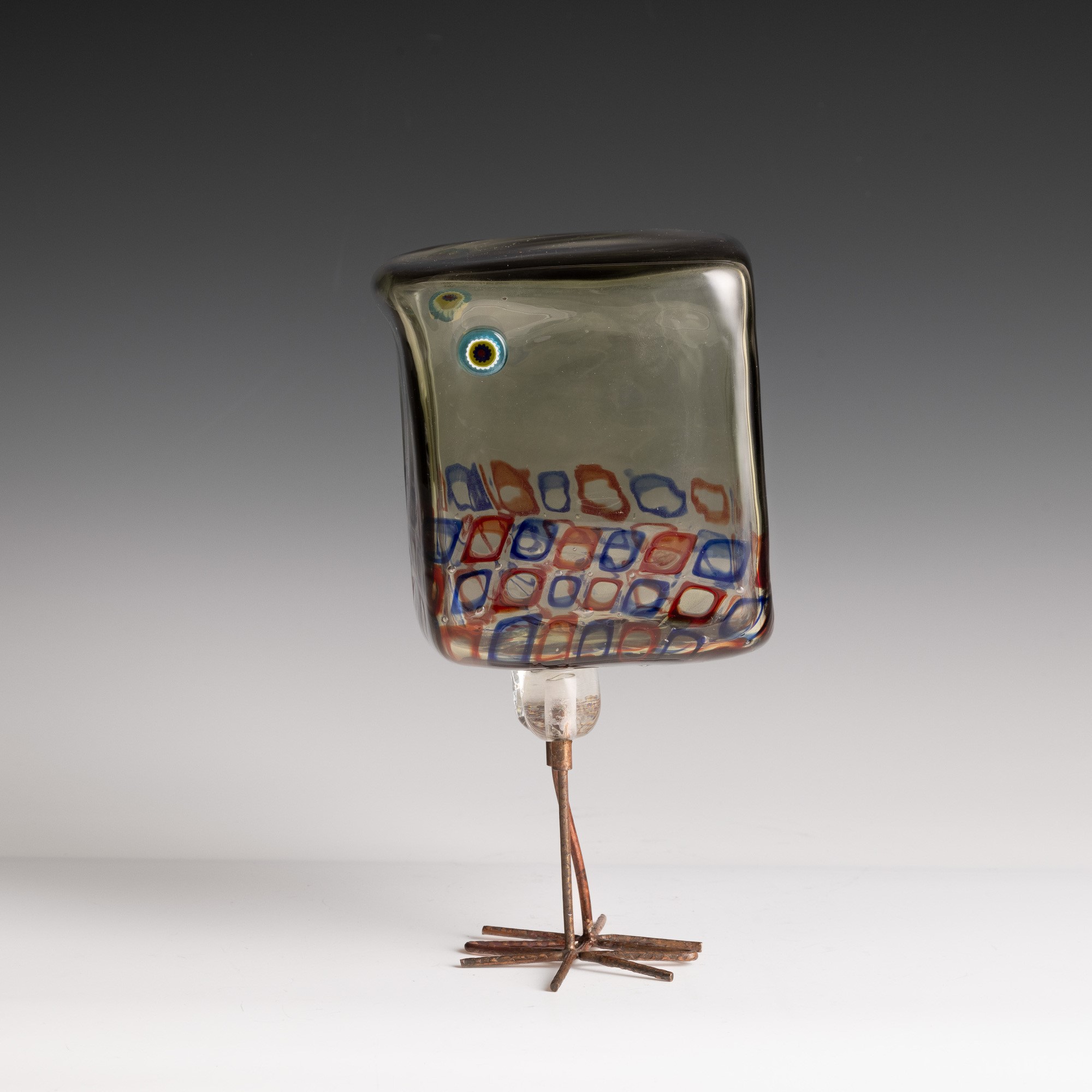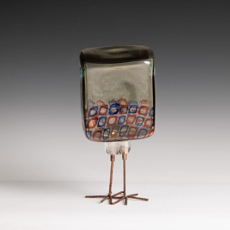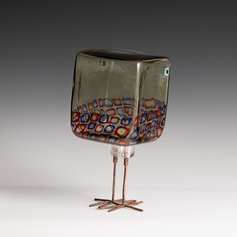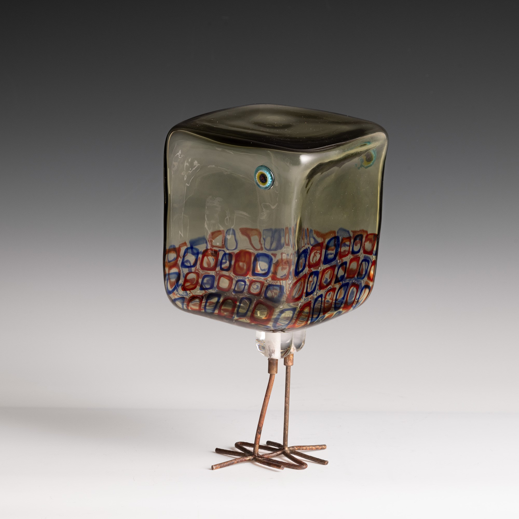 Scultura raffigurante pulcino di forma cubica in vetro soffiato con decoro di murrine policrome.