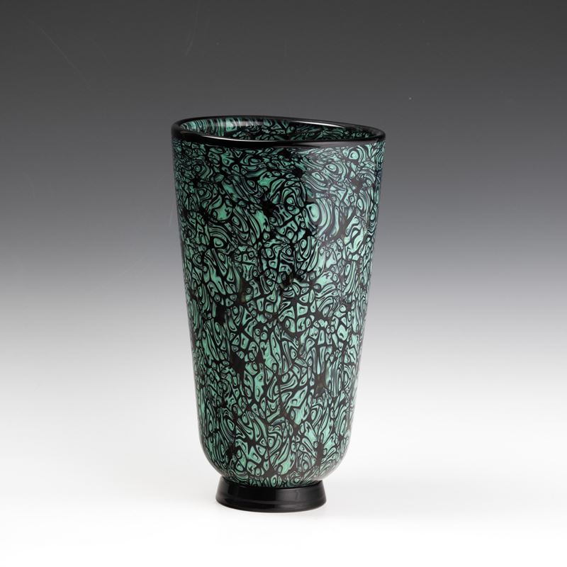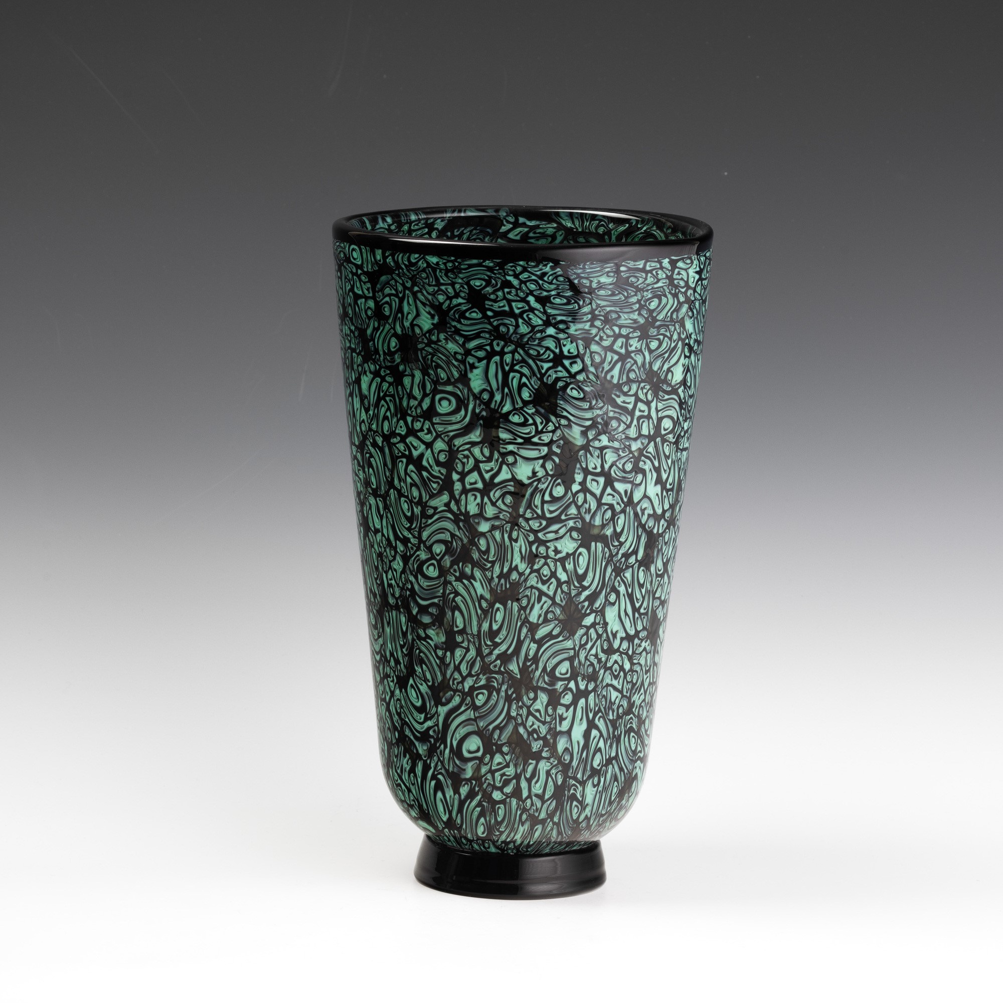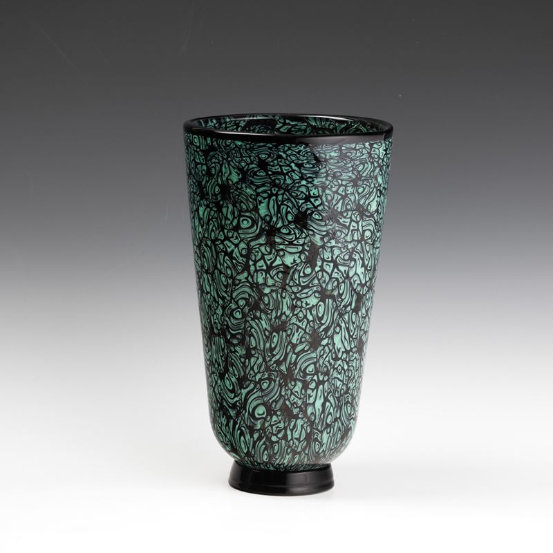Vaso troncoconico serie Mosaico in vetro sommerso con decoro di murrine verdi. Piede circolare applicato.