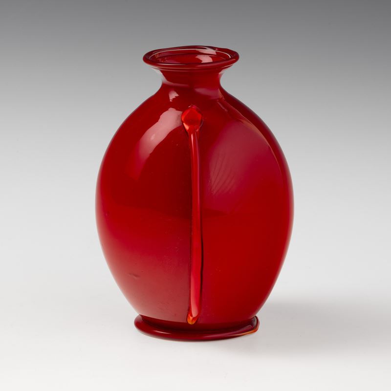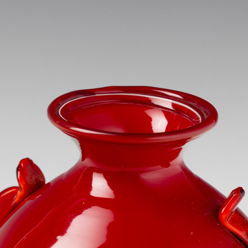 Vaso a uovo in vetro incamiciato rosso con anse a foglia applicate in pasta vitrea corallo.