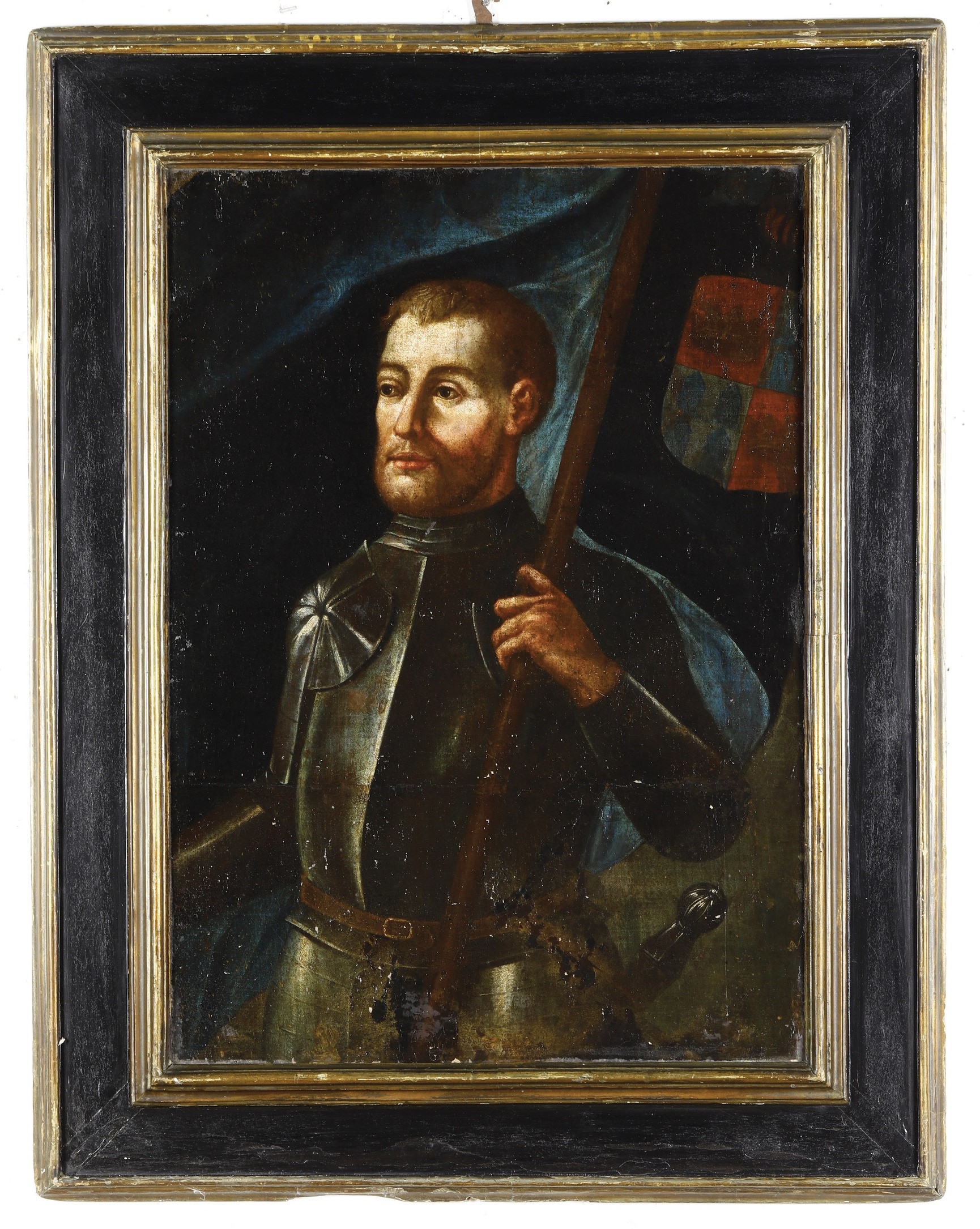 Scuola del XVI secolo Ritratto di gentiluomo in armatura con stendardo
