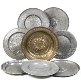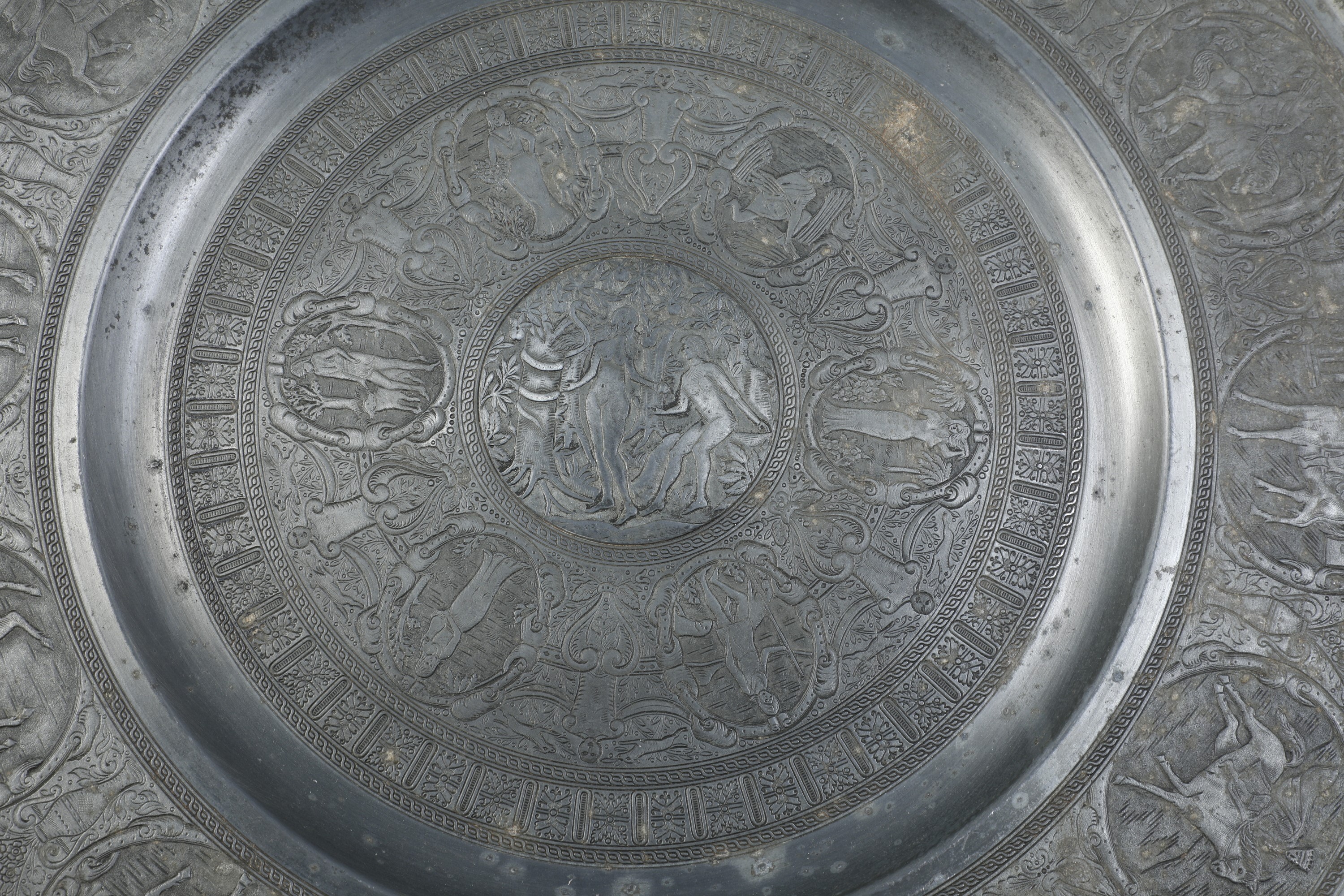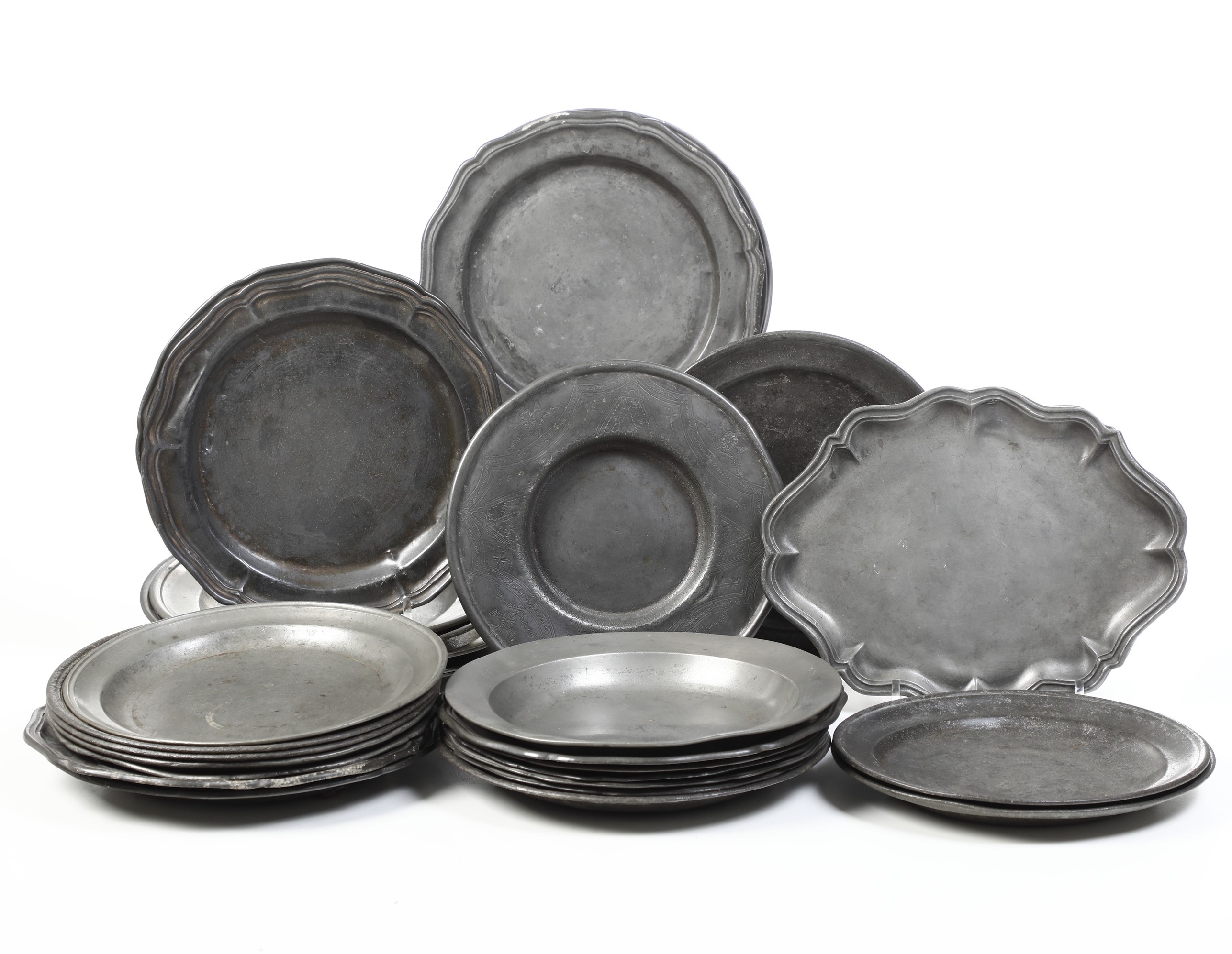 Gruppo di trentasei piatti in peltro e un elemosiniere