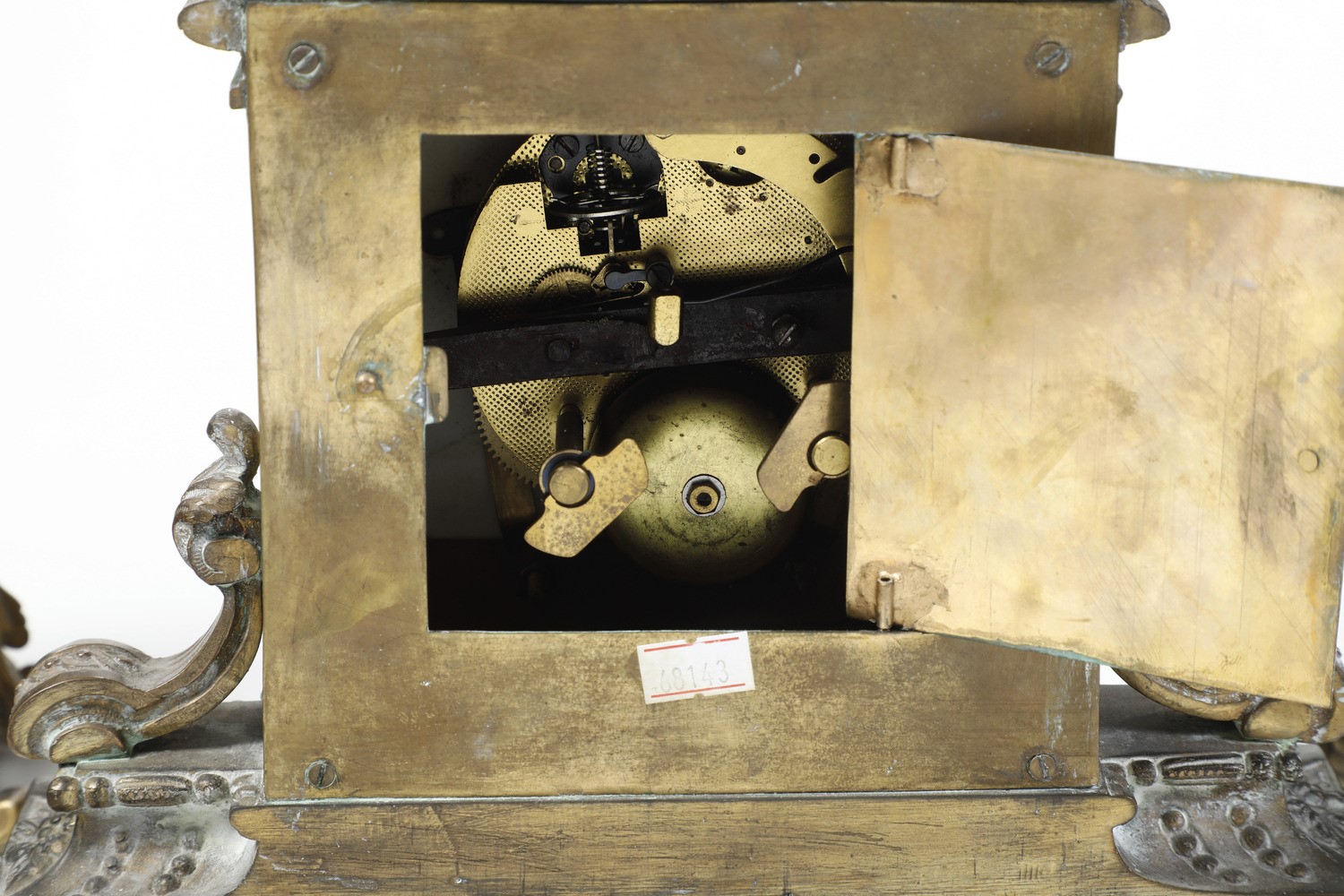 Trittico composto da pendola da tavolo e coppia di candelabri. Francia XX secolo