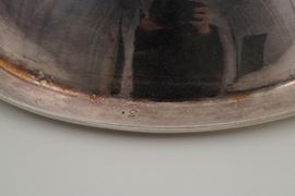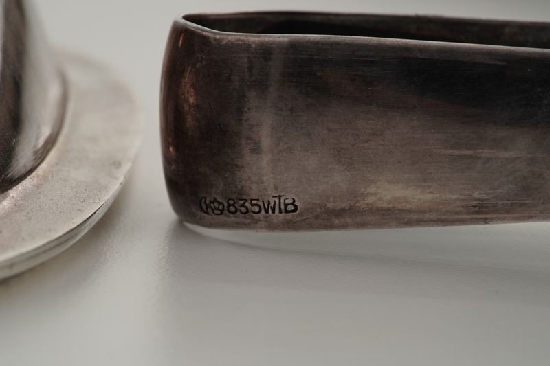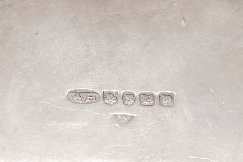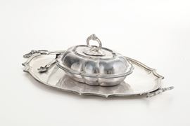 Un vassoio, una legumiera e una pinza in metallo argentato