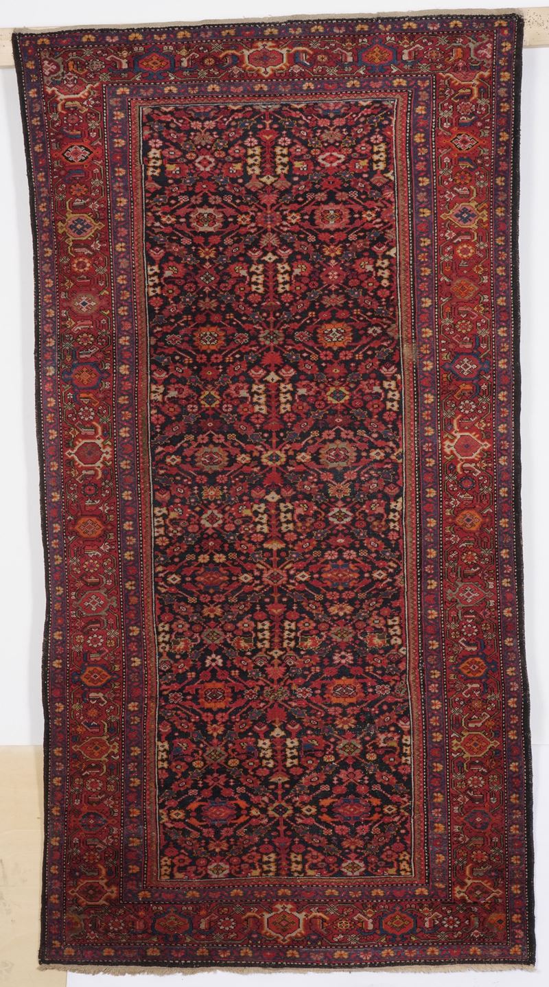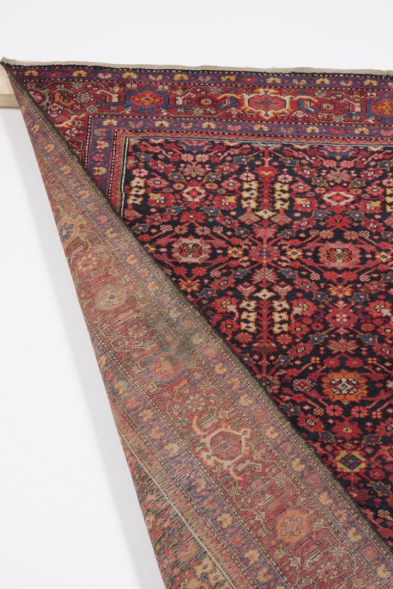 campo marrone scuro con decoro herati ampia bordura rossa a tartaruga