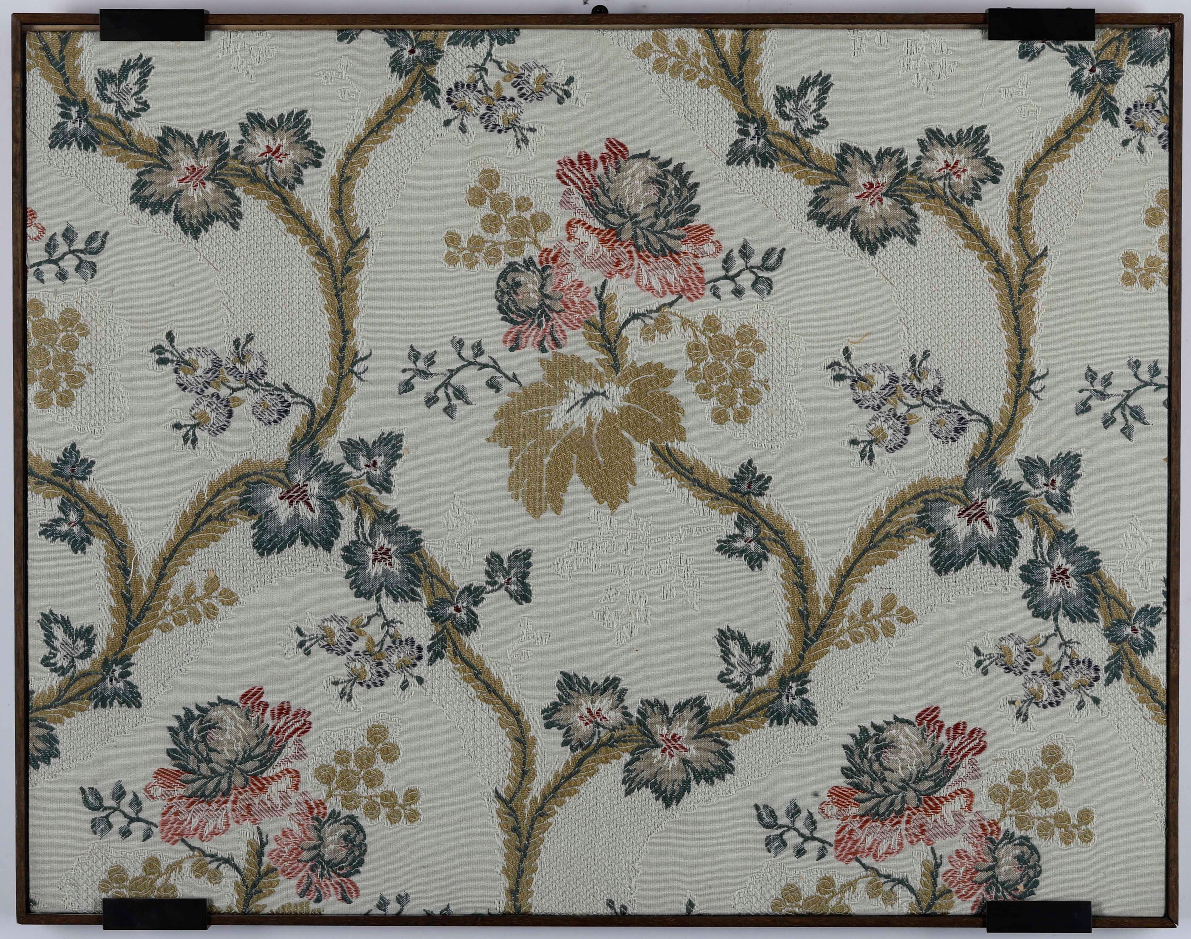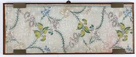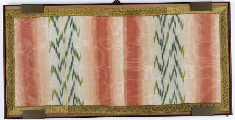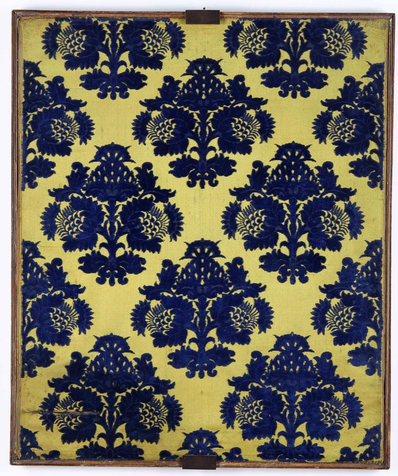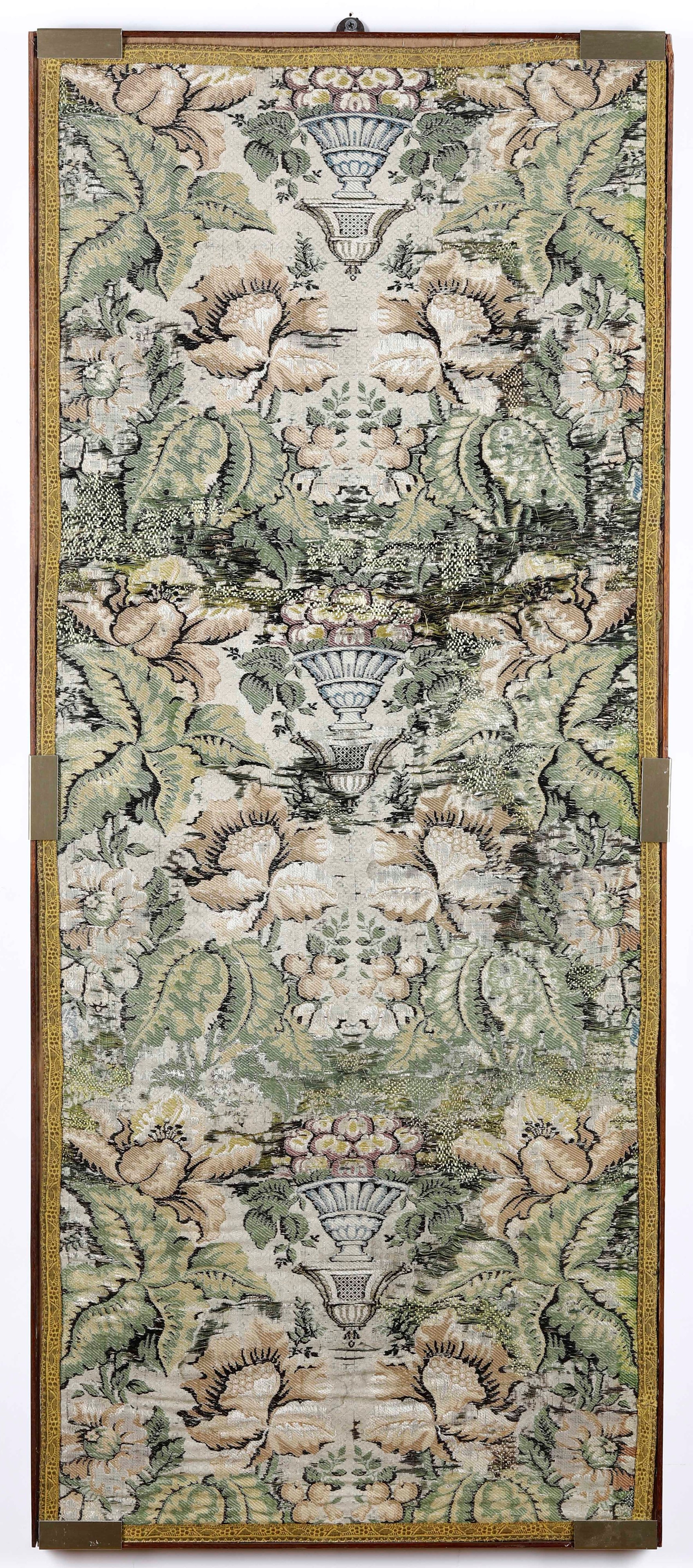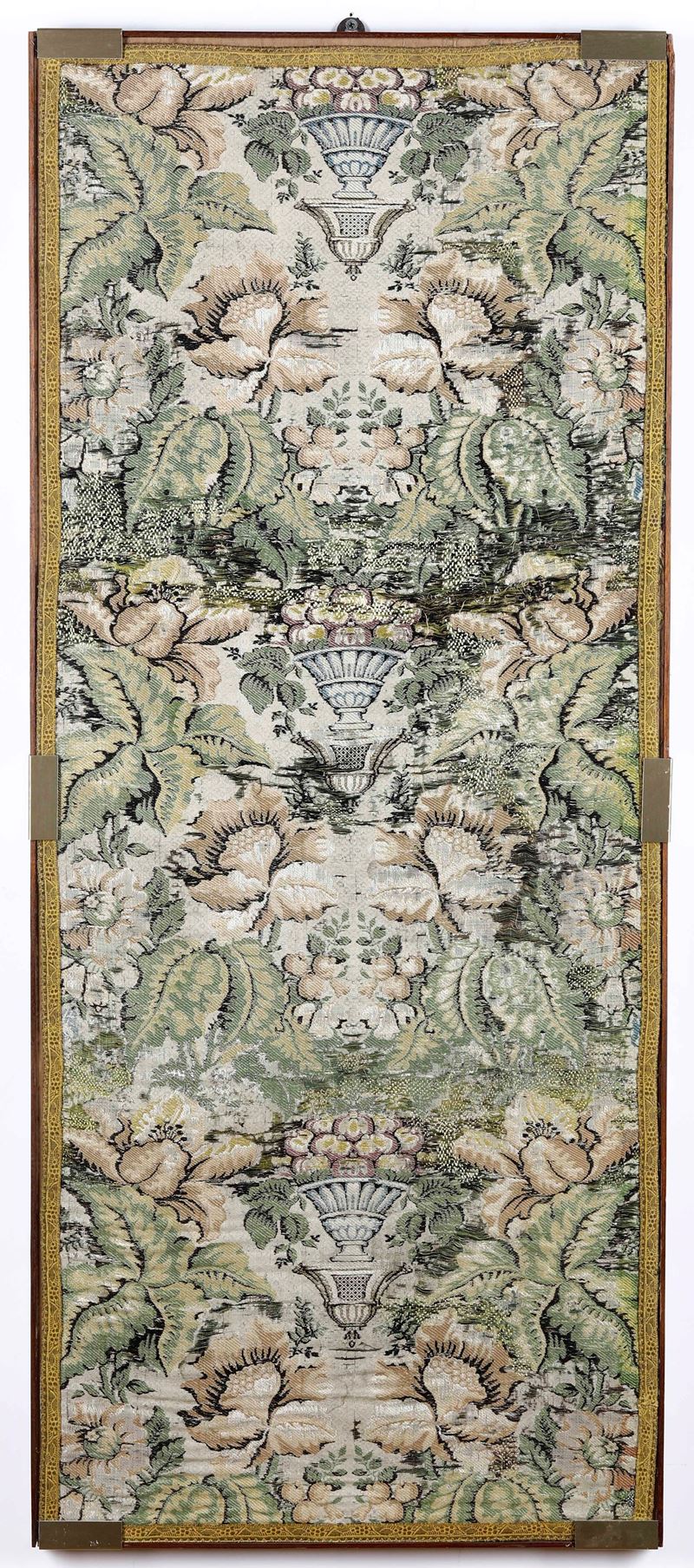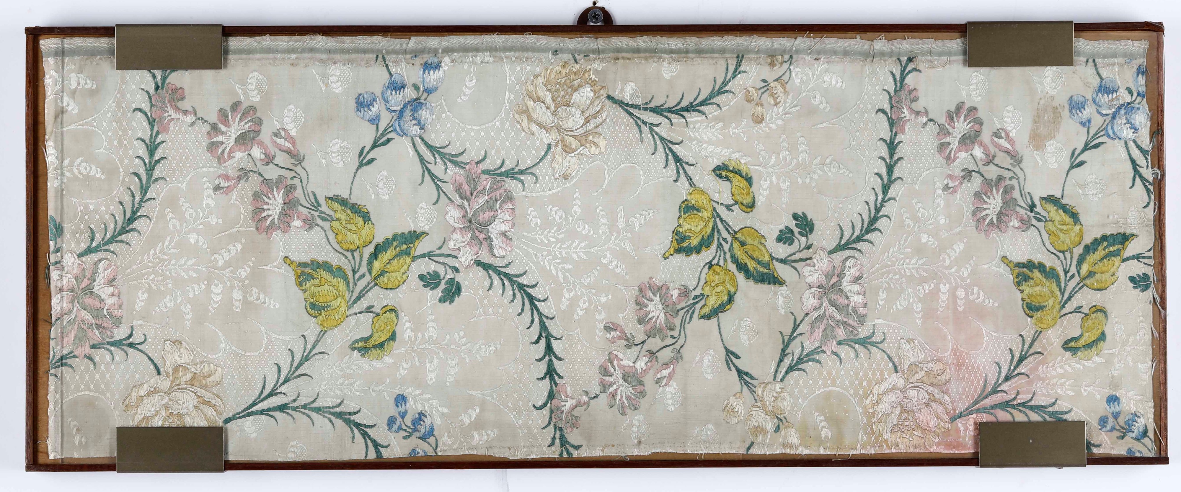 uno in lampasso di seta bianco cm 55x43, uno in broccaton di seta con decoro di vasi e fiori cm 129x54, velluto di seta giallo con decoro floreale in velluto blu cm 72x61, uno in seta fiammata cm 73x36, uno in damasco di seta chiaro cm 75x28